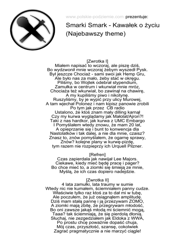 www.polskie-podziemie.com prezentuje: Smarki Smark - Kawałek o życiu (Najebawszy theme) [Zwrotka I] Miałem napisać to wczoraj, ale piszę dziś, Bo wydzwonił mnie wczoraj żebym wyszedł Pysk. Był jeszcze Chociaż - sami swoi jak Hemp Gru, Ale było nas za mało, żeby stać w okręgu. Piliśmy, bo Wojtek odebrał stypendium, Zamułka w centrum i wkurwiał mnie mróz, Chociaża też wkurwiał, bo zawinął na chawirę, A my kupiliśmy piwo i nikotynę. Ruszyliśmy, by je wypić przy ulicy Murowej, A tam wjechał Polonez i nam kipisz panowie zrobili Po tym jak przez CB radio Ustalono, że ktoś znam mały dilling karnął Czy my kurwa wyglądamy jak Małolat/Ajron?! Taki z nas hardkor, jak kurwa z UMC Embargo I Pomyślałem wtedy znowu, że mam 20 lat, A opieprzanie się i bunt to konwencja dla Nastolatków i tak dalej, a nie dla mnie, czaisz? Znasz to, znów pomyślałem, że ogarnę sprawy, Znów? kolejne plany w kurwę-pizdę, tym razem nie rozpieprzy ich Urquell Pilzner. [Refren] Czas zapierdala jak nawijał Lee Majors. Ciekawe, kiedy mieć będę pracę i pager? Bo chce mieć to, a ziomki się śmieją ze mnie, Myślą, że ich czas dopiero nadejdzie. [Zwrotka II] 4 lata zamułki, lata traumy w sumie Wtedy nic nie kumałem, ściemniałem panny cudze. Właściwie tylko raz ktoś za to dał mi w tubę, Ale poczułem, że już osiągnąłem amplitudę. Dziś mam stałą pannę i ją przezywam ZOMO, A ziomki mają zbitę, że przegrywam młodość, Bo oni zawsze jakąś młodą mi ściemnić mogą, Taaa? tak ściemniają, że się pierdolą dłonią. Słuchaj, nie zezgedziałem jak Eldoka z WWA, Po prostu chcę poważnie dopaść chuja, Mój czas, przyszłość, szansę, cokolwiek Zagrać pragmatycznie a nie marzyć ciągle! [Refren] Czas zapierdala jak nawijał Lee Majors. Ciekawe, kiedy mieć będę pracę i pager? Bo chce mieć to, a ziomki się śmieją ze mnie, Myślą, że ich czas dopiero nadejdzie. [Zwrotka III] Trzymaj się mocno, słyszysz mnie po raz ostatni Chciałem nawinąć ten wers już 2 lata temu, Ale to tylko follow-up, skojarz, a ja w tym Będę do starości oficjalnie lub w podziemiu. W podziemiu? niektórzy robią z tego religię, A ja sram gdzie to leci, ważne kurwa czym jest! Wszystko może być prawdziwe tak jak Pitch Black Możesz mieć zielony pigment i wzrost jak pigmej Byleby nie pierdolić gówna z chuja kurwa I nie być popierdoleńcem jak Juras Urban. Ja jakbym miał nagrać longpleja Chciałbym by był tam Peja, bo nie jestem hejter pleja. W ogóle dla mnie rap to jest częściej melanż Żadnych kontraktów nie mam, ale mam wolną chwilę, Żeby wbić się tu i pierdolnąć stylem Zanim nie wrócę na uczelnię i kurwa tak dalej, Żeby znowu się starać a nie płodzić żale. Żeby spróbować zagrać o kilo forsy Czas zmienić Air Force'y na Gino Rossi. Wbić w Babilon obcy (?), by nie ominąć opcji, Zagrać o realia, a nie o bilon i propsy. [Refren] Ref: Czas zapierdala jak nawijał Lee Majors. Ciekawe, kiedy mieć będę pracę i pager? Bo chce mieć to, a ziomki się śmieją ze mnie, Myślą, że ich czas dopiero nadejdzie. [Zwrotka IV] Niejeden ma już pracę, swoje auto i DVD Niejeden wciąż się opierdala, bo do tego przywykł A w ich wieku ich matki ich urodziły, wiesz? Ten czas jest już teraz, jak nie teraz, to kiedy niby?!