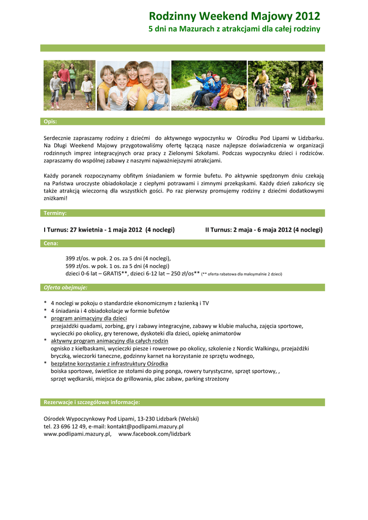 Rodzinny Weekend Majowy 2012 5 dni na Mazurach z atrakcjami dla całej rodziny Opis: Serdecznie zapraszamy rodziny z dziedmi do aktywnego wypoczynku w Ośrodku Pod Lipami w Lidzbarku. Na Długi Weekend Majowy przygotowaliśmy ofertę łączącą nasze najlepsze doświadczenia w organizacji rodzinnych imprez integracyjnych oraz pracy z Zielonymi Szkołami. Podczas wypoczynku dzieci i rodziców. zapraszamy do wspólnej zabawy z naszymi najważniejszymi atrakcjami. Każdy poranek rozpoczynamy obfitym śniadaniem w formie bufetu. Po aktywnie spędzonym dniu czekają na Paostwa uroczyste obiadokolacje z ciepłymi potrawami i zimnymi przekąskami. Każdy dzieo zakooczy się także atrakcją wieczorną dla wszystkich gości. Po raz pierwszy promujemy rodziny z dziedmi dodatkowymi zniżkami! Terminy: I Turnus: 27 kwietnia - 1 maja 2012 (4 noclegi) II Turnus: 2 maja - 6 maja 2012 (4 noclegi) Cena: 399 zł/os. w pok. 2 os. za 5 dni (4 noclegi), 599 zł/os. w pok. 1 os. za 5 dni (4 noclegi) dzieci 0-6 lat – GRATIS**, dzieci 6-12 lat – 250 zł/os** (** oferta rabatowa dla maksymalnie 2 dzieci) Oferta obejmuje: * 4 noclegi w pokoju o standardzie ekonomicznym z łazienką i TV * 4 śniadania i 4 obiadokolacje w formie bufetów * program animacyjny dla dzieci przejażdżki quadami, zorbing, gry i zabawy integracyjne, zabawy w klubie malucha, zajęcia sportowe, wycieczki po okolicy, gry terenowe, dyskoteki dla dzieci, opiekę animatorów * aktywny program animacyjny dla całych rodzin ognisko z kiełbaskami, wycieczki piesze i rowerowe po okolicy, szkolenie z Nordic Walkingu, przejażdżki bryczką, wieczorki taneczne, godzinny karnet na korzystanie ze sprzętu wodnego, * bezpłatne korzystanie z infrastruktury Ośrodka boiska sportowe, świetlice ze stołami do ping ponga, rowery turystyczne, sprzęt sportowy, , sprzęt wędkarski, miejsca do grillowania, plac zabaw, parking strzeżony Rezerwacje i szczegółowe informacje: Ośrodek Wypoczynkowy Pod Lipami, 13-230 Lidzbark (Welski) tel. 23 696 12 49, e-mail: [email protected] www.podlipami.mazury.pl, www.facebook.com/lidzbark