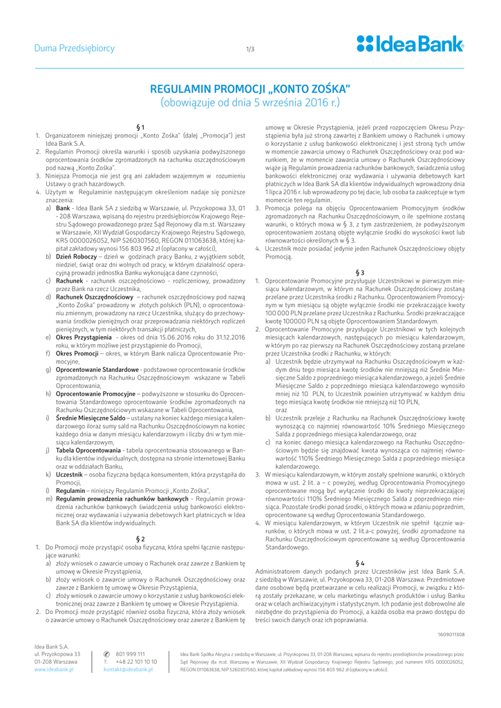 Duma Przedsiębiorcy 1/3 Regulamin promocji „Konto Zośka” (obowiązuje od dnia 5 września 2016 r.) §1 1. Organizatorem niniejszej promocji „Konto Zośka” (dalej „Promocja”) jest Idea Bank S.A. 2. Regulamin Promocji określa warunki i sposób uzyskania podwyższonego oprocentowania środków zgromadzonych na rachunku oszczędnościowym pod nazwą „Konto Zośka”. 3. Niniejsza Promocja nie jest grą ani zakładem wzajemnym w rozumieniu Ustawy o grach hazardowych. 4. Użytym w Regulaminie następującym określeniom nadaje się poniższe znaczenia: a) Bank - Idea Bank SA z siedzibą w Warszawie, ul. Przyokopowa 33, 01 - 208 Warszawa, wpisaną do rejestru przedsiębiorców Krajowego Rejestru Sądowego prowadzonego przez Sąd Rejonowy dla m.st. Warszawy w Warszawie, XII Wydział Gospodarczy Krajowego Rejestru Sądowego, KRS 0000026052, NIP 5260307560, REGON 011063638, której kapitał zakładowy wynosi 156 803 962 zł (opłacony w całości), b) Dzień Roboczy – dzień w godzinach pracy Banku, z wyjątkiem sobót, niedziel, świąt oraz dni wolnych od pracy, w którym działalność operacyjną prowadzi jednostka Banku wykonująca dane czynności, c) Rachunek - rachunek oszczędnościowo - rozliczeniowy, prowadzony przez Bank na rzecz Uczestnika, d) Rachunek Oszczędnościowy – rachunek oszczędnościowy pod nazwą „Konto Zośka” prowadzony w złotych polskich (PLN), o oprocentowaniu zmiennym, prowadzony na rzecz Uczestnika, służący do przechowywania środków pieniężnych oraz przeprowadzania niektórych rozliczeń pieniężnych, w tym niektórych transakcji płatniczych, e) Okres Przystąpienia - okres od dnia 15.06.2016 roku do 31.12.2016 roku, w którym możliwe jest przystąpienie do Promocji, f) Okres Promocji – okres, w którym Bank nalicza Oprocentowanie Promocyjne, g) Oprocentowanie Standardowe - podstawowe oprocentowanie środków zgromadzonych na Rachunku Oszczędnościowym wskazane w Tabeli Oprocentowania, h) Oprocentowanie Promocyjne – podwyższone w stosunku do Oprocentowania Standardowego oprocentowanie środków zgromadzonych na Rachunku Oszczędnościowym wskazane w Tabeli Oprocentowania, i) Średnie Miesięczne Saldo – ustalany na koniec każdego miesiąca kalendarzowego iloraz sumy sald na Rachunku Oszczędnościowym na koniec każdego dnia w danym miesiącu kalendarzowym i liczby dni w tym miesiącu kalendarzowym, j) Tabela Oprocentowania - tabela oprocentowania stosowanego w Banku dla klientów indywidualnych, dostępna na stronie internetowej Banku oraz w oddziałach Banku, k) Uczestnik – osoba fizyczna będąca konsumentem, która przystąpiła do Promocji, l) Regulamin – niniejszy Regulamin Promocji „Konto Zośka”, m) Regulamin prowadzenia rachunków bankowych - Regulamin prowadzenia rachunków bankowych świadczenia usług bankowości elektronicznej oraz wydawania i używania debetowych kart płatniczych w Idea Bank SA dla klientów indywidualnych. §2 1. Do Promocji może przystąpić osoba fizyczna, która spełni łącznie następujące warunki: a) złoży wniosek o zawarcie umowy o Rachunek oraz zawrze z Bankiem tę umowę w Okresie Przystąpienia, b) złoży wniosek o zawarcie umowy o Rachunek Oszczędnościowy oraz zawrze z Bankiem tę umowę w Okresie Przystąpienia, c) złoży wniosek o zawarcie umowy o korzystanie z usług bankowości elektronicznej oraz zawrze z Bankiem tę umowę w Okresie Przystąpienia. 2. Do Promocji może przystąpić również osoba fizyczna, która złoży wniosek o zawarcie umowy o Rachunek Oszczędnościowy oraz zawrze z Bankiem tę umowę w Okresie Przystąpienia, jeżeli przed rozpoczęciem Okresu Przystąpienia była już stroną zawartej z Bankiem umowy o Rachunek i umowy o korzystanie z usług bankowości elektronicznej i jest stroną tych umów w momencie zawarcia umowy o Rachunek Oszczędnościowy oraz pod warunkiem, że w momencie zawarcia umowy o Rachunek Oszczędnościowy wiąże ją Regulamin prowadzenia rachunków bankowych, świadczenia usług bankowości elektronicznej oraz wydawania i używania debetowych kart płatniczych w Idea Bank SA dla klientów indywidualnych wprowadzony dnia 1 lipca 2016 r. lub wprowadzony po tej dacie, lub osoba ta zaakceptuje w tym momencie ten regulamin. 3. Promocja polega na objęciu Oprocentowaniem Promocyjnym środków zgromadzonych na Rachunku Oszczędnościowym, o ile spełnione zostaną warunki, o których mowa w § 3, z tym zastrzeżeniem, że podwyższonym oprocentowaniem zostaną objęte wyłącznie środki do wysokości kwot lub równowartości określonych w § 3. 4. Uczestnik może posiadać jedynie jeden Rachunek Oszczędnościowy objęty Promocją. §3 1. Oprocentowanie Promocyjne przysługuje Uczestnikowi w pierwszym miesiącu kalendarzowym, w którym na Rachunek Oszczędnościowy zostaną przelane przez Uczestnika środki z Rachunku. Oprocentowaniem Promocyjnym w tym miesiącu są objęte wyłącznie środki nie przekraczające kwoty 100 000 PLN przelane przez Uczestnika z Rachunku. Środki przekraczające kwotę 100000 PLN są objęte Oprocentowaniem Standardowym. 2. Oprocentowanie Promocyjne przysługuje Uczestnikowi w tych kolejnych miesiącach kalendarzowych, następujących po miesiącu kalendarzowym, w którym po raz pierwszy na Rachunek Oszczędnościowy zostaną przelane przez Uczestnika środki z Rachunku, w których: a) Uczestnik będzie utrzymywał na Rachunku Oszczędnościowym w każdym dniu tego miesiąca kwotę środków nie mniejszą niż Średnie Miesięczne Saldo z poprzedniego miesiąca kalendarzowego, a jeżeli Średnie Miesięczne Saldo z poprzedniego miesiąca kalendarzowego wynosiło mniej niż 10 PLN, to Uczestnik powinien utrzymywać w każdym dniu tego miesiąca kwotę środków nie mniejszą niż 10 PLN, oraz b) Uczestnik przeleje z Rachunku na Rachunek Oszczędnościowy kwotę wynoszącą co najmniej równowartość 10% Średniego Miesięcznego Salda z poprzedniego miesiąca kalendarzowego, oraz c) na ko