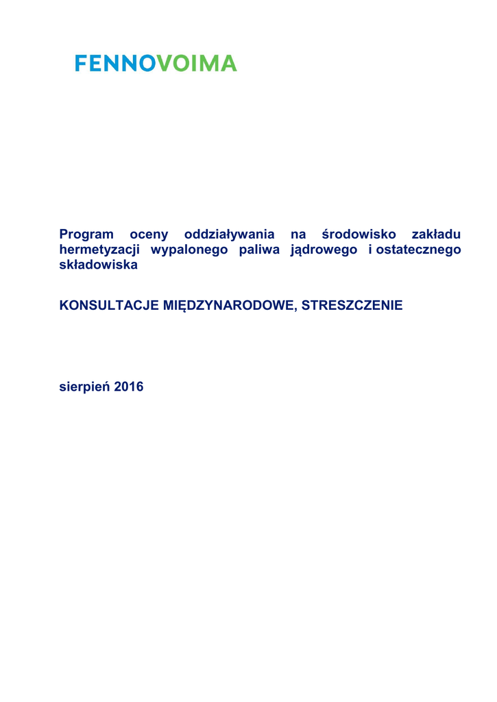 Program oceny oddziaływania na środowisko zakładu hermetyzacji wypalonego paliwa jądrowego i ostatecznego składowiska KONSULTACJE MIĘDZYNARODOWE, STRESZCZENIE sierpień 2016 1 Podmiot odpowiedzialny za projekt i geneza projektu Podmiotem odpowiedzialnym za projekt w rozumieniu Ustawy o ocenie oddziaływania na środowisko (468/1994) jest Fennovoima Oy (dalej „Fennovoima”), założona w 2007 r. fińska spółka z branży energii jądrowej. Fennovoima buduje elektrownię jądrową o mocy wytwórczej około 1200 MW na przylądku Hanhikivi w gminie Pyhäjoki. Pod koniec czerwca 2015 r. Fennovoima złożyła do Rządu wniosek o pozwolenie na budowę elektrowni jądrowej zgodnie z Ustawą o energii jądrowej (990/1987). Zgodnie z decyzją zasadniczą udzieloną spółce Fennovoima w 2010 r. do końca czerwca 2016 r. Fennovoima musi przedstawić Ministerstwu Gospodarki i Pracy umowę o współpracy w zakresie ostatecznego składowania odpadów, podpisaną z podmiotami podlegającymi aktualnie obowiązkowi zagospodarowania odpadów nuklearnych (Teollisuuden Voima Oyj i Fortum Power and Heat Oy), bądź program oceny oddziaływania na środowisko naturalne jej własnego zakładu hermetyzacji i ostatecznego składowiska (program OOŚ). Przedstawiając program OOŚ Fennovoima uzupełnia wniosek o pozwolenie na budowę elektrowni jądrowej i wszczyna procedurę oceny oddziaływania, która jest wymagana na mocy warunku określonego w decyzji zasadniczej z 2010 r. w odniesieniu do jej własnego zakładu hermetyzacji wypalonego paliwa jądrowego i ostatecznego składowiska. Fennovoima nawiązała również współpracę z fińską spółką z branży zagospodarowania odpadów jądrowych Posiva Oy, podpisując umowę o świadczenie usług z jej jednostką zależną, Posiva Solutions Oy. Posiva Oy należy do Teollisuuden Voima Oyj i Fortum Power and Heat Oy. Do obowiązków Posiva Oy należy ostateczne składowanie wypalonego paliwa jądrowego wytworzonego przez jej właścicieli, prowadzenie badań związanych z ostatecznym składowaniem oraz inne zadania specjalistyczne leżące w zakresie jej działalności. Umowa o świadczenie usług gwarantuje, że ponad 40-letnie doświadczenie Posiva Oy będzie mogło być wykorzystywane przez Fennovoima w zakładzie ostatecznego składowania wypalonego paliwa jądrowego. Ponadto Fennovoima w dalszym ciągu będzie prowadziła z podmiotami podlegającymi obecnie obowiązkowi zagospodarowania odpadów jądrowych negocjacje w przedmiocie długoterminowej współpracy przy ostatecznym składowaniu wypalonego paliwa jądrowego. 2 Procedura oceny oddziaływania na środowisko Zgodnie z Ustawą o procedurze oceny oddziaływania na środowisko (468/1994) oraz Rozporządzeniem w sprawie procedury oceny oddziaływania na środowisko (713/2006), procedura oceny oddziaływania na środowisko jest obowiązkowa w przypadku zakładów przeznaczonych do przetwarzania i ostatecznego składowania napromieniowanego paliwa jądrowego. Celem procedury OOŚ nie jest podjęcie jakichkolwiek decyzji związanych z projektem ani lokalizacją miejsca ostatecznego składowania wypalonego paliwa jądrowego; jej celem jest dostarczenie informacji które mają posłużyć za podstawę do podejmowania decyzji i które powinny zostać uwzględnione w procedurze wydawania pozwolenia. Procedura OOŚ ma wnieść wkład w ocenę oddziaływania na środowisko oraz zapewnić, że kwestie oddziaływania na środowisko będą każdorazowo brane pod uwagę przy planowaniu i podejmowaniu decyzji. Kolejnym jej celem jest zwiększenie dostępności informacji dla interesariuszy oraz zapewnienie im możliwości uczestnictwa w planowaniu projektów. Procedura OOŚ obejmuje fazę programową oraz fazę sprawozdawczą. Program OOŚ to plan wykonania procedury oceny oddziaływania na środowisko oraz wymaganych dodatkowych opracowań. Złożenie programu rozpocznie kilkuletnią fazę badawczą, podczas której zostanie zbadane oddziaływanie na środowisko projektu ostatecznego składowania wypalonego paliwa jądrowego, cechy geologiczne alternatywnych lokalizacji oraz ich przydatność do celów ostatecznego składowania. Opracowane następnie sprawozdanie OOŚ będzie zawierać charakterystykę projektu oraz rozwiązań technicznych, jak również ocenę jego oddziaływania na środowisko w oparciu o procedurę OOŚ. Sprawozdanie OOŚ zostanie załączone do wniosku o wydanie decyzji zasadniczej dotyczącej zakładu hermetyzacji wypalonego paliwa jądrowego i ostatecznego składowiska. Procedura OOŚ rozpocznie się oficjalnie w momencie złożenia programu OOŚ do organu koordynującego. Organem koordynującym tę procedurę OOŚ jest Ministerstwo Gospodarki i Pracy. Organ koordynujący ogłosi publiczne udostępnienie programu OOŚ. Podczas okresu udostępniania interesariusze mogą zgłaszać organowi koordynującemu swoje opinie odnośnie do programu OOŚ. Organ koordynujący wystąpi ponadto do różnych organów o wydanie stanowisk odnośnie do programu. Organ koordynujący zbierze opinie i stanowiska dotyczące programu OOŚ oraz w oparciu o nie wystosuje własne stanowisko w tej kwestii do podmiotu odpowiedzialnego za projekt. Sprawozdanie OOŚ zostanie udostępnione publicznie, aby umożliwić składanie stanowisk i opinii. 3 Konsultacje międzynarodowe W Finlandii Ministerstwo Środowiska odpowiada za praktyczne ustalenia dotyczące konsultacji międzynarodowych, o których mowa w Konwencji o ocenach oddziaływania na środowisko w kontekście transgranicznym (67/1997; zwanej także Konwencją z Espoo) Europejskiej Komisji Gospodarczej Narodów Zjednoczonych. Ministerstwo Środowiska powiadomi wszelkie zainteresowane podmioty o wszczęciu procedury OOŚ odnośnie do projektu ostatecznego składowania wypalonego paliwa jądrowego oraz potwierdzi, czy chcą uczestniczyć w fińskiej procedurze OOŚ. Do powiadomienia zostanie dołączone skierowane do ogółu odbiorców streszczenie programu