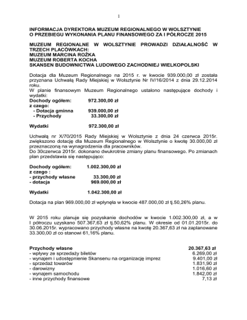 1 INFORMACJA DYREKTORA MUZEUM REGIONALNEGO W WOLSZTYNIE O PRZEBIEGU WYKONANIA PLANU FINANSOWEGO ZA I PÓŁROCZE 2015 MUZEUM REGIONALNE W WOLSZTYNIE PROWADZI DZIAŁALNOŚĆ W TRZECH PLACÓWKACH: MUZEUM MARCINA ROŻKA MUZEUM ROBERTA KOCHA SKANSEN BUDOWNICTWA LUDOWEGO ZACHODNIEJ WIELKOPOLSKI Dotacja dla Muzeum Regionalnego na 2015 r. w kwocie 939.000,00 zł została przyznana Uchwałą Rady Miejskiej w Wolsztynie Nr IV/16/2014 z dnia 29.12.2014 roku. W planie finansowym Muzeum Regionalnego ustalono następujące dochody i wydatki: Dochody ogółem: 972.300,00 zł z czego: - Dotacja gminna 939.000,00 zł - Przychody 33.300,00 zł Wydatki 972.300,00 zł Uchwałą nr X/70/2015 Rady Miejskiej w Wolsztynie z dnia 24 czerwca 2015r. zwiększono dotację dla Muzeum Regionalnego w Wolsztynie o kwotę 30.000,00 zł przeznaczoną na wynagrodzenia dla pracowników. Do 30czerwca 2015r. dokonano dwukrotnie zmiany planu finansowego. Po zmianach plan przedstawia się następująco: Dochody ogółem: z czego : - przychody własne - dotacja 1.002.300,00 zł Wydatki 1.042.300,00 zł 33.300,00 zł 969.000,00 zł Dotacja na plan 969.000,00 zł wpłynęła w kwocie 487.000,00 zł tj.50,26% planu. W 2015 roku planuje się pozyskanie dochodów w kwocie 1.002.300,00 zł, a w I półroczu uzyskano 507.367,63 zł tj.50,62% planu. W okresie od 01.01.2015r. do 30.06.2015r. wypracowano przychody własne na kwotę 20.367,63 zł na zaplanowane 33.300,00 zł co stanowi 61,16% planu. Przychody własne - wpływy ze sprzedaży biletów - wynajem i udostępnienie Skansenu na organizację imprez - sprzedaż towarów - darowizny - wynajem samochodu - inne przychody finansowe 20.367,63 zł 6.269,00 zł 9.401,00 zł 1.831,90 zł 1.016,60 zł 1.842,00 zł 7,13 zł 2 Placówki Muzeum Regionalnego w okresie od 1.01.2015 – 30.06.2015 odwiedziło osób: 8.676 os. - Muzeum Doktora Roberta Kocha 677 os. - Muzeum Marcina Rożka 865 os. - Skansen Bud. Lud. Zach. Wlkp. 7.134 os. Uzyskane wpływy przeznacza się zgodnie z planem finansowym na zadania bieżące. Wydatki Muzeum Regionalnego na dzień 30 czerwca 2015r. wynoszą 426.258,99 zł , co stanowi 40,90 % planu. Środki finansowe zostały wydatkowane na: 1. Wynagrodzenia wraz z pochodnymi - kwota 310.320,85 zł 2. Zakup materiałów kwota 24.475,62 zł - - artykuły spożywcze – lekcje muzealne - artykuły biurowe, papiernicze, - artykuły do działalności wystawienniczej, pokazowej / szyny wystawiennicze- 2.348,64 zł, koks, włóczka / - sprzęt: audiowizualny , komputerowy - towary na promocję - środki czystości - artykuły ogrodnicze / nasiona, śr. ochr. roślin/ - paliwo do samochodu, piły, kosiarki, części zam. do sam. - artykuły przemysłowe, elektryczne, malarskie - sprzęt gospodarczy / karcher, wiertarka drabina, piła itp./ - karma i akcesoria dla zwierząt - artykuły BHP - rękawice, napoje dla pracowników - inne drobne zakupy 3. Zakup muzealiów i książek - kwota - muzealia - książki - 2.028,29 zł 1.339,50 zł - 2.721,05 zł 5.213,00 zł 503,00 zł 1.415,58 zł 771,64 zł 4.016,60 zł 2.232,76 zł 2.771,50 zł 744,75 zł 536,19 zł 181,76 zł - 4.338,39 zł - 4.058,10 zł 280,29 zł Zbiory muzeum powiększyły się o 46 eksponatów, w tym 32 etnograficzne oraz 14 artystyczno-historyczne. Większość muzealiów Muzeum otrzymało w darze. 4. Zakup energii, gazu i wody - kwota 22.987,93zł Na kwotę zakupu gazu, energii i wody składają się wydatki: Muzeum R. Kocha – ogrzewanie elektryczne, Muzeum M. Rożka – ogrzewanie gazowe, Skansen – ogrzewanie gazowe + oświetlenie terenu skansenu. 3 5. Pozostałe usługi - kwota 23.497,15zł w tym na: - wykonanie: zdjęć do dokumentacji muzealnej, wielkoformatowych kserokopii zdjęć i pocztówek do wystaw - prezentacja muzeum w internecie, utrzymanie domeny - prace naprawczo-konserwacyjne samochodu, badanie techn. - przegląd systemu p. poż., naprawa sprzętu, roboty instalacyjne , gazowe w budynku socjalnym, wymiana bojlera - usługa weterynaryjna - psy - usługa kominiarska - usługa rolnicza - usługa ogrodnicza - usługi pocztowo-telekomunikacyjne - usługi ochrony mienia - usługi komunalne - pozostałe drobne usługi 6. Pozostałe wydatki - kwota - 850,00 zł 2.952,00 zł 684,11zł 4.434,05 zł 222,91 zł 520,00 zł 750,00 zł 5.915,40 zł 3.850,27 zł 1.808,10 zł 1.234,41 zł 275,90 zł 20.448,90 zł - Decydującą pozycję stanowią tu wydatki na odpis na Zakładowy Fundusz Świadczeń Socjalnych. Do 30 czerwca 2015r. zgodnie z ustawą przekazano na wyodrębniony rachunek bankowy kwotę 15.000,00 zł . Pozostałe wydatki to delegacje - kwota 1.893,72 zł, podatki i opłaty – kwota 3.555,18 zł. . 7. Remonty i konserwacje - kwota - prace budowlane - pokrycie dachu słomą - zakup materiałów budowlanych - transport mat. budowlanych - usługa żurawiem, podnośnikiem - przetarcie drewna 20.190,15 zł - 14.698,75 3.068,24 582,10 897,90 943,16 zł zł zł zł zł .Inne obciążenia : -. amortyzacja środków trwałych. 5.377,68 zł Zobowiązania i należności Muzeum Regionalnego na dzień 30.06.2014r. Zobowiązania: wobec ZUS i Urzędu Skarbowego 21.777,87 wobec dostawcy towarów i usług 0,00 Należności: z tytułu sprzedanych usług 0,00 Jednostka nie ma zobowiązań i należności wymagalnych . zł zł zł 4 Muzeum Regionalne w Wolsztynie Wykonanie planu finansowego na dzień 30.06.2015 Stan środków na początku 2015roku Stan środków na koniec roku 2015 - 44.783,33 4.783,33 zł zł Przychody Przychody Plan Dotacje Przychody własne Razem Wykonanie % 969.000,00 487.000,00 50,26 33.300,00 20.367,63 61,16 1.002.300,00 507.367,63 50,62 Wydatki Wydatki Plan Wykonanie % Wynagrodzenie 606.600,00 259.725,44 42,82 Nagroda roczna 51.900,00 0,00 0,00 101.700,00 41.098,39 40,41 Fundusz pracy 14.400,00 3.072,02 21,33 Umowy zlecenia i o dzieło 17.500,00 6.425,00 36.71 20.190,15 22,69 34.000,00 24.475,62 71,99 1.500,00 280,29 18,69 Zakup muzealiów 10.000,00 4.058,10 40,58 Zakup gazu, energii i wody 50.