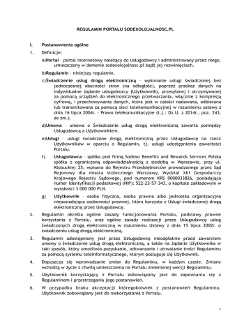 REGULAMIN PORTALU SODEXOLOJALNOSC.PL I. Postanowienia ogólne 1. Definicje: a)Portal – portal internetowy należący do Usługodawcy i administrowany przez niego, umieszczony w domenie sodexolojalnosc.pl bądź jej rozwinięciach. b)Regulamin – niniejszy regulamin. c)Świadczenie usług drogą elektroniczną – wykonanie usługi świadczonej bez jednoczesnej obecności stron (na odległość), poprzez przekaz danych na indywidualne żądanie usługobiorcy (Użytkownik), przesyłanej i otrzymywanej za pomocą urządzeń do elektronicznego przetwarzania, włącznie z kompresją cyfrową, i przechowywania danych, która jest w całości nadawana, odbierana lub transmitowana za pomocą sieci telekomunikacyjnej w rozumieniu ustawy z dnia 16 lipca 2004r. - Prawo telekomunikacyjne (t.j.: Dz.U. z 2014r., poz. 243, ze zm.). d)Umowa – umowa o Świadczenie usług drogą elektroniczną zawarta pomiędzy Usługodawcą a Użytkownikiem. e)Usługi – usługi świadczone drogą elektroniczną przez Usługodawcę na rzecz Użytkowników w oparciu o Regulamin, tj. usługi udostępnienia zawartości Portalu. f) Usługodawca – spółka pod firmą Sodexo Benefits and Rewards Services Polska spółka z ograniczoną odpowiedzialnością z siedzibą w Warszawie, przy ul. Kłobuckiej 25, wpisana do Rejestru Przedsiębiorców prowadzonego przez Sąd Rejonowy dla miasta stołecznego Warszawy, Wydział XIII Gospodarczy Krajowego Rejestru Sądowego, pod numerem KRS 0000033826, posiadająca numer identyfikacji podatkowej (NIP): 522-23-57-343, o kapitale zakładowym w wysokości 3 000 000 PLN. g) Użytkownik – osoba fizyczna, osoba prawna albo jednostka organizacyjna nieposiadająca osobowości prawnej, która korzysta z Usługi świadczonej drogą elektroniczną przez Usługodawcę. 2. Regulamin określa ogólne zasady funkcjonowania Portalu, podstawy prawne korzystania z Portalu, oraz ogólne zasady realizacji przez Usługodawcę usług świadczonych drogą elektroniczną w rozumieniu Ustawy z dnia 15 lipca 2002r. o świadczeniu usług drogą elektroniczną. 3. Regulamin udostępniony jest przez Usługodawcę nieodpłatnie przed zawarciem umowy o świadczenie usług drogą elektroniczną, a także na żądanie Użytkownika w taki sposób, który umożliwia pozyskanie, odtwarzanie i utrwalanie treści Regulaminu za pomocą systemu teleinformatycznego, którym posługuje się Użytkownik. 4. Dopuszcza się wprowadzanie zmian do Regulaminu, w każdym czasie. Zmiany wchodzą w życie z chwilą umieszczenia na Portalu zmienionej wersji Regulaminu. 5. Użytkownik korzystający z Portalu zobowiązany jest do zapoznania się z Regulaminem i przestrzegania jego postanowień. 6. W przypadku braku akceptacji któregokolwiek z postanowień Regulaminu, Użytkownik zobowiązany jest do niekorzystania z Portalu. 1 II. Wymagania techniczne 1. Korzystanie z Portalu jest możliwe poprzez połączenie z siecią Internet i wymaga spełnienia przez system teleinformatyczny następujących wymagań technicznych: Internet Explorer Internet Explorer w wersji 11.0 lub nowszej z włączoną obsługą JavaScript, lub Mozilla Firefox w wersji 30.0 lub nowszej z włączoną obsługą JavaScript lub Chrome w wersji 40.0 lub nowszej z włączoną obsługą JavaScript oraz jest napisany w technologii RWD (Responsive Web Design). III. Sposób korzystania z Portalu III.1. Celem Portalu jest dostarczenie Użytkownikom informacji na temat produktów i usług świadczonych przez Usługodawcę na rzecz przedsiębiorstw z obszaru incentive and recognition, w szczególności: programów lojalnościowych, nagród i premii, konkursów i loterii. Korzystanie z Portalu jest bezpłatne i dobrowolne. III.2. Użytkownik zobowiązany jest do korzystania z Portalu w sposób zgodny z Regulaminem, przepisami prawa i zasadami współżycia społecznego. W szczególności, zabrania się: a)podejmowania działań mogących utrudnić lub uniemożliwić funkcjonowanie Portalu, w tym, korzystanie z Portalu przez innych Użytkowników; b)wykorzystywania Portalu (bezpośrednio lub pośrednio) w celu rozsyłania niezamówionej informacji handlowej; c)umieszczania na Portalu, lub udostępniania w jakikolwiek inny sposób, treści o charakterze bezprawnym; d)innych zachowań, które mogłyby zostać uznane przez Usługodawcę za działania niepożądane lub sprzeczne z celem działania Portalu. III.3. Wszelkie pytania dotyczące funkcjonowania Portalu lub sposobu korzystania z niego należy kierować na adres: [email protected]. IV. Warunki zawierania i rozwiązywania Umów IV.1. Umowa zostaje zawarta przez Użytkownika w momencie rozpoczęcia świadczenia Usługi przez Usługodawcę, tj. z momentem wejścia na stronę internetową Portalu. IV.2. Umowa o świadczenie usług drogą elektroniczną ulega rozwiązaniu: a)z chwilą opuszczenia przez Użytkownika Portalu, b)w wyniku decyzji Usługodawcy o rozwiązaniu Umowy, która może być spowodowana, w szczególności: naruszeniem postanowień Regulaminu ze strony Użytkownika lub problemami technicznymi po stronie Użytkownika, uniemożliwiającymi świadczenie dla niego Usługi przez Usługodawcę. V. Reklamacje V.1. Reklamacje dotyczące niepoprawnego działania Portalu będą rozpatrywane przez Usługodawcę w terminie 14 dni od dnia zgłoszenia reklamacji, przy wykorzystaniu formularza kontaktowego za pośrednictwem Portalu, ustnie lub pisemnie pod 2 adresem Sodexo Benefits and Rewards Services Polska sp. z o.o. ul. Kłobucka 25, 02-699 Warszawa. V.2. Reklamacja winna zawierać oznaczenie Użytkownika oraz zwięzły opis zgłaszanych zastrzeżeń. W razie konieczności jej uzupełnienia, Usługodawca zwróci się do Użytkownika z prośbą o podanie szczegółów dotyczących zrealizowanego zlecenia. V.3. Usługodawca rozpoznaje reklamację w terminie 14 dni od daty jej otrzymania, a w przypadku niemożności rozpatrzenia reklamacji w powyższym terminie Sodexo informuje o tym Użytkownika podając przyczynę p