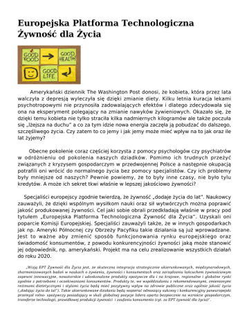 Europejska Platforma Technologiczna Żywność dla Życia Amerykański dziennik The Washington Post donosi, że kobieta, która przez lata walczyła z depresją wyleczyła się dzięki zmianie diety. Kilku letnia kuracja lekami psychotropowymi nie przynosiła zadowalających efektów i dlatego zdecydowała się ona na eksperyment polegający na zmianie nawyków żywieniowych. Okazało się, że dzięki temu kobieta nie tylko straciła kilka nadmiernych kilogramów ale także poczuła się „lżejsza na duchu” a co za tym idzie nowa energia zaczęła ją pobudzać do dalszego, szczęśliwego życia. Czy zatem to co jemy i jak jemy może mieć wpływ na to jak oraz ile lat żyjemy? Obecne pokolenie coraz częściej korzysta z pomocy psychologów czy psychiatrów w odróżnieniu od pokolenia naszych dziadków. Pomimo ich trudnych przeżyć związanych z kryzysem gospodarczym w przedwojennej Polsce a następnie okupacją potrafili oni wrócić do normalnego życia bez pomocy specjalistów. Czy ich problemy były mniejsze od naszych? Pewnie powiemy, że to były inne czasy, nie było tylu kredytów. A może ich sekret tkwi właśnie w lepszej jakościowo żywności? Specjaliści europejscy zgodnie twierdzą, że żywność „dodaje życia do lat”. Naukowcy zauważyli, że dzięki wspólnym wysiłkom nauki oraz sił wytwórczych można poprawić jakość produkowanej żywności. Cel jaki sobie obrali przedkładają właśnie w pracy pod tytułem „Europejska Platforma Technologiczna Żywność dla Życia”. Uzyskali oni poparcie Komisji Europejskiej. Specjaliści zauważyli także, że w innych gospodarkach jak np. Ameryki Północnej czy Obrzeży Pacyfiku takie działania są już wprowadzane. Jest to ważne aby zmienić sposób funkcjonowania rynku europejskiego oraz świadomość konsumentów, z powodu konkurencyjności żywności jaką może stanowić jej odpowiednik, np. amerykański. Projekt ma na celu zrealizowanie wszystkich działań do roku 2020. „Wizją EPT Żywność dla Życia jest, że skuteczna integracja strategicznie ukierunkowanych, międzynarodowych, zharmonizowanych badań w naukach o żywieniu, żywności i konsumentach oraz zarządzaniu łańcuchem żywnościowym zapewni innowacyjne, nowatorskie i udoskonalone produkty spożywcze dla i na krajowe, regionalne i globalne rynki zgodnie z potrzebami i oczekiwaniami konsumentów. Produkty te, we współdziałaniu z rekomendowanymi, zmienionymi reżimami dietetycznymi i stylami życia będą mieć pozytywny wpływ na zdrowie publiczne oraz ogólnie jakość życia („dodając życia do lat”). Takie ukierunkowane działania będą wspierać odnoszący sukcesy i konkurencyjny paneuropejski przemysł rolno- spożywczy posiadający w skali globalnej pozycje lidera oparta bezpiecznie na wzroście gospodarczym, transferze technologii, prawidłowej produkcji żywności i zaufaniu konsumenta (cyt. za EPT żywność dla życia)”. Aby poprawiać jakość życia Europejczyków oraz zwiększać konkurencyjność żywności specjaliści wyszczególniają sześć głównych obszarów działania. Pierwszym jest Żywność a Zdrowie. Obszar ten skupia szeroko rozumiane zmiany w zakresie odżywiania się czy stylu życia. Należy pamiętać, że to właśnie zwyczaje żywieniowe są głównymi poza genetycznymi przyczynami występowania chorób związanych z wiekiem. Koszty związane z leczeniem są bardzo wysokie dlatego tak ważne są zmiany w zakresie odżywiania oraz promowanie zwiększonej aktywności fizycznej. Działania takie w znacznym stopniu determinują zachorowalność oraz szybkość starzenia się. Jest to szczególnie ważne z uwagi na fakt, że już za 50 lat liczba osób w wieku 80 lat zwiększy się o 30%. Kolejny obszar Jakość i Produkcja Żywności ma na celu zwiększenie atrakcyjności produktów poprzez stałe poprawianie ich jakości, np. poprzez poprawę ich smaku. Ale także zwiększenie komunikacji różnych grup biorących udział w produkcji żywności, jak np. naukowcy i rolnicy. Ważne jest także sprawne wprowadzanie nowych procesów technologicznych. Żywność a Konsument to kolejna składowa działań jaką należy wziąć pod uwagę. Jest to jedna z najważniejszych części projektu, ponieważ bierze pod uwagę preferencje przeciętnego obywatela dotyczące wyboru konkretnych produktów. Jednakże specjaliści w tym zakresie wychodzą dalej, biorąc pod uwagę nie tylko rdzennych mieszkańców ale także imigrantów oraz grupy etniczne. Bezpieczeństwo Żywności jako kolejna składowa, to aspekt o jakim nie należy zapominać na żadnym etapie produkcji. Ważne jest ustalanie ścisłych norm przestrzeganych w procesach technologicznych produkcji czy tez przechowywania. Dlatego należy kierować swoja uwagę na efekty toksykologiczne, mikrobiologiczne oraz fizyczne produkowanej żywności na zdrowie konsumenta. Prawidłowa Produkcja Żywności to nie tylko dbałość o każdy szczegół na poszczególnych etapach produkcji ale także zapewnienie jak najniższej ceny, aby każdy obywatel miał dostęp do jak najlepszej żywności. Ważna zatem jest interakcja i komunikacja wszystkich składowych w celu osiągnięcia jak najbardziej zadowalającego efektu. Zarządzanie Łańcuchem Żywnościowym to wzięcie pod uwagę zarówno jakości żywności oraz jej właściwego składu chemicznego. Poza tym łączy ono w sobie kontrolę oraz interakcje wszystkich poszczególnych składowych całego procesu wytwórczego. W celu realizacji powyższej wizji ważne jest aby Platforma stała się miejscem spotkań tak zwanego Trójkąta Wiedzy, czyli interakcji pomiędzy obszarem Badań, Edukacji i Innowacji. Ważne jest zatem aby w spotkaniach brały udział osoby z różnych sektorów łańcucha żywnościowego zarówno eksperci jak i wytwórcy, ale także osoby o różnym podłożu kulturowym. Dzięki temu łatwiej będzie dostosowywać się do potrzeb konsumentów oraz tworzyć jedną wspólną politykę