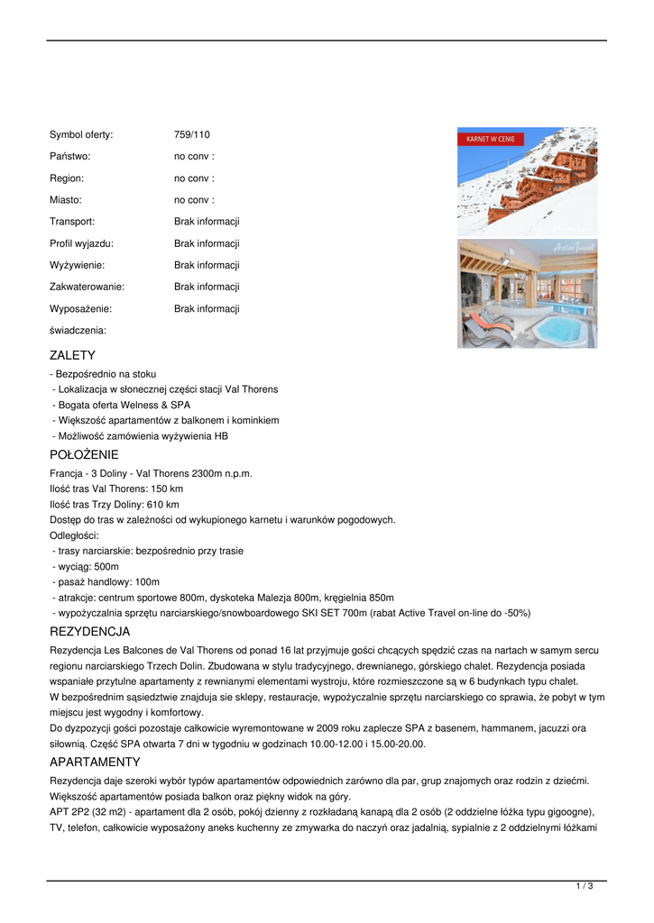 Symbol oferty: 759/110 Państwo: no conv : Region: no conv : Miasto: no conv : Transport: Brak informacji Profil wyjazdu: Brak informacji Wyżywienie: Brak informacji Zakwaterowanie: Brak informacji Wyposażenie: Brak informacji świadczenia: ZALETY - Bezpośrednio na stoku - Lokalizacja w słonecznej części stacji Val Thorens - Bogata oferta Welness & SPA - Większość apartamentów z balkonem i kominkiem - Możliwość zamówienia wyżywienia HB POŁOŻENIE Francja - 3 Doliny - Val Thorens 2300m n.p.m. Ilość tras Val Thorens: 150 km Ilość tras Trzy Doliny: 610 km Dostęp do tras w zależności od wykupionego karnetu i warunków pogodowych. Odległości: - trasy narciarskie: bezpośrednio przy trasie - wyciąg: 500m - pasaż handlowy: 100m - atrakcje: centrum sportowe 800m, dyskoteka Malezja 800m, kręgielnia 850m - wypożyczalnia sprzętu narciarskiego/snowboardowego SKI SET 700m (rabat Active Travel on-line do -50%) REZYDENCJA Rezydencja Les Balcones de Val Thorens od ponad 16 lat przyjmuje gości chcących spędzić czas na nartach w samym sercu regionu narciarskiego Trzech Dolin. Zbudowana w stylu tradycyjnego, drewnianego, górskiego chalet. Rezydencja posiada wspaniałe przytulne apartamenty z rewnianymi elementami wystroju, które rozmieszczone są w 6 budynkach typu chalet. W bezpośrednim sąsiedztwie znajduja sie sklepy, restauracje, wypożyczalnie sprzętu narciarskiego co sprawia, że pobyt w tym miejscu jest wygodny i komfortowy. Do dyzpozycji gości pozostaje całkowicie wyremontowane w 2009 roku zaplecze SPA z basenem, hammanem, jacuzzi ora siłownią. Część SPA otwarta 7 dni w tygodniu w godzinach 10.00-12.00 i 15.00-20.00. APARTAMENTY Rezydencja daje szeroki wybór typów apartamentów odpowiednich zarówno dla par, grup znajomych oraz rodzin z dziećmi. Większość apartamentów posiada balkon oraz piękny widok na góry. APT 2P2 (32 m2) - apartament dla 2 osób, pokój dzienny z rozkładaną kanapą dla 2 osób (2 oddzielne łóżka typu gigoogne), TV, telefon, całkowicie wyposażony aneks kuchenny ze zmywarka do naczyń oraz jadalnią, sypialnie z 2 oddzielnymi łóżkami 1/3 80/190, łazienka z wanną z hydromasażem, WC. APT 2/4 (37 m2) - apartament dla 4 osób, pokój dzienny z rozkładaną kanapą dla 2 osób, TV, telefon, całkowicie wyposażony aneks kuchenny ze zmywarka do naczyń oraz jadalnią, sypialnia z 2 oddzielnymi łóżkami 80/190,, łazienka z wanną z hydromasażem, WC. APT 4/6 cab (43 m2) - apartament dla max. 6 osób, pokój dzienny z rozkładaną kanapą dla 2 osób, TV, telefon, całkowicie wyposażony aneks kuchenny ze zmywarka do naczyń oraz jadalnią, sypialnia z 2 pojedynczymi łóżkami 80/190, sypialnia typu cabine z łóżkiem piętrowym 80/190, łazienka z wanną z hydromasażem, łazienka z prysznicem, WC. APT 4/6 (52 m2) - apartament dla max. 6 osób, pokój dzienny z rozkładaną kanapą dla 2 osób, TV, telefon, całkowicie wyposażony aneks kuchenny ze zmywarka do naczyń oraz jadalnią, 2 sypialnie z 2 pojedynczymi łóżkami 80/190, łazienka z wanną z hydromasażem, łazienka z prysznicem, WC. APT 6/8 cab/mezzanine (60 m2) - apartament dla max. 8 osób, pokój dzienny z rozkładaną kanapą dla 2 osób, TV, telefon, całkowicie wyposażony aneks kuchenny ze zmywarka do naczyń oraz jadalnią, 2 sypialnie z 2 pojedynczymi łóżkami 80/190, 1 sypialnia typu cabine z łóżkiem piętrowym lub typu mezzanine z 2 pojedynczymi łóżkami 80/190, łazienka z wanną z hydromasażem, łazienka z prysznicem, WC. APT 6/8 (72 m2) - apartament dla max. 8 osób, pokój dzienny z rozkładaną kanapą dla 2 osób, TV, telefon, całkowicie wyposażony aneks kuchenny ze zmywarka do naczyń oraz jadalnią, piec opalany drewnem, 1 sypialnia z pojedynczym łóżkiem dla 2 osób, 2 sypialnie z 2 pojedynczymi łóżkami 80/190, łazienka z wanną z hydromasażem, łazienka z prysznicem, 2 WC. APT 8/10 (95 m2) - apartament dla max. 10 osób, pokój dzienny z rozkładaną kanapą dla 2 osób, TV, telefon, całkowicie wyposażony aneks kuchenny ze zmywarka do naczyń oraz jadalnią, piec opalany drewnem, 1 sypialnia z podwójnym łóżkiem, 3 sypialnie z 2 pojedynczymi łóżkami 80/190, 2 łazienki z wanną, 1 łazienka z prysznicem, 3 WC. APT 8/10 sup (110 m2) - komfortowy apartament dla 10 osób, pokój dzienny z rozkładaną kanapą dla 2 osób, TV, telefon, całkowicie wyposażony aneks kuchenny ze zmywarka do naczyń oraz jadalnią, piec opalany drewnem, 4 sypialnie z 2 pojedynczymi łóżkami 80/190, 4 łazienki: co najmniej jedna łazienka z wanną z hydromasażem i 4 WC. APT 10/12 (120m2) - apartament dla max. 12 osób, pokój dzienny z rozkładaną kanapą dla 2 osób, TV, telefon, całkowicie wyposażony aneks kuchenny ze zmywarka do naczyń oraz jadalnią, piec opalany drewnem, 5 sypialni z 2 pojedynczymi łóżkami 80/190, 5 łazienek: co najmniej jednak łazienka z wanną z hydromasażem, 4 WC, balkon. APT 12/14 (150 m2) - pokój dla max. 14 osób, pokój dzienny z rozkładaną kanapą dla 2 osób, TV, telefon, całkowicie wyposażony aneks kuchenny ze zmywarka do naczyń oraz jadalnią, piec opalany drewnem, 4 sypialnie z 2 pojedynczymi łóżkami, 2 sypialnie z 1 podwójnym łóżkiem, 1 łazienka z wanną z hydromasażem, 3 łazienki z prysznicem, 4 WC, balkon. APT 14/16 (190 m2) - komfortowy apartament dla max. 16 osób, pokój dzienny z rozkładaną kanapą dla 2 osób, TV, telefon, całkowicie wyposażony aneks kuchenny ze zmywarka do naczyń oraz jadalnią, piec opalany drewnem 7 sypialni z pojedynczymi lub podwójnymi łóżkami, 7 łazienek z z wanną z hydromasażem, 7 WC, balkon. APT 9P16 (170 m2) - apartament dla max. 16 osób, pokój dzienny z rozkładaną kanapą dla 2 osób, TV, telefon, całkowicie wyposażony aneks kuchenny ze zmywarka do naczyń oraz jadalnią, piec opalany drewnem, 8 sypialni z pojedynczymi lub podwójnymi łóżkami, 2 łazienki z z wanną z hydromasażem, 3 łazienki z prysznicem, 4 WC, ba
