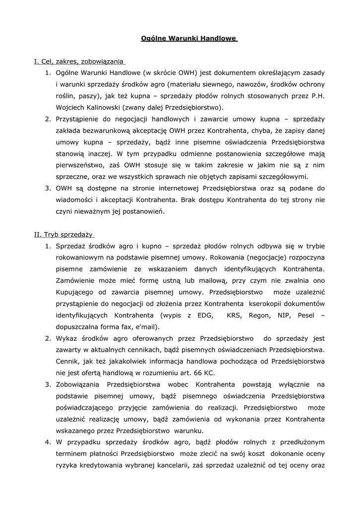 Ogólne Warunki Handlowe I. Cel, zakres, zobowiązania 1. Ogólne Warunki Handlowe (w skrócie OWH) jest dokumentem określającym zasady i warunki sprzedaży środków agro (materiału siewnego, nawozów, środków ochrony roślin, paszy), jak też kupna – sprzedaży płodów rolnych stosowanych przez P.H. Wojciech Kalinowski (zwany dalej Przedsiębiorstwo). 2. Przystąpienie do negocjacji handlowych i zawarcie umowy kupna – sprzedaży zakłada bezwarunkową akceptację OWH przez Kontrahenta, chyba, że zapisy danej umowy kupna – sprzedaży, bądź inne pisemne oświadczenia Przedsiębiorstwa stanowią inaczej. W tym przypadku odmienne postanowienia szczegółowe mają pierwszeństwo, zaś OWH stosuje się w takim zakresie w jakim nie są z nim sprzeczne, oraz we wszystkich sprawach nie objętych zapisami szczegółowymi. 3. OWH są dostępne na stronie internetowej Przedsiębiorstwa oraz są podane do wiadomości i akceptacji Kontrahenta. Brak dostępu Kontrahenta do tej strony nie czyni nieważnym jej postanowień. II. Tryb sprzedaży 1. Sprzedaż środków agro i kupno – sprzedaż płodów rolnych odbywa się w trybie rokowaniowym na podstawie pisemnej umowy. Rokowania (negocjacje) rozpoczyna pisemne zamówienie ze wskazaniem danych identyfikujących Kontrahenta. Zamówienie może mieć formę ustną lub mailową, przy czym nie zwalnia ono Kupującego od zawarcia pisemnej umowy. Przedsiębiorstwo może uzależnić przystąpienie do negocjacji od złożenia przez Kontrahenta kserokopii dokumentów identyfikujących Kontrahenta (wypis z EDG, KRS, Regon, NIP, Pesel – dopuszczalna forma fax, e'mail). 2. Wykaz środków agro oferowanych przez Przedsiębiorstwo do sprzedaży jest zawarty w aktualnych cennikach, bądź pisemnych oświadczeniach Przedsiębiorstwa. Cennik, jak też jakakolwiek informacja handlowa pochodząca od Przedsiębiorstwa nie jest ofertą handlową w rozumieniu art. 66 KC. 3. Zobowiązania Przedsiębiorstwa wobec Kontrahenta powstają wyłącznie na podstawie pisemnej umowy, bądź pisemnego oświadczenia Przedsiębiorstwa poświadczającego przyjęcie zamówienia do realizacji. Przedsiębiorstwo może uzależnić realizację umowy, bądź zamówienia od wykonania przez Kontrahenta wskazanego przez Przedsiębiorstwo warunku. 4. W przypadku sprzedaży środków agro, bądź płodów rolnych z przedłużonym terminem płatności Przedsiębiorstwo może zlecić na swój koszt dokonanie oceny ryzyka kredytowania wybranej kancelarii, zaś sprzedaż uzależnić od tej oceny oraz złożenia dodatkowych zabezpieczeń zapłaty. O konieczności dokonania takiej oceny Przedsiębiorstwo zawiadomi Kontrahenta. III. Cena, zapłata 1. Cena, jak też termin zapłaty jest każdorazowo wskazany w umowie, bądź fakturze. Zapłata płatna jest przelewem na wskazany tam rachunek, lub gotówką do rąk upoważnionego pracownika Przedsiębiorstwa, bądź w kasie Przedsiębiorstwa. 2. Cena zawiera koszty dostawy i ubezpieczenia o ile strony nie ustaliły inaczej. Przedsiębiorstwo ma prawo do zmiany ceny w przypadku, gdy Kontrahent dokonał zmiany warunków zamówienia po przyjęciu zamówienia do realizacji (np. zmiany terminu, miejsca dostawy). 3. Kontrahent nie może bez pisemnej zgody Przedsiębiorstwa stosować zatrzymania i jakichkolwiek potrąceń zapłaty. 4. Datą zapłaty jest data wpływu należności na konto bankowe Przedsiębiorstwa. 5. W przypadku zwłoki w zapłacie, Przedsiębiorstwo zastrzega sobie prawo do wstrzymania realizacji zamówienia, bądź uzależnienia realizacji od złożenia przedpłaty, bądź dodatkowego zabezpieczenia zapłaty. 6. 6.1. W przypadku uiszczenia, po terminie wskazanym na fakturze, zapłaty należności wynikającej z umowy oprocentowanie wynosić będzie 18% w skali roku. 6.2. W przypadku zalegania z płatnościami za otrzymany towar powyżej 14 dni od daty płatności wynikającej z niniejszej faktury, Przedsiębiorstwo przekaże sprawę do prowadzenia Procurent, Kancelarii świadczącej usługi windykacyjne na jego rzecz i z tego tytułu obciąży Kontrahenta kosztami prowadzonej windykacji w wysokości 20% kwoty zadłużenia obejmującego należność główną, odsetki i inne ewentualne koszty związane z odzyskaniem należności. Koszty prowadzonej windykacji zostaną pobrane przez Przedsiębiorstwo z każdorazowej wpłaty dokonywanej przez Kontrahenta, a w razie braku takich wpłat powiększą one zadłużenie, o które Przedsiębiorstwo wystąpi na drogę postępowania sądowego. IV. Dostawa 1. Dostawa odbywa się staraniem Przedsiębiorstwa loco miejsce rozładunku wskazane przez Kontrahenta z zastrzeżeniem pkt. III pkt. 2., zaś rozładunek staraniem i na koszt Kontrahenta. Przedsiębiorstwo zastrzega sobie prawo obciążenia Kontrahenta kosztem nieuzasadnionego przestoju wg stawek ponoszonych przez Przedsiębiorstwo. 2. Dostawę uważa się za zrealizowaną po podpisaniu przez Kontrahenta, bądź Przedsiębiorstwa listu przewozowego, bądź stosownego dokumentu magazynowego (W-Z). Dokument dla swej ważności musi być podpisany przez osobę do tego upoważnioną. Po podpisaniu tych dokumentów wygasają roszczenia ilościowe i asortymentowe dotyczące realizacji dostawy. 3. W przypadku zaniechania odbioru, wycofania się z zamówienia lub jakiegokolwiek innego zaprzestania wykonania Zamówienia z winy Kontrahenta po przyjęciu zamówienia do realizacji, Przedsiębiorstwo ma prawo do naliczania kary umownej w wysokości 10% niezrealizowanego zamówienia oraz do zwrotu faktycznie poniesionych kosztów transportu. V. Zastrzeżenie własności. 1. Kontrahent staje się właścicielem sprzedawanych środków agro i płodów wyłącznie od momentu uiszczenia całkowitej zapłaty. 2. Nasiona zakupione od Przedsiębiorstwa i są przeznaczone do uprawy roślin konsumpcyjnych, bądź na inne cele gospodarcze. Nie mogą być wykorzystywane do pozyskania nowego materiału siewnego przeznaczonego do obrotu handlowego. VI. Reklamacje, od