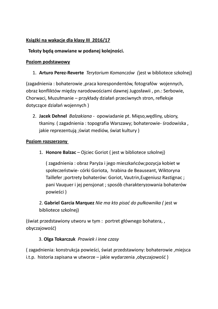 Książki na wakacje dla klasy III 2016/17 Teksty będą omawiane w podanej kolejności. Poziom podstawowy 1. Arturo Perez-Reverte Terytorium Komanczów (jest w bibliotece szkolnej) (zagadnienia : bohaterowie ,praca korespondentów, fotografów wojennych, obraz konfliktów między narodowościami dawnej Jugosławii , pn.: Serbowie, Chorwaci, Muzułmanie – przykłady działań przeciwnych stron, refleksje dotyczące działań wojennych ) 2. Jacek Dehnel Balzakiana - opowiadanie pt. Mięso,wędliny, ubiory, tkaniny. ( zagadnienia : topografia Warszawy; bohaterowie- środowiska , jakie reprezentują ;świat mediów, świat kultury ) Poziom rozszerzony 1. Honore Balzac – Ojciec Goriot ( jest w bibliotece szkolnej) ( zagadnienia : obraz Paryża i jego mieszkańców;pozycja kobiet w społeczeństwie- córki Goriota, hrabina de Beauseant, Wiktoryna Taillefer ;portrety bohaterów: Goriot, Vautrin,Eugeniusz Rastignac ; pani Vauquer i jej pensjonat ; sposób charakteryzowania bohaterów powieści ) 2. Gabriel Garcia Marquez Nie ma kto pisać do pułkownika ( jest w bibliotece szkolnej) (świat przedstawiony utworu w tym : portret głównego bohatera, , obyczajowość) 3. Olga Tokarczuk Prawiek i inne czasy ( zagadnienia: konstrukcja powieści, świat przedstawiony: bohaterowie ,miejsca i.t.p. historia zapisana w utworze – jakie wydarzenia ,obyczajowość )