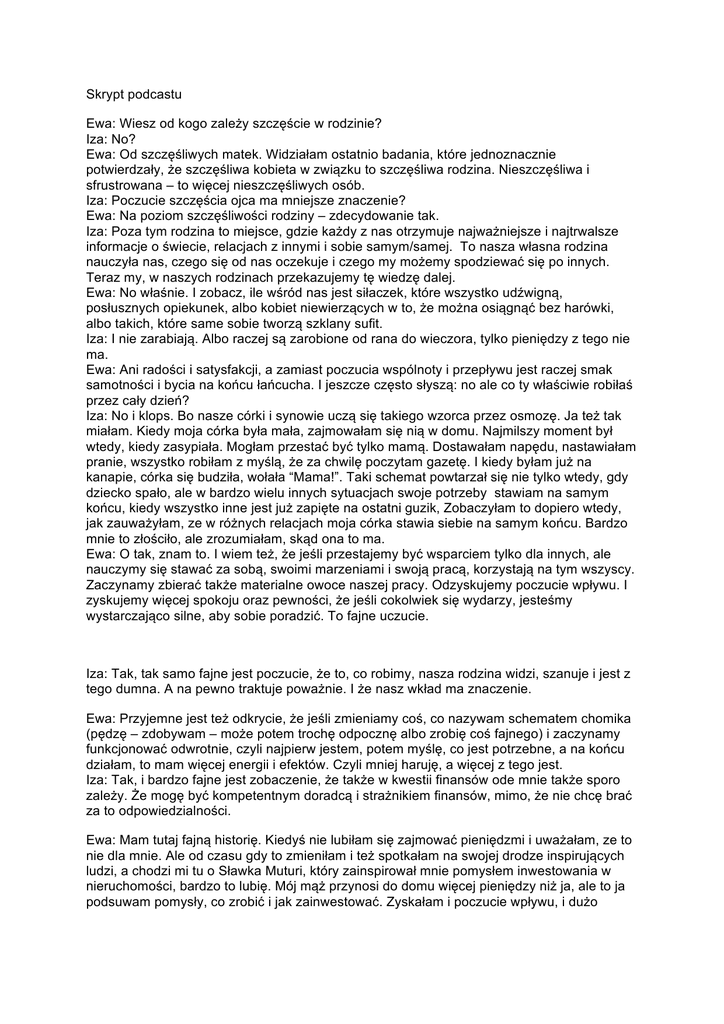 Skrypt podcastu Ewa: Wiesz od kogo zależy szczęście w rodzinie? Iza: No? Ewa: Od szczęśliwych matek. Widziałam ostatnio badania, które jednoznacznie potwierdzały, że szczęśliwa kobieta w związku to szczęśliwa rodzina. Nieszczęśliwa i sfrustrowana – to więcej nieszczęśliwych osób. Iza: Poczucie szczęścia ojca ma mniejsze znaczenie? Ewa: Na poziom szczęśliwości rodziny – zdecydowanie tak. Iza: Poza tym rodzina to miejsce, gdzie każdy z nas otrzymuje najważniejsze i najtrwalsze informacje o świecie, relacjach z innymi i sobie samym/samej. To nasza własna rodzina nauczyła nas, czego się od nas oczekuje i czego my możemy spodziewać się po innych. Teraz my, w naszych rodzinach przekazujemy tę wiedzę dalej. Ewa: No właśnie. I zobacz, ile wśród nas jest siłaczek, które wszystko udźwigną, posłusznych opiekunek, albo kobiet niewierzących w to, że można osiągnąć bez harówki, albo takich, które same sobie tworzą szklany sufit. Iza: I nie zarabiają. Albo raczej są zarobione od rana do wieczora, tylko pieniędzy z tego nie ma. Ewa: Ani radości i satysfakcji, a zamiast poczucia wspólnoty i przepływu jest raczej smak samotności i bycia na końcu łańcucha. I jeszcze często słyszą: no ale co ty właściwie robiłaś przez cały dzień? Iza: No i klops. Bo nasze córki i synowie uczą się takiego wzorca przez osmozę. Ja też tak miałam. Kiedy moja córka była mała, zajmowałam się nią w domu. Najmilszy moment był wtedy, kiedy zasypiała. Mogłam przestać być tylko mamą. Dostawałam napędu, nastawiałam pranie, wszystko robiłam z myślą, że za chwilę poczytam gazetę. I kiedy byłam już na kanapie, córka się budziła, wołała “Mama!”. Taki schemat powtarzał się nie tylko wtedy, gdy dziecko spało, ale w bardzo wielu innych sytuacjach swoje potrzeby stawiam na samym końcu, kiedy wszystko inne jest już zapięte na ostatni guzik, Zobaczyłam to dopiero wtedy, jak zauważyłam, ze w różnych relacjach moja córka stawia siebie na samym końcu. Bardzo mnie to złościło, ale zrozumiałam, skąd ona to ma. Ewa: O tak, znam to. I wiem też, że jeśli przestajemy być wsparciem tylko dla innych, ale nauczymy się stawać za sobą, swoimi marzeniami i swoją pracą, korzystają na tym wszyscy. Zaczynamy zbierać także materialne owoce naszej pracy. Odzyskujemy poczucie wpływu. I zyskujemy więcej spokoju oraz pewności, że jeśli cokolwiek się wydarzy, jesteśmy wystarczająco silne, aby sobie poradzić. To fajne uczucie. Iza: Tak, tak samo fajne jest poczucie, że to, co robimy, nasza rodzina widzi, szanuje i jest z tego dumna. A na pewno traktuje poważnie. I że nasz wkład ma znaczenie. Ewa: Przyjemne jest też odkrycie, że jeśli zmieniamy coś, co nazywam schematem chomika (pędzę – zdobywam – może potem trochę odpocznę albo zrobię coś fajnego) i zaczynamy funkcjonować odwrotnie, czyli najpierw jestem, potem myślę, co jest potrzebne, a na końcu działam, to mam więcej energii i efektów. Czyli mniej haruję, a więcej z tego jest. Iza: Tak, i bardzo fajne jest zobaczenie, że także w kwestii finansów ode mnie także sporo zależy. Że mogę być kompetentnym doradcą i strażnikiem finansów, mimo, że nie chcę brać za to odpowiedzialności. Ewa: Mam tutaj fajną historię. Kiedyś nie lubiłam się zajmować pieniędzmi i uważałam, ze to nie dla mnie. Ale od czasu gdy to zmieniłam i też spotkałam na swojej drodze inspirujących ludzi, a chodzi mi tu o Sławka Muturi, który zainspirował mnie pomysłem inwestowania w nieruchomości, bardzo to lubię. Mój mąż przynosi do domu więcej pieniędzy niż ja, ale to ja podsuwam pomysły, co zrobić i jak zainwestować. Zyskałam i poczucie wpływu, i dużo satysfakcji, ze te pieniądze mogą jeszcze na nas pracować, no i szacunek męża, który powtarza, że beze mnie pewnie byśmy je wydali albo gdzieś gniłyby na koncie. Iza: No to mamy jeszcze aspekt wewnętrznego krytyka. Jak powiedziała kiedyś jedna z naszych klientek po wspólnej pracy: nareszcie przestałam się czuć, jakby ktoś całymi dniami patrzał mi na ręce. I oceniał, czy wystarczająco dużo zrobiłam, aby zasłużyć. Teraz robię, co robię i daję sobie do tego prawo. A jeśli słyszę krytykę, potrafię usłyszeć to, co jest jej intencją, nie biorę jej już tak bardzo do siebie. Lepiej sobie z nią radzę i dzięki temu w sumie w domu jest spokojniej. Ewa: Bardzo to lubię w pracy nad sobą, gdy nagle okazuje się, że wszystkim wokół robi się jaśniej i lżej. Iza: i bogaciej, bo nagle wszystko staje się prostsze: i wycenianie, i rozmawianie o pieniądzach, i odmawianie, i stawanie za sobą, a to zawsze przynosi dobre efekty. Ewa: A kluczem do do tego wszystkiego jest przestawienie własnego autopilota w tryb spełnienia, doceniania i pieniędzy. Iza: Jeśli jesteś zainteresowana tym, czym taki autopilot jest i jak go przestroić, zapraszamy Cię do pobrania bezpłatnego materiału, do którego link znajdziesz w notatkach pod tym podcastem