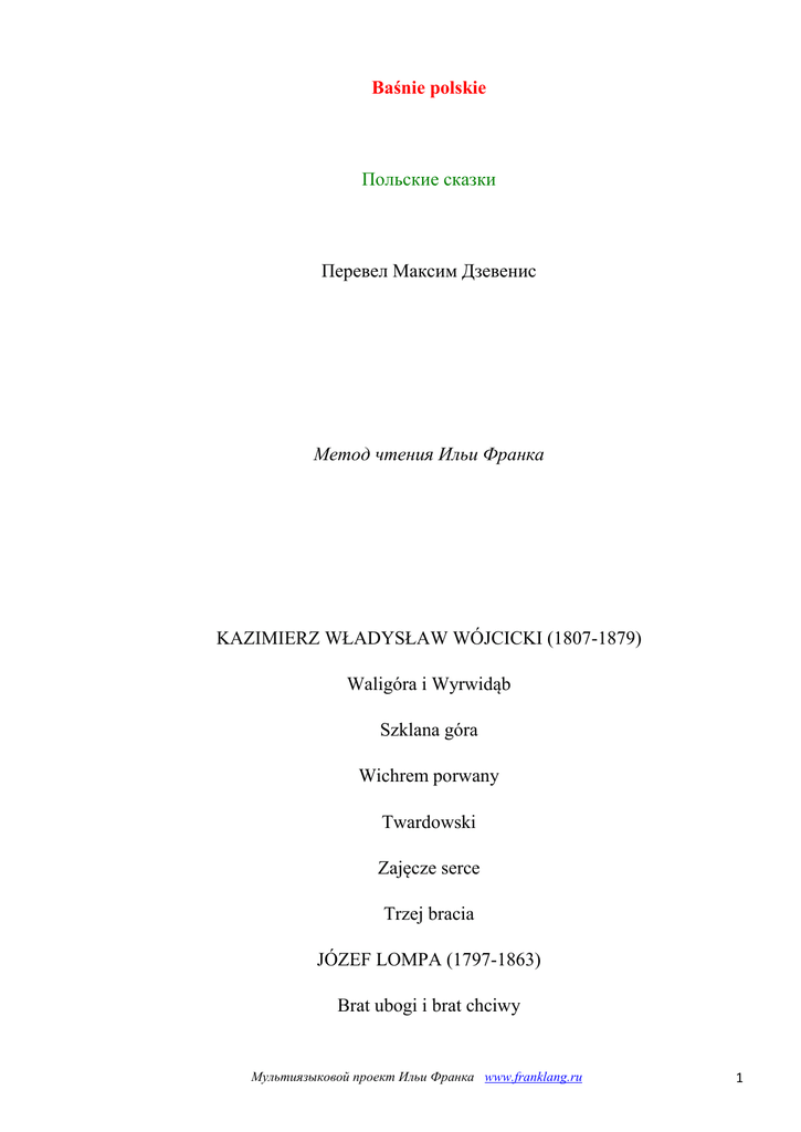 Baśnie polskie Польские сказки Перевел Максим Дзевенис Метод чтения Ильи Франка KAZIMIERZ WŁADYSŁAW WÓJCICKI (1807-1879) Waligóra i Wyrwidąb Szklana góra Wichrem porwany Twardowski Zajęcze serce Trzej bracia JÓZEF LOMPA (1797-1863) Brat ubogi i brat chciwy Мультиязыковой проект Ильи Франка www.franklang.ru 1 Zły brat RYSZARD BERWIŃSKI (1819-1879) Mądry Maciuś ANTONI JÓZEF GLIŃSKI (1817-1866) O kmiotku i o soczewicy O czarowniku i jego uczniu LUCJAN SIEMIEŃSK1 (1809-1877) Królowa Bałtyku JÓZEF IGNACY KRASZEWSKI (1812-1887) Z chłopa król ADOLF DYGASIŃSKI (1839-1902) O zajączku sprawiedliwym BOLESŁAW PRUS (1847-1912) O uśpionej pannie i zaklętych skarbach na dnie potoku WŁODZIMIERZ PERZYŃSKI (1878-1930) O szczupaku, który umiał tańczyć JAN KASPROWICZ (1860-1926) O królu wężów i o walecznym a czystym młodziencu Perłowicu Мультиязыковой проект Ильи Франка www.franklang.ru 2 Antoni Józef Gliński (Антони Юзеф Глиньский) O czarowniku i jego uczniu (о колдуне и его ученике; uczeń — ученик) Był sobie szewc ubogi (был = жил себе бедный сапожник), pijak zawołany (пьяница заправский; zawołany — призванный; прирождённый, заправский), i miał poczciwą żonę (и была у него славная жена: «и имел славную жену»; mieć — иметь), syna jedynaka i kilka córek (единственный сын и несколько дочерей; jedynak — единственный сын). Syn miał już lat kilkanaście (сыну было уже более десяти лет = сын был уже взрослый; ile masz lat? — сколько тебе лет?; kilkanaście — более десяти /в пределах второго десятка/), a więc troskliwa matka ubrała go (следовательно = поэтому заботливая мать одела его; więc — итак, стало быть, следовательно; troska — забота), jak mogła (как могла), główkę gładko uczesała (головку гладко причесала), czule go ucałowała (нежно его поцеловала), w kościele nabożnie się z nim pomodliła i w daleką go drogę poprowadziła (в цервки набожно с ним помолилась и повела его в далёкую дорогу; kościół — церковь, храм; костёл), do stołecznego miast (в столичный город), by go do jakiego majstra na termin oddać i poczciwego jakiego rzemiosła nauczyć (чтобы его к какому-нибудь мастеру отдать в ученики и какомунибудь славному ремеслу научить; jaki — какой; разг. какой-нибудь; termin — ученичество /у мастера/, oddać do terminu — отдать в ученики; nauczyć czegoś — научить чему-л.). Był sobie szewc ubogi, pijak zawołany, i miał poczciwą żonę, syna jedynaka i kilka córek. Мультиязыковой проект Ильи Франка www.franklang.ru 3 Syn miał już lat kilkanaście, a więc troskliwa matka ubrała go, jak mogła, główkę gładko uczesała, czule go ucałowała, w kościele nabożnie się z nim pomodliła i w daleką go drogę poprowadziła, do stołecznego miasta, by go do jakiego majstra na termin oddać i poczciwego jakiego rzemiosła nauczyć. Gdy już byli w połowie drogi (когда они уже были на полпути; połowa — половина; droga — дорога, путь; w połowie drogi — на полпути), napotkał ich jakiś szlachcic w czarnej kapocie (встретил их какой-то шляхтич в чёрном кафтане; szlachcic — шляхтич; дворянин, kapota — балахон; кафтан), upodobał chłopca i namawiał go do siebie na naukę (полюбил парня и уговаривал его /пойти/ к себе учиться; do — к; nauka — обучение, учение, учёба; oddać na naukę — отдать в школу/учиться); ale że staruszkę zwykłym chrześcijańskim pozdrowieniem nie powitał i coś mu źle z oczu patrzyło (но, так как он старушку обычным христианским приветствием не приветствовал, и по глазам было видно, что он замышляет плохое: «что-то плохое ему из глаз смотрело»; patrzeć — смотреть; złe patrzy mu z oczu — сразу/по глазам видно, что он плохое замышляет), a bardziej jeszcze (а ещё больше /оттого/), że rzemiosła swego wymienić nie chciał (что ремесла своего назвать не хотел) — staruszka swego syna powierzyć mu nie chciała i wreszcie tak go ofuknęła (старушка своего сына доверить ему не хотела и в конце концов так на него прикрикнула; wreszcie — наконец, в конце концов; ofuknąć kogoś — прикрикнуть на кого-л.), że się odczepił i w tyle pozostał (что он /от них/ отцепился и отстал; tył — зад; pozostać — остаться; pozostać w tyle — остаться позади; отстать). Gdy już byli w połowie drogi, napotkał ich jakiś szlachcic w czarnej kapocie, upodobał chłopca i namawiał go do siebie na naukę; ale że staruszkę zwykłym chrześcijańskim pozdrowieniem nie powitał i coś mu źle z oczu patrzyło, a Мультиязыковой проект Ильи Франка www.franklang.ru 4 bardziej jeszcze,