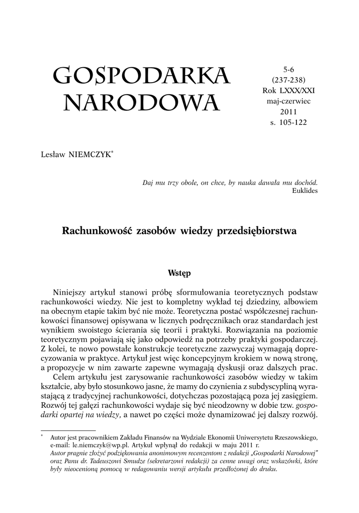 GOSPODARKA NARODOWA 5-6 (237-238) Rok LXXX/XXI maj-czerwiec 2011 s. 105-122 Lesław NIEMCZYK* Daj mu trzy obole, on chce, by nauka dawała mu dochód. Euklides Rachunkowość zasobów wiedzy przedsiębiorstwa Wstęp Niniejszy artykuł stanowi próbę sformułowania teoretycznych podstaw rachunkowości wiedzy. Nie jest to kompletny wykład tej dziedziny, albowiem na obecnym etapie takim być nie może. Teoretyczna postać współczesnej rachunkowości finansowej opisywana w licznych podręcznikach oraz standardach jest wynikiem swoistego ścierania się teorii i praktyki. Rozwiązania na poziomie teoretycznym pojawiają się jako odpowiedź na potrzeby praktyki gospodarczej. Z kolei, te nowo powstałe konstrukcje teoretyczne zazwyczaj wymagają doprecyzowania w praktyce. Artykuł jest więc koncepcyjnym krokiem w nową stronę, a propozycje w nim zawarte zapewne wymagają dyskusji oraz dalszych prac. Celem artykułu jest zarysowanie rachunkowości zasobów wiedzy w takim kształcie, aby było stosunkowo jasne, że mamy do czynienia z subdyscypliną wyrastającą z tradycyjnej rachunkowości, dotychczas pozostającą poza jej zasięgiem. Rozwój tej gałęzi rachunkowości wydaje się być nieodzowny w dobie tzw. gospodarki opartej na wiedzy, a nawet po części może dynamizować jej dalszy rozwój. * Autor jest pracownikiem Zakładu Finansów na Wydziale Ekonomii Uniwersytetu Rzeszowskiego, e-mail: [email protected]. Artykuł wpłynął do redakcji w maju 2011 r. Autor pragnie złożyć podziękowania anonimowym recenzentom z redakcji „Gospodarki Narodowej” oraz Panu dr. Tadeuszowi Smudze (sekretarzowi redakcji) za cenne uwagi oraz wskazówki, które były nieocenioną pomocą w redagowaniu wersji artykułu przedłożonej do druku. 106 GOSPODARKA NARODOWA Nr 5-6/2011 Rachunkowość wiedzy powstała w wyniku zastosowania dwóch metod badawczych – semiotycznej oraz aksjomatycznej. W obszarze metody językowej poddano badaniu dwa zasadnicze terminy, tj. „wiedza” oraz „aktywa”. Poprzez zarysowanie analogii pomiędzy pojęciami odróżniono tradycyjne, tj. wąskie rozumienie terminu „aktywa” – jako zbywalny majątek – od pojęcia rozumianego szeroko, a więc obejmującego swym zakresem również wiedzę. Podstawienie pojęcia „aktywów” sensu largo do systemu aksjomatów ekonomicznego programu badawczego Luca Paciolego [Niemczyk, 2010] pozwoliło dedukcyjnie wyprowadzić podstawowe twierdzenia rachunkowości wiedzy (np. z aksjomatu „aktywa = pasywa” wynika twierdzenie „aktywa kompetencyjne = kapitał intelektualny”). Rachunkowość wiedzy jest więc nurtem badawczym w obszarze programu Paciolego, którego przedmiotem jest rachunkowe okiełznanie zasobów wiedzy poprzez wykorzystanie własnego aparatu pojęciowego i instrumentów ewidencyjnych. Te instrumenty uzbrajają „oko” badacza-ekonomisty, aby precyzyjnie zobaczyć w przedsiębiorstwach to, o czym trzeba się było domyślać. Ich zastosowanie tworzy solidną podstawę informacyjną do zarządzania zasobami wiedzy kontrolowanymi przez przedsiębiorstwo, albowiem nie ma w jednostkach gospodarczych pełniejszego systemu informacji ekonomicznej od tego, który zapewnia rachunkowość finansowa. Niniejszy artykuł jest pokłosiem badań teoretycznych nad Filozofią przedsiębiorstwa Józefa Bocheńskiego prowadzonych w latach 2000-2005 w Katedrze Zarządzania Przedsiębiorstwem Uniwersytetu Ekonomicznego w Katowicach, kontynuowanych w Zakładzie Finansów Uniwersytetu Rzeszowskiego. Warto przypomnieć, że Bocheński w analizie logicznej z 1985 roku pisał: „Otóż obok kapitału i siły roboczej znajdujemy w niemal wszystkich przedsiębiorstwach przemysłowych jeszcze trzeci element, a mianowicie wynalazczość techniczną. Zdaje się, że Proudhon zwrócił pierwszy uwagę na ten czynnik, który nazwał „geniuszem” („génie”); natomiast Marks i wielu innych potraktowało ten czynnik jako rodzaj siły roboczej. Powinno być jednak jasne, że taka redukcja nie jest dopuszczalna” [Bocheński, 1993b]. Z perspektywy teorii rachunkowości uzasadnieniem podejmowanego kierunku badań mogą być słowa Benedykta Cotruglio, który w Księdze o sztuce handlu z 1458 roku podjął pierwszą znaną próbę opisu praktyki księgowości podwójnej, a zarazem podkreślał znaczenie wiedzy w działalności gospodarczej. Cotruglio rozpoczynając rozdział O wiedzy kupca pisał: „Kiedy dochodzę do wiedzy kupieckiej, jaka i ile winno jej być, i zaczynam o tym myśleć, tracę siły, gdyż kieruje mnie to do nieskończoności. (...) Zalecę więc i pokrótce omówię, jakie są główne nauki, bez których kupiec jest pusty i próżny. I niechaj powstrzymają się owi ignoranci, którzy twierdzą, że kupiec nie powinien być wykształcony” [Cotruglio B., 2007, s. 121]. Współczesną instytucjonalną formą działalności kupieckiej jest przedsiębiorstwo, które pozyskuje, wykorzystuje, a nierzadko i rozwija wiedzę. Wydaje się, iż nadszedł czas, aby zacząć to uwzględniać w ewidencji i sprawozdawczości finansowej. Lesław Niemczyk, Rachunkowość zasobów wiedzy przedsiębiorstwa 107 Rewolucje gospodarcze a rachunek zasobów ekonomicznych Ryzykując pewnym uproszczeniem można zarysować związek pomiędzy okresem historii gospodarczej a formowaniem się koncepcji poszczególnych zasobów ekonomicznych. W swej istocie zasoby wydają się być stałe i niezmienne. Natomiast realne procesy gospodarcze w różnych okresach koncentrowały się na wybranych czynnikach wytwórczych pomijając pozostałe jako oczywistość niewartą większej atencji. Toteż dobór aparatu pojęciowego rachunkowości i akcenty jej teorii nierównomiernie rozkładały się na przestrzeni wieków. Pierwsza rewolucja gospodarcza – rewolucja agrarna – niewątpliwie była wynikiem wzrostu i upowszechniania się wiedzy o procesach uprawy roślin oraz hodowli zwierząt. Jednakże materialną podstawą działalności rolnic