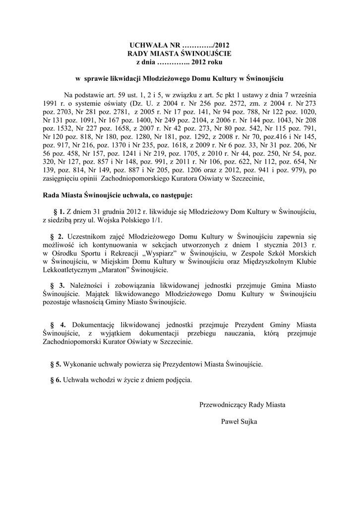 UCHWAŁA NR …………./2012 RADY MIASTA ŚWINOUJŚCIE z dnia ………….. 2012 roku w sprawie likwidacji Młodzieżowego Domu Kultury w Świnoujściu Na podstawie art. 59 ust. 1, 2 i 5, w związku z art. 5c pkt 1 ustawy z dnia 7 września 1991 r. o systemie oświaty (Dz. U. z 2004 r. Nr 256 poz. 2572, zm. z 2004 r. Nr 273 poz. 2703, Nr 281 poz. 2781, z 2005 r. Nr 17 poz. 141, Nr 94 poz. 788, Nr 122 poz. 1020, Nr 131 poz. 1091, Nr 167 poz. 1400, Nr 249 poz. 2104, z 2006 r. Nr 144 poz. 1043, Nr 208 poz. 1532, Nr 227 poz. 1658, z 2007 r. Nr 42 poz. 273, Nr 80 poz. 542, Nr 115 poz. 791, Nr 120 poz. 818, Nr 180, poz. 1280, Nr 181, poz. 1292, z 2008 r. Nr 70, poz.416 i Nr 145, poz. 917, Nr 216, poz. 1370 i Nr 235, poz. 1618, z 2009 r. Nr 6 poz. 33, Nr 31 poz. 206, Nr 56 poz. 458, Nr 157, poz. 1241 i Nr 219, poz. 1705, z 2010 r. Nr 44, poz. 250, Nr 54, poz. 320, Nr 127, poz. 857 i Nr 148, poz. 991, z 2011 r. Nr 106, poz. 622, Nr 112, poz. 654, Nr 139, poz. 814, Nr 149, poz. 887 i Nr 205, poz. 1206 oraz z 2012, poz. 941 i poz. 979), po zasięgnięciu opinii Zachodniopomorskiego Kuratora Oświaty w Szczecinie, Rada Miasta Świnoujście uchwala, co następuje: § 1. Z dniem 31 grudnia 2012 r. likwiduje się Młodzieżowy Dom Kultury w Świnoujściu, z siedzibą przy ul. Wojska Polskiego 1/1. § 2. Uczestnikom zajęć Młodzieżowego Domu Kultury w Świnoujściu zapewnia się możliwość ich kontynuowania w sekcjach utworzonych z dniem 1 stycznia 2013 r. w Ośrodku Sportu i Rekreacji „Wyspiarz” w Świnoujściu, w Zespole Szkół Morskich w Świnoujściu, w Miejskim Domu Kultury w Świnoujściu oraz Międzyszkolnym Klubie Lekkoatletycznym „Maraton” Świnoujście. § 3. Należności i zobowiązania likwidowanej jednostki przejmuje Gmina Miasto Świnoujście. Majątek likwidowanego Młodzieżowego Domu Kultury w Świnoujściu pozostaje własnością Gminy Miasto Świnoujście. § 4. Dokumentację likwidowanej jednostki przejmuje Prezydent Gminy Miasta Świnoujście, z wyjątkiem dokumentacji przebiegu nauczania, którą przejmuje Zachodniopomorski Kurator Oświaty w Szczecinie. § 5. Wykonanie uchwały powierza się Prezydentowi Miasta Świnoujście. § 6. Uchwała wchodzi w życie z dniem podjęcia. Przewodniczący Rady Miasta Paweł Sujka Uzasadnienie Rada Miasta Świnoujście w dniu 23 lutego 2012 r. podjęła uchwałę Nr XXI/169/2012 w sprawie zamiaru likwidacji Młodzieżowego Domu Kultury w Świnoujściu z dniem 31 sierpnia 2012 r., a następnie uchwałę Nr XXII/173/2012 z dnia 29 marca 2012 roku, zmieniającą termin zamiaru likwidacji Młodzieżowego Domu Kultury w Świnoujściu na dzień 31 grudnia 2012 r. Zgodnie z art. 59 ust. 1 ustawy z dnia 7 września 1991 r. o systemie oświaty (Dz. U. z 2004 r. Nr 256 z późniejszymi zmianami) organ prowadzący jest obowiązany, co najmniej na 6 miesięcy przed terminem likwidacji, zawiadomić o zamiarze likwidacji szkoły rodziców uczniów. Wszyscy rodzice zostali powiadomieni o zamiarze likwidacji placówki w trybie określonym w kodeksie postępowania administracyjnego. Zapis art. 59 ust. 2 ustawy z dnia 7 września 1991 r. o systemie oświaty (Dz. U. z 2004 r. Nr 256 z późniejszymi zmianami) stanowi, że szkoła lub placówka publiczna prowadzona przez jednostkę samorządu terytorialnego może zostać zlikwidowana po zasięgnięciu opinii organu sprawującego nadzór pedagogiczny. Zamiar likwidacji Młodzieżowego Domu Kultury w Świnoujściu, określony w uchwale Nr XXI/169/2012 Rady Miasta Świnoujście z dnia 23 lutego 2012 roku, został pozytywnie zaopiniowany przez Zachodniopomorskiego Kuratora Oświaty w Szczecinie pismem KO-I.WS.MZ.542.61.2012 z dnia 9 marca 2012 r. i pozytywna opinia została podtrzymana przez Zachodniopomorskiego Kuratora Oświaty pismem znak: KO-II.542.61.2012.WS z dnia 17 kwietnia 2012 r. w stosunku do terminu określonego uchwałą Nr XXII/173/2012 z dnia 29 marca 2012 r. W sprawie likwidacji placówki organ prowadzący zasięgał również opinii związków zawodowych. W miesiącu kwietniu odbyło się spotkanie z rodzicami dzieci uczęszczających na zajęcia do Młodzieżowego Domu Kultury w Świnoujściu, a także ze wszystkimi instruktorami łącznie. W miesiącach czerwiec – sierpień odbyły się spotkania z instruktorami prowadzącymi zajęcia w poszczególnych sekcjach. Wszystkie spotkania odbywały się przy udziale przedstawiciela Rady Rodziców i dyrektora Młodzieżowego Domu Kultury w Świnoujściu oraz dyrektorów instytucji i klubów sportowych prowadzących zajęcia zgodne z profilami sekcji placówki, a ich celem było znalezienie optymalnego rozwiązania możliwości kontynuowania działalności sekcji. W wyniku spotkań i prowadzonych rozmów ustalono, co następuje: 1) wszyscy instruktorzy, dotychczas prowadzący zajęcia z dziećmi i młodzieżą, oświadczyli wolę ich kontynuowania do końca roku szkolnego, w tym do 31 grudnia 2012 w strukturach Młodzieżowego Domu Kultury, a po podjęciu przez Radę Miasta Świnoujście uchwały o likwidacji placówki od 1 stycznia 2013 r. do końca roku szkolnego 2012/2013 i w latach następnych: a) sekcje piłki nożnej, siatkowej i koszykowej oraz sekcja pływacka – w strukturach Ośrodka Sportu i Rekreacji „Wyspiarz” w Świnoujściu; w przypadku sekcji pływackiej z dniem 1 stycznia 2013 r. zmieni się osoba prowadząca zajęcia – dotychczasowy instruktor przygotował swojego następcę, który już współpracując z grupami jest akceptowany przez uczestników sekcji i ich rodziców; b) sekcja lekkoatletyczna – w strukturach Międzyszkolnego Klubu Lekkoatletycznego „Maraton” Świnoujście; c) sekcja aerobic – w strukturach Miejskiego Domu Kultury; 2) 3) 4) 5) d) sekcja żeglarska – w strukturach Zespołu Szkół Morskich w Świnoujściu; pracownicy przystani żeglarskiej w Świnoujściu – Łunowie, w związku z przejęciem przez Zespół Szkół Morskich części mienia i zadań Młodzieżowego Domu Kultury w tym 