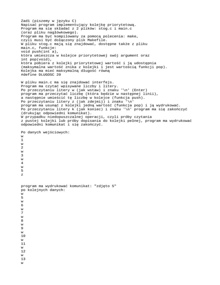 Zad1 (piszemy w języku C) Napisać program implementujący