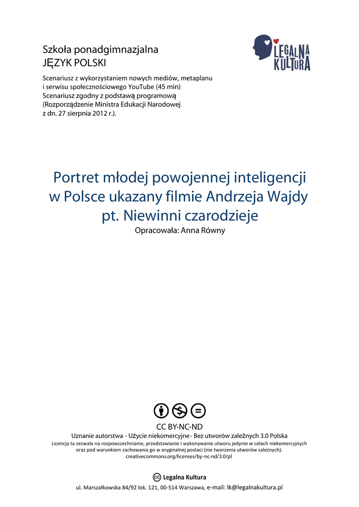 Szkoła ponadgimnazjalna JĘZYK POLSKI Scenariusz z wykorzystaniem nowych mediów, metaplanu i serwisu społecznościowego YouTube (45 min) Scenariusz zgodny z podstawą programową (Rozporządzenie Ministra Edukacji Narodowej z dn. 27 sierpnia 2012 r.). Portret młodej powojennej inteligencji w Polsce ukazany filmie Andrzeja Wajdy pt. Niewinni czarodzieje Opracowała: Anna Równy CC BY-NC-ND Uznanie autorstwa - Użycie niekomercyjne - Bez utworów zależnych 3.0 Polska Licencja ta zezwala na rozpowszechnianie, przedstawianie i wykonywanie utworu jedynie w celach niekomercyjnych oraz pod warunkiem zachowania go w oryginalnej postaci (nie tworzenia utworów zależnych). creativecommons.org/licenses/by-nc-nd/3.0/pl ul. Marszałkowska 84/92 lok. 121, 00-514 Warszawa, e-mail: [email protected] Cele lekcji: Uczeń: - doskonali umiejętność analizy i interpretacji filmu; - utrwala terminy z zakresu języka filmu; - ocenia przydatność filmu jako źródła wiedzy o świecie i historii; - nabywa umiejętności potrzebnych do życia w społeczeństwie informacyjnym. Metody: - praca z tekstami kultury (film, plakat, piosenka do filmu); - praca indywidualna w domu; - praca w grupach; - metaplan; - miniwykład. Środki dydaktyczne: - karty pracy; - dostęp do Internetu; - rzutnik multimedialny/tablica interaktywna. Przed lekcją: Lekcję można przeprowadzić po omówieniu Tanga Sławomira Mrożka i potraktować ją jako uzupełnienie tematu o obrazie inteligencji czasów PRL-u. Nauczyciel prezentuje uczniom stronę internetową http://www.youtube.com/studiofilmowekadr, na której każdy, legalnie i bezpłatnie może obejrzeć wybrany film wyprodukowany w studiu filmowym Kadr oraz prosi o obejrzenie filmu Andrzeja Wajdy pt. Niewinni czarodzieje (link: http://www.youtube.com/watch?v=9llc8x4O68). Rozdaje też uczniom Kartę pracy w domu i poleca jej wypełnienie przed zajęciami. Powiązanie z podstawa programową z języka polskiego: I. Analiza i interpretacja tekstów kultury. Uczeń zna teksty literackie i inne teksty kultury wskazane przez nauczyciela: - wybrane filmy z twórczości polskich reżyserów (np. Krzysztofa Kieślowskiego, Andrzeja Munka, Andrzeja Wajdy, Krzysztofa Zanussiego); II. Analiza i interpretacja tekstów kultury. 1.Wstępne rozpoznanie. Uczeń: 1) prezentuje własne przeżycia wynikające z kontaktu z dziełem sztuki; 2) określa problematykę utworu; 2. Analiza. Uczeń: 4) rozpoznaje w utworze sposoby kreowania świata przedstawionego i bohatera (narracja ,fabuła, sytuacja liryczna, akcja); 3. Interpretacja. Uczeń: 1) wykorzystuje w interpretacji elementy znaczące dla odczytania sensu utworu (np. słowa-klucze, wyznaczniki kompozycji); 2) wykorzystuje w interpretacji utworu konteksty (np. literackie, kulturowe, filozoficzne, religijne); 3) porównuje funkcjonowanie tych samych motywów w różnych utworach literackich; 4) odczytuje treści alegoryczne i symboliczne utworu. 4. Wartości i wartościowanie. Uczeń: 2) dostrzega obecne w utworach literackich oraz innych tekstach kultury wartości narodowe i uniwersalne; 3) dostrzega w świecie konflikty wartości (np. równości i wolności, sprawiedliwości i miłosierdzia) oraz rozumie źródła tych konfliktów III. Tworzenie wypowiedzi. 1. Mówienie i pisanie. Uczeń: 1) tworzy dłuższy tekst pisany lub mówiony (rozprawka, recenzja, referat, interpretacja utworu literackiego lub fragmentu) zgodnie z podstawowymi regułami jego organizacji, przestrzegając zasad spójności znaczeniowej i logicznej; 2) przygotowuje wypowiedź (wybiera formę gatunkową i odpowiedni układ kompozycyjny, analizuje temat, wybiera formę kompozycyjną, sporządza plan wypowiedzi, dobiera właściwe słownictwo); 3) tworzy samodzielną wypowiedź argumentacyjną. Przebieg lekcji: FAZA WSTĘPNA Nauczyciel rozpoczyna lekcję od sprawdzenia pracy domowej. Uczniowie ustalają, że czas akcji ogranicza się do 24 godzin, wydarzenia rozgrywają się w Warszawie (klub „Stodoła” koło Pałacu Kultury i Nauki, „Largactil” na Starym Mieście, sportowa Hala Gwardii) w latach 50-tych XX wieku. Bohaterami są młodzi, wykształceni ludzie. Bazyli (Andrzej) jest lekarzem sportowym, a Pelagia prawdopodobnie studentką. Nauczyciel wysłuchuje przemyśleń uczniów i łączy ich odpowiedzi z kontekstem historycznym (film został zrealizowany po wydarzeniach w 1956 roku, pokazuje obraz Polski czasów stalinizmu i konsekwencje wpływu władzy totalitarnej na młode pokolenie inteligencji w Polsce). Zwraca również uwagę na fakt, że nie jest to film historyczny, raczej esej socjologiczny, próba fabularyzowanego dokumentu. Cytuje wypowiedź Andrzeja Wajdy: „Niewinni czarodzieje są dziś pewnie jednym z najbardziej obojętnych politycznie filmów, jakie zrealizowałem. Całkowicie inaczej oceniały go jednak władze z czasów Gomułki. Niewinny temat młodego lekarza, który lubi elastyczne skarpetki i dobre papierosy, posiada magnetofon i nagrywa na nim swoje dialogi z dziewczętami, którego jedyną pasją jest gra na perkusji w jazzowym zespole Krzysztofa Komedy − okazał się bardziej drażliwy dla ideologów-wychowawców niż Armia Krajowa i powstanie warszawskie”. (źródło: http://www.wajda.pl/pl/filmy/film05.html) Elementy autotematyczne: - w pierwszej sekwencji Mirka (Wanda Koczeska) przechodzi koło plakatu do filmu Niewinni czarodzieje; - wśród postaci filmowych pojawiają się aktorzy, którzy grają samych siebie: Krzysztof Komeda (muzyk jazzowy), Andrzej Trzaskowski (trębacz), Sława Przybylska (piosenkarka), itd.; - piosenka Sławy Przybylskiej Była pogoda pojawia się w filmie dwukrotnie: pierwszy raz jest odśpiewana przez piosenkarkę w klubie „Largactil” (w filmie Manekin), drugi raz słyszymy ją w radiu, w domu Andrzeja, zapowiadaną przez speakera jako „piosenkę z filmu Niewinni czarodzieje, śpiewaną przez Sławę Przybylską”. FAZA REALIZACYJNA Nauczyciel zwraca uwagę na znaczenie piosenki, plakatu fil