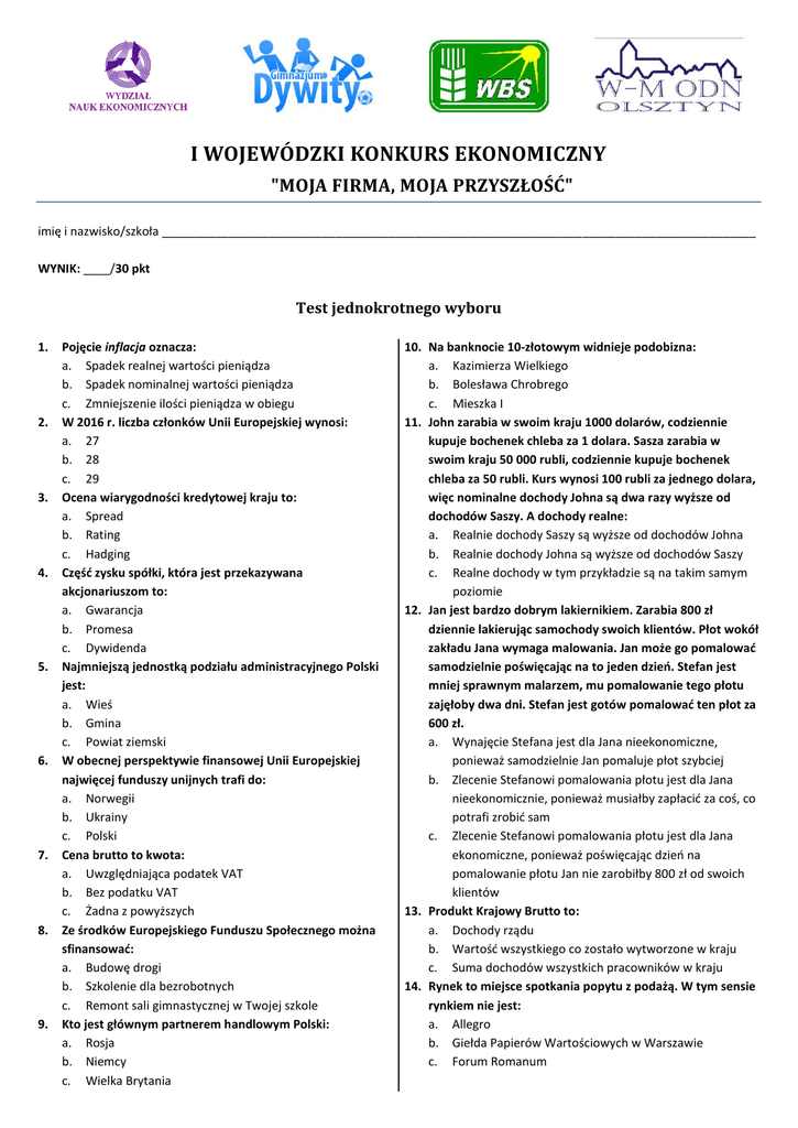 I WOJEWÓDZKI KONKURS EKONOMICZNY "MOJA FIRMA, MOJA PRZYSZŁOŚĆ" imię i nazwisko/szkoła _________________________________________________________________________________________ WYNIK: ____/30 pkt Test jednokrotnego wyboru 1. 2. 3. 4. 5. 6. 7. 8. 9. Pojęcie inflacja oznacza: a. Spadek realnej wartości pieniądza b. Spadek nominalnej wartości pieniądza c. Zmniejszenie ilości pieniądza w obiegu W 2016 r. liczba członków Unii Europejskiej wynosi: a. 27 b. 28 c. 29 Ocena wiarygodności kredytowej kraju to: a. Spread b. Rating c. Hadging Część zysku spółki, która jest przekazywana akcjonariuszom to: a. Gwarancja b. Promesa c. Dywidenda Najmniejszą jednostką podziału administracyjnego Polski jest: a. Wieś b. Gmina c. Powiat ziemski W obecnej perspektywie finansowej Unii Europejskiej najwięcej funduszy unijnych trafi do: a. Norwegii b. Ukrainy c. Polski Cena brutto to kwota: a. Uwzględniająca podatek VAT b. Bez podatku VAT c. Żadna z powyższych Ze środków Europejskiego Funduszu Społecznego można sfinansować: a. Budowę drogi b. Szkolenie dla bezrobotnych c. Remont sali gimnastycznej w Twojej szkole Kto jest głównym partnerem handlowym Polski: a. Rosja b. Niemcy c. Wielka Brytania 10. Na banknocie 10-złotowym widnieje podobizna: a. Kazimierza Wielkiego b. Bolesława Chrobrego c. Mieszka I 11. John zarabia w swoim kraju 1000 dolarów, codziennie kupuje bochenek chleba za 1 dolara. Sasza zarabia w swoim kraju 50 000 rubli, codziennie kupuje bochenek chleba za 50 rubli. Kurs wynosi 100 rubli za jednego dolara, więc nominalne dochody Johna są dwa razy wyższe od dochodów Saszy. A dochody realne: a. Realnie dochody Saszy są wyższe od dochodów Johna b. Realnie dochody Johna są wyższe od dochodów Saszy c. Realne dochody w tym przykładzie są na takim samym poziomie 12. Jan jest bardzo dobrym lakiernikiem. Zarabia 800 zł dziennie lakierując samochody swoich klientów. Płot wokół zakładu Jana wymaga malowania. Jan może go pomalować samodzielnie poświęcając na to jeden dzień. Stefan jest mniej sprawnym malarzem, mu pomalowanie tego płotu zajęłoby dwa dni. Stefan jest gotów pomalować ten płot za 600 zł. a. Wynajęcie Stefana jest dla Jana nieekonomiczne, ponieważ samodzielnie Jan pomaluje płot szybciej b. Zlecenie Stefanowi pomalowania płotu jest dla Jana nieekonomicznie, ponieważ musiałby zapłacić za coś, co potrafi zrobić sam c. Zlecenie Stefanowi pomalowania płotu jest dla Jana ekonomiczne, ponieważ poświęcając dzień na pomalowanie płotu Jan nie zarobiłby 800 zł od swoich klientów 13. Produkt Krajowy Brutto to: a. Dochody rządu b. Wartość wszystkiego co zostało wytworzone w kraju c. Suma dochodów wszystkich pracowników w kraju 14. Rynek to miejsce spotkania popytu z podażą. W tym sensie rynkiem nie jest: a. Allegro b. Giełda Papierów Wartościowych w Warszawie c. Forum Romanum 15. Rządowy program „500+” to: a. Transfer skierowany do części obywateli b. Rządowy transfer skierowany do wszystkich obywateli c. Jeden z rodzajów podatku 16. Które z wymienionych dóbr są substytutami: a. Odtwarzacz dvd i płyta dvd z filmem b. „Rzeczpospolita” i „Gazeta Wyborcza” c. Ławka szkolna i tablica 17. Który z wymienionych czynników spowoduje większe zapotrzebowanie na motocykle? a. Spadek cen samochodów b. Spadek dochodów konsumentów c. Spadek cen motocykli 18. Które z poniższych twierdzeń jest prawdziwe? a. Zakup akcji oznacza nabycie praw własności do części majątku firmy-emitenta b. Akcja przynosi dochód zwany odsetkami c. Akcja jest papierem wartościowym o najmniejszym stopniu ryzyka 19. Które z poniższych zdań jest fałszywe? a. Rosnące podatki dochodowe zachęcają do podjęcia pracy b. Gospodarstwa domowe muszą wybierać między płacą a czasem wolnym w podejmowaniu decyzji o podjęciu pracy c. Związki zawodowe występują w imieniu swoich członków w negocjacjach z pracodawcami 20. Jeśli ekonomista mówi o użyteczności pewnego dobra, to ma na myśli: a. Popyt za to dobro b. Przydatność tego dobra c. Satysfakcję z konsumpcji tego dobra 21. Akcja jest papierem wartościowym, który: a. Może być emitowany przez Skarb Państwa b. Może być emitowany przez Spółki Akcyjne c. Obie odpowiedzi są prawidłowe 22. Kto ustala kursy akcji na Giełdzie Papierów Wartościowych? a. Makler b. Prezes giełdy c. Inwestorzy dokonując transakcji kupna i sprzedaży 23. Hossa oznacza: a. Wzrost Produktu Krajowego Brutto b. Spadek cen produktów i usług c. Wzrost cen akcji na Giełdzie Papierów Wartościowych w Warszawie 24. Bardziej ryzykowne papiery wartościowe to: a. Akcje b. Obligacje c. Ryzyko inwestycyjne w obu przypadkach jest jednakowe 25. Wymiana bezgotówkowa, czyli towar za towar bądź usługa za usługę to: a. Cashback b. Barter c. Paypass 26. Jakie jest oprocentowanie lokaty bankowej, jeżeli wpłacając 1 500 zł po roku wartość środków wzrośnie do 1 800 zł? a. 10% b. 20% c. 30% 27. Polskie banknoty wykonane są z papieru, którego głównym składnikiem jest: a. Pergamin b. Bawełna c. Włókno drewniane 28. Prezesem Narodowego Banku Polskiego jest obecnie: a. Marek Belka b. Leszek Balcerowicz c. Hanna Gronkiewicz-Waltz 29. Cena, po której spółki oferują swoje akcje na rynku pierwotnym to: a. Cena debiutu b. Cena emisyjna c. Cena nominalna 30. Największym źródłem dochodów budżetu państwa jest/są: a. Podatek PIT b. Fundusze unijne c. Podatek VAT