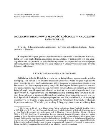 O. Michał LUKOSZEK OSPPE Wyższe Seminarium Duchowne Zakonu Paulinów w Krakowie STUDIA WARMIŃSKIE XLVII (2010) KOlEgIUM bISKUPóW A jEDNOść KOścIOłA W NAUczANIU jANA PAWłA II T r e ś ć: – 1. Kolegialna natura episkopatu. – 2. Formy kolegialnego działania. – Podsumowanie. – Riassunto Kolegium Biskupów posiada fundamentalne znaczenie w strukturze Kościoła. Jakie jest jego pochodzenie, znaczenie, misja, a także, w jaki sposób jest ona urzeczywistniana, oto pytania, na które będziemy starali się odpowiedzieć w niniejszym artykule, starając się odkrywać rolę jaką odgrywa w urzeczywistnianiu się i trwaniu jedności eklezjalnej. I. KOLEGIALNA NATURA EPISKOPATU Widzialna jedność Kościoła wyraża się w kolegialnym sprawowaniu władzy biskupiej. Jan Paweł II w swoim nauczaniu poświęca wiele miejsca wykładowi i przypomnieniu owej tradycyjnej nauki, której korzenie sięgają ustanowienia grona Dwunastu. Już lektura programowej encykliki Redemptor hominis pozwala zauważyć jednoznaczne opowiedzenie się, wówczas nowowybranego papieża, po stronie kolegialności i współodpowiedzialności za Kościół na wszystkich poziomach jego egzystencji1. S. Nagy zauważa, iż o niezaprzeczalnej afirmacji Jana Pawła II dla zasady kolegialności w rządzeniu Kościołem świadczy jego uczestnictwo we wszystkich Synodach Biskupów zwoływanych po Soborze Watykańskim II, a także pogląd wyrażony w tej kwestii w jego analizie doktryny Vaticanum II zawarty w studium U podstaw odnowy. W dziele tym, według S. Nagyego, ówczesny arcybiskup kra1 RH 5; por. A. D u l l e s, Blask wiary. Wizja teologiczna Jana Pawła II, Kraków 2003, s. 113–114; por. R. S ł u p e k, Nauczanie Jana Pawła II o kolegialności w Kościele Chrystusowym, w: Jana Pawła II inspiracje chrystologiczne, red. K. Kaucha, J. Mastej, Lublin – Kielce – Kraków 2006, s. 167–168; Jan Paweł II szczególnie docenia znaczenie instytucji Synodu, zajmującej ważne miejsce w życiu Kościoła, zarówno na szczeblu lokalnym, jak i uniwersalnym, a także wagę Konferencji Episkopatów oraz innych struktur kolegialnych, dzięki którym w świadomości Kościołów istnieje poczucie własnej tożsamości, a zarazem oryginalności w powszechnej jedności Kościoła. Jednocześnie podkreśla konieczność trwania wspomnianych instytucji w komunii z następcą św. Piotra, bez której kolegialność nie może być we właściwy sposób rozumiana. 216 O. MICHAŁ LUKOSZEK OSPPE kowski „dokonuje swoistej apologii katolickiej formuły kierowania Kościołem w oryginalnej syntezie prymatu i kolegialności”2. Przywołane opracowanie kard. K. Wojtyły zawiera stwierdzenie następującej treści: „Zasada kolegialności w szczególny sposób uwydatnia zasadę prymatu – jedno i drugie pochodzi z ustanowienia Chrystusa, i jedno i drugie wyraża ‘komunijną’ strukturę Kościoła jako Ludu Bożego a zarazem służby urzeczywistnianiu takiej struktury”3. I dalej pisze przyszły papież: „Chrystus stale buduje Kościół na ziemi jako swe Ciało poprzez to Ciało, o którym Vaticanum II mówi Corpus seu Collegium biskupów z racji następstwa po Apostołach. To Ciało konstytuujące Kościół w jego hierarchicznym ustroju bytuje i żyje mocą komunii wzajemnej wszystkich biskupów w Kościele, która uwarunkowana jest poprzez „komunię” względem wspólnego centrum: Stolicy Piotrowej”4. Kolegialność zatem oznacza sposób realizacji posłannictwa apostolskiego w Kolegium Biskupów działających w jedności z następcą św. Piotra. Urzeczywistnia się ona poprzez współudział i współodpowiedzialność biskupów w pasterskim przewodzeniu Kościołowi powszechnemu (w tym wypadku mówi się o kolegialności wertykalnej – cum Petro et sub Petro), a także w trosce o Kościoły lokalne (kolegialność horyzontalna). Pośród charakterystycznych cech kolegialności wyróżnia się jedność biskupów z papieżem oraz wzajemnie pomiędzy sobą, a także koordynację pasterskiej troski o Kościół5. A. Dulles, analizując myśl kard. K. Wojtyły zauważa, że według arcybiskupa krakowskiego kolegialności nie należy rozumieć w sensie politycznym lub socjologicznym, ale przede wszystkim w odniesieniu do komunii z Bogiem, poprzez którą Lud Boży jest mistyczną i nadprzyrodzoną jednością. Kolegialne działanie biskupów należy postrzegać jako widzialny znak communio Kościołów, którym przewodzą. Biskupi, jako przedstawiciele Kościołów partykularnych, a także różnych narodów i kultur, gromadzą się, aby osiągnąć jedność pod kierownictwem biskupa Rzymu6. Jan Paweł II dostrzega analogię pomiędzy Kolegium Apostołów, a Kolegium Biskupów zjednoczonym z następcą św. Piotra. Podobnie jak Apostołowie z Piotrem na czele tworzyli Kolegium, tak „poprzez osobistą sukcesję biskupa Rzymu objętą po św. Piotrze, a całej wspólnoty biskupów po Apostołach, biskup Rzymu i biskupi pozostają we wzajemnej łączności tworząc Kolegium”7. W ustanowieniu Apostołów, którzy otrzymali misję głoszenia Ewangelii i pasterskiego przewodzenia Kościołowi, widzi papież pierwszą podstawę zasady kolegialności. Ich misję kontynuują biskupi, którzy trwając w kolegialnej jedności odtwarzają pierwotną S. N a g y, Ty jesteś Piotr, Kraków 2003, s. 51. K. W o j t y ł a, U podstaw odnowy. Studium o realizacji Vaticanum II, Kraków 1988, s. 129–130. 4 Tamże, s. 129–130; por. B. K o m i n e k, Kościół po Soborze, Wrocław 2003, s. 24–25. 5 Z. K r z y s z o w s k i, Kolegializm, w: Leksykon Teologii Fundamentalnej, red. M. Rusecki, K. Kaucha, I.S. Ledwoń, J. Mastej, Lublin – Kraków 2002, 629; S.C. N a p i ó r k o w s k i, Kolegialność. II. Ujęcie katolickie. A. W Kościele powszechnym, w: EK, t. 9, k. 322. 6 A. D u l l e s, jw., s. 112. 7 PGr 8; por. S. N a g y, Soborowa nauka o kolegialności władzy w Kościele, w: Idee przewodnie soborowej konstytucji o