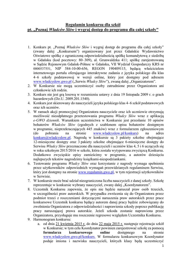 Regulamin konkursu dla szkół pt. „Poznaj Władców Słów i wygraj dostęp do programu dla całej szkoły” 1. Konkurs pt. „Poznaj Władców Słów i wygraj dostęp do programu dla całej szkoły” (zwany dalej „Konkursem”) organizowany jest przez Gdańskie Wydawnictwo Oświatowe spółkę z ograniczoną odpowiedzialnością spółkę komandytową z siedzibą w Gdańsku (kod pocztowy: 80–309), al. Grunwaldzka 411; spółkę zarejestrowaną w Sądzie Rejonowym Gdańsk-Północ w Gdańsku, VII Wydział Gospodarczy KRS nr 0000537551, NIP 584-10-00-656, REGON 190409115, będącą właścicielem internetowego portalu oferującego interaktywne zadania z języka polskiego dla klas 4–6 szkoły podstawowej w wersji online, który jest dostępny pod adresem www.wladcyslow.gwo.pl („Serwis Władcy Słów”), zwaną dalej „Organizatorem”. 2. W Konkursie nie mogą uczestniczyć osoby zatrudnione przez Organizatora ani członkowie ich rodzin. 3. Konkurs nie jest grą losową w rozumieniu ustawy z dnia 19 listopada 2009 r. o grach hazardowych (Dz.U. 2009.201.1540). 4. Konkurs jest skierowany do nauczycieli języka polskiego klas 4–6 szkół podstawowych oraz ich uczniów. 5. W ramach akcji promocyjnej Organizatora nauczyciele oraz ich uczniowie otrzymują możliwość nieodpłatnego przetestowania programu Władcy Słów wraz z aplikacją e-GWO dziennik. Warunkiem uczestnictwa w Konkursie jest przesłanie 10 opisów bohaterów Władców Słów (zgodnych z szablonem opisu bohaterów dostępnym w programie, nieprzekraczających 445 znaków) wraz z formularzem zgłoszeniowym (do pobrania na stronie www.wladcyslow.pl/konkurs) na adres [email protected]. Nagrodą w konkursie są 3 pakiety szkolne obejmujące 12-miesięczne dostępy oraz 3 pakiety szkolne obejmujące 6-miesięczne dostępy do Serwisu Władcy Słów przeznaczone dla nauczycieli i uczniów klas 4, 5 i 6 uczących się w roku szkolnym 2015/2016 w szkole, która została wytypowana zwycięzcą Konkursu. Dodatkowo zwycięskie opisy zamieścimy w programie, a autorów dziesięciu najlepszych tekstów nagrodzimy książkami-niespodziankami. 6. Testowanie programu Władcy Słów oraz korzystanie z nagrody wymaga spełnienia przez użytkowników odpowiednich wymagań przewidzianych regulaminem Serwisu, który jest dostępny na stronie www.regulamin.gwo.pl, w tym rejestracji użytkowników w Serwisie. 7. W konkursie może brać udział nieograniczona liczba nauczycieli z danej szkoły. Szkołę reprezentuje w konkursie wybrany nauczyciel, zwany dalej „Koordynatorem”. 8. Uczestnik Konkursu zapewnia, że opis nie będzie naruszał praw osób trzecich, w szczególności praw autorskich. W przypadku zwrócenia się do Organizatora przez podmiot trzeci z roszczeniami dotyczącymi naruszenia praw autorskich przez prace konkursowe Uczestnik konkursu będący autorem danej pracy będzie zobowiązany do zwolnienia Organizatora z odpowiedzialności i naprawienia szkody poprzez publikację pracy naruszającej prawa autorskie. Jeżeli szkoda zostanie naprawiona przez Organizatora, przysługuje mu roszczenie regresowe względem Uczestnika Konkursu. 9. Harmonogram konkursu: a. od dnia 21 kwietnia 2015 r. do dnia 22 maja 2015 r. następuje rejestracja szkół w Konkursie; w tym celu Koordynator powinien zarejestrować szkołę za pomocą formularza konkursowego online dostępnego na stronie www.wladcyslow.gwo.pl/konkurs. W formularzu konkursowym Koordynator podaje imiona i nazwiska nauczycieli, których klasy będą uczestniczyć 1 w bezpłatnym testowaniu programu Władcy Słów, oraz liczbę zamówionych dostępów uczniowskich; Koordynator po uzupełnieniu formularza otrzymuje na określony w formularzu adres e-mail kody dostępu do programu Władcy Słów. Koordynator przydziela nauczycielom biorącym udział w konkursie kody dostępu, a poszczególni nauczyciele przydzielają dostępy uczniom zgodnie z zapotrzebowaniem wskazanym w formularzu konkursowym; b. w terminie do dnia 31 maja 2015 r. odbywa się nieodpłatne testowanie programu Władcy Słów przez uczniów i nauczycieli; c. w terminie do dnia 22 maja 2015 r. nauczyciele powinni przesłać opisy bohaterów Władców Słów (każda praca powinna zawierać imię i nazwisko ucznia będącego autorem tekstu) wraz z formularzem zgłoszeniowym (do pobrania na stronie www.wladcyslow.pl/konkurs) na adres [email protected]; d. w terminie do dnia 29 maja 2015 r. Organizator ogłosi wyniki Konkursu, przyznając nagrody – nieodpłatne pakiety szkolne z dostępami do Serwisu Władcy Słów dla uczniów i ich nauczycieli z 6 szkół, z których przesłano zwycięskie opisy. Dodatkowo zwycięskie opisy zamieścimy w programie, a autorów dziesięciu najlepszych tekstów nagrodzimy książkami-niespodziankami. Wyniki zostaną opublikowane na stronie internetowej www.wladcyslow.gwo.pl/konkurs. 10. Nagrody zostaną przyznane decyzją komisji konkursowej wytypowanej przez Organizatora. Kryterium przyznawania nagrody jest arbitralna ocena podjęta przez członków komisji konkursowej. Nagrodzone zostaną najciekawsze opisy. 11. Nagrody nie podlegają wymianie na ekwiwalent pieniężny. 12. Dostarczenie nagród a. Koordynator wyśle Organizatorowi informację o liczbie uczniów klas 4, 5 i 6 uczących się w danej szkole oraz o liczbie nauczycieli języka polskiego na adres [email protected] w terminie do 30 września 2015 r. Z kodów dostępu mogą korzystać uczniowie oraz nauczyciele języka polskiego klas 4, 5 i 6 szkoły, która została wytypowana zwycięzcą Konkursu. Organizator w ciągu 14 dni roboczych od otrzymania informacji od Koordynatora dostarczy nagrody w formie kodów dostępu do Serwisu Władcy Słów poprzez wysłanie ich na wskazany w formularzu konkursowym adres e-mail Koordynatora. Liczba kodów dostępu odpowiada liczbie uczniów w klasach 4, 5 i 6 szkoły, która została wytypowana zwycięzcą Konkursu. Organizator wyśle indywidualne nagrody książki-niespodzianki na