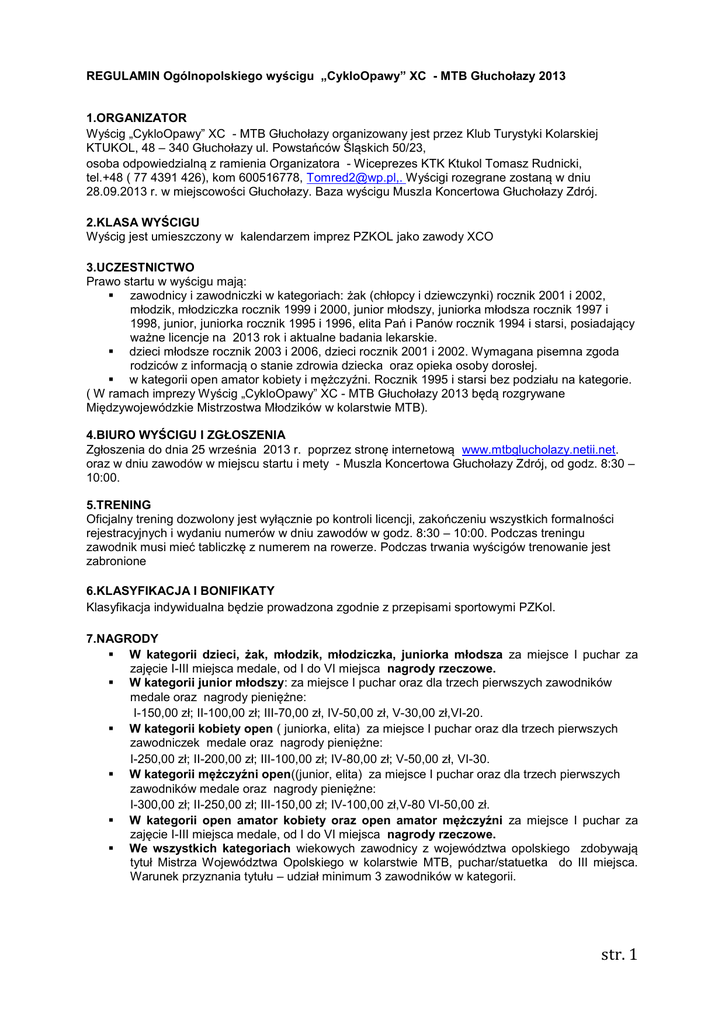 REGULAMIN Ogólnopolskiego wyścigu „CykloOpawy” XC - MTB Głuchołazy 2013 1.ORGANIZATOR Wyścig „CykloOpawy” XC - MTB Głuchołazy organizowany jest przez Klub Turystyki Kolarskiej KTUKOL, 48 – 340 Głuchołazy ul. Powstańców Śląskich 50/23, osoba odpowiedzialną z ramienia Organizatora - Wiceprezes KTK Ktukol Tomasz Rudnicki, tel.+48 ( 77 4391 426), kom 600516778, [email protected],. Wyścigi rozegrane zostaną w dniu 28.09.2013 r. w miejscowości Głuchołazy. Baza wyścigu Muszla Koncertowa Głuchołazy Zdrój. 2.KLASA WYŚCIGU Wyścig jest umieszczony w kalendarzem imprez PZKOL jako zawody XCO 3.UCZESTNICTWO Prawo startu w wyścigu mają: zawodnicy i zawodniczki w kategoriach: żak (chłopcy i dziewczynki) rocznik 2001 i 2002, młodzik, młodziczka rocznik 1999 i 2000, junior młodszy, juniorka młodsza rocznik 1997 i 1998, junior, juniorka rocznik 1995 i 1996, elita Pań i Panów rocznik 1994 i starsi, posiadający ważne licencje na 2013 rok i aktualne badania lekarskie. dzieci młodsze rocznik 2003 i 2006, dzieci rocznik 2001 i 2002. Wymagana pisemna zgoda rodziców z informacją o stanie zdrowia dziecka oraz opieka osoby dorosłej. w kategorii open amator kobiety i mężczyźni. Rocznik 1995 i starsi bez podziału na kategorie. ( W ramach imprezy Wyścig „CykloOpawy” XC - MTB Głuchołazy 2013 będą rozgrywane Międzywojewódzkie Mistrzostwa Młodzików w kolarstwie MTB). 4.BIURO WYŚCIGU I ZGŁOSZENIA Zgłoszenia do dnia 25 września 2013 r. poprzez stronę internetową www.mtbglucholazy.netii.net. oraz w dniu zawodów w miejscu startu i mety - Muszla Koncertowa Głuchołazy Zdrój, od godz. 8:30 – 10:00. 5.TRENING Oficjalny trening dozwolony jest wyłącznie po kontroli licencji, zakończeniu wszystkich formalności rejestracyjnych i wydaniu numerów w dniu zawodów w godz. 8:30 – 10:00. Podczas treningu zawodnik musi mieć tabliczkę z numerem na rowerze. Podczas trwania wyścigów trenowanie jest zabronione 6.KLASYFIKACJA I BONIFIKATY Klasyfikacja indywidualna będzie prowadzona zgodnie z przepisami sportowymi PZKol. 7.NAGRODY W kategorii dzieci, żak, młodzik, młodziczka, juniorka młodsza za miejsce I puchar za zajęcie I-III miejsca medale, od I do VI miejsca nagrody rzeczowe. W kategorii junior młodszy: za miejsce I puchar oraz dla trzech pierwszych zawodników medale oraz nagrody pieniężne: I-150,00 zł; II-100,00 zł; III-70,00 zł, IV-50,00 zł, V-30,00 zł,VI-20. W kategorii kobiety open ( juniorka, elita) za miejsce I puchar oraz dla trzech pierwszych zawodniczek medale oraz nagrody pieniężne: I-250,00 zł; II-200,00 zł; III-100,00 zł; IV-80,00 zł; V-50,00 zł, VI-30. W kategorii mężczyźni open((junior, elita) za miejsce I puchar oraz dla trzech pierwszych zawodników medale oraz nagrody pieniężne: I-300,00 zł; II-250,00 zł; III-150,00 zł; IV-100,00 zł,V-80 VI-50,00 zł. W kategorii open amator kobiety oraz open amator mężczyźni za miejsce I puchar za zajęcie I-III miejsca medale, od I do VI miejsca nagrody rzeczowe. We wszystkich kategoriach wiekowych zawodnicy z województwa opolskiego zdobywają tytuł Mistrza Województwa Opolskiego w kolarstwie MTB, puchar/statuetka do III miejsca. Warunek przyznania tytułu – udział minimum 3 zawodników w kategorii. str. 1 8.POMOC TECHNICZNA Pomoc techniczna dozwolona jest zgodnie z przepisami PZkol. Na trasie wyścigu umieszczone zostaną 2 boksy techniczne, które będą spełniać również funkcję boksów żywieniowych. 9.CEREMONIA DEKORACJI 12:20 – dzieci młodsze, 12:30 – dzieci, żak, 12:40 – młodzik, młodziczka, juniorka młodsza, 14:30 – junior mł., kobiety open licencja i amator kobiety , 15:50 – mężczyźni open licencja, amator mężczyźni. Do dekoracji mają obowiązek stawić się zawodnicy, którzy zajęli pierwsze 6 miejsc w każdej kategorii. Zawodnicy maja obowiązek zgłosić się do dekoracji w strojach wyścigowych. 10.KARY Zgodnie z przepisami sportowymi PZKol. 11.PROGRAM MINUTOWY: 08:30 – 10:00 oficjalny trening , 10:00 – 10:15 odprawa techniczna, 10:20 - start dzieci młodsze, 10:40 – start dzieci, żak, 11:20 –start kategorii młodzik, juniorka młodsza, 11:22 –start kategorii młodziczka, 12:10– start kategorii junior mł., kobiety open licencja i amator kobiety , 14:00 –start kategorii mężczyźni open licencja, amator mężczyźni 16:00 - zakończenie imprezy. 12.TRASA Baza wyścigu Muszla Koncertowa Głuchołazy Zdrój. Trasa położona na zboczach Góry Parkowej. Start i meta 10 m od bazy wyścigu. Wyścigi rozegrane zostaną na trasie okrężnej w terenie leśnym o zróżnicowanym podłożu i wysokości z odcinkiem ok. 150 metrów drogi asfaltowej. Max. różnica wysokości 131 m. Długość rundy dla dzieci młodsze – trasa uproszczona 400m. Dla kategorii dzieci, żak, żakinia, młodzik, młodziczka, juniorka młodsza – runda mała 1500 m. Dla pozostałych kategorii runda mała jest rundą rozjazdową a długość rundy właściwej wynosi 3 500m. Wyścigi rozegrane zostaną w klasyfikacji indywidualnej w odpowiednich dla poszczególnych kategorii normach czasowych, zgodnych z przepisami PZKol. Graficzny plan trasy w załączeniu. 13.ZASADY FINANSOWANIA Organizator nie pobiera opłaty startowej, przejazd ekip i zawodników odbywa się na koszt własny. 14.ZASADY BEZPIECZEŃSTWA Zawodnicy i osoby towarzyszące musza posiadać ubezpieczenie od następstw nieszczęśliwych wypadków. Zawodnicy bezzwłocznie muszą wykonywać decyzje sędziowskie. 15.SKŁAD KOMISJI SĘDZIOWSKIEJ Sędziego głównego oraz 2 komisarzy wyznaczy PZKol, pozostali sędziowie wyznaczeni zostaną przez OZKol. 16.KONTROLA ANTYDOPINGOWA Podczas wyścigu obowiązują przepisy antydopingowe UCI/PZKol. Badania antydopingowe będą przeprowadzane w budynku Zakładu Opiekuńczo – Leczniczego SPZOZ w Głuchołazach , ul. Parkowa 9 – 200 m od linii start/meta. 17.WYKAZ SZPITALI NA W POBLIŻU TRASY Szpital - Samodzielny Publiczny Zakład Opieki 