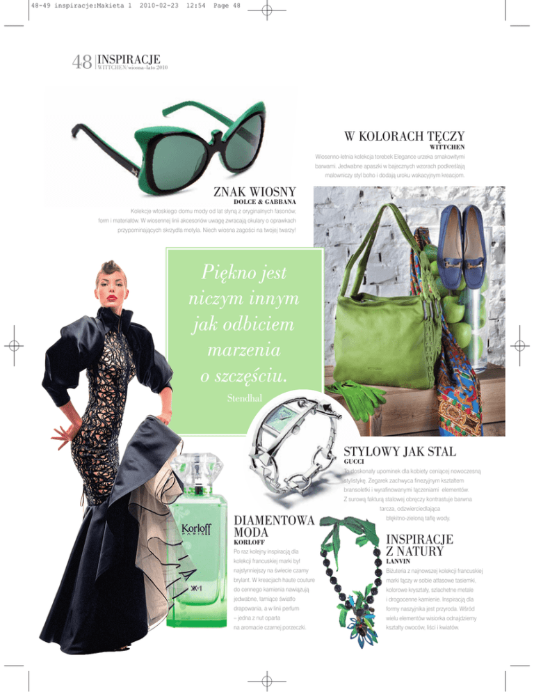 48-49 inspiracje:Makieta 1 2010-02-23 12:54 Page 48 48 INSPIRACJE WITTCHEN/wiosna–lato 2010 W KOLORACH TĘCZY WITTCHEN Wiosenno-letnia kolekcja torebek Elegance urzeka smakowitymi barwami. Jedwabne apaszki w bajecznych wzorach podkreślają malowniczy styl boho i dodają uroku wakacyjnym kreacjom. ZNAK WIOSNY DOLCE & GABBANA Kolekcje włoskiego domu mody od lat słyną z oryginalnych fasonów, form i materiałów. W wiosennej linii akcesoriów uwagę zwracają okulary o oprawkach przypominających skrzydła motyla. Niech wiosna zagości na twojej twarzy! Piękno jest niczym innym jak odbiciem marzenia o szczęściu. Stendhal STYLOWY JAK STAL GUCCI To doskonały upominek dla kobiety ceniącej nowoczesną stylistykę. Zegarek zachwyca finezyjnym kształtem bransoletki i wyrafinowanymi łączeniami elementów. Z surową fakturą stalowej obręczy kontrastuje barwna tarcza, odzwierciedlająca DIAMENTOWA MODA KORLOFF Po raz kolejny inspiracją dla kolekcji francuskiej marki był błękitno-zieloną taflę wody. INSPIRACJE Z NATURY LANVIN najsłynniejszy na świecie czarny Biżuteria z najnowszej kolekcji francuskiej brylant. W kreacjach haute couture marki łączy w sobie atłasowe tasiemki, do cennego kamienia nawiązują kolorowe kryształy, szlachetne metale jedwabne, łamiące światło i drogocenne kamienie. Inspiracją dla drapowania, a w linii perfum formy naszyjnika jest przyroda. Wśród – jedna z nut oparta wielu elementów wisiorka odnajdziemy na aromacie czarnej porzeczki. kształty owoców, liści i kwiatów. 48-49 inspiracje:Makieta 1 2010-02-23 12:54 Page 49 49 DŻENTELMEN W WIELKIM MIEŚCIE NIE TYLKO DLA MISTRZÓW W linii Selection miłośnicy niemieckiej marki Jabulani to oficjalna piłka Pucharu Świata odnajdą inspiracje stylem zamożnych FIFA 2010 w Republice Południowej Afryki. mieszkańców peryferii Manhattanu. Dzięki nowo opracowanemu profilowi HUGO BOSS ADIDAS To ubrania dla mężczyzn ceniących wygodę i elegancję, lubiących akcentować swoją pozycję doskonale skrojonymi marynarkami i dodatkami wykonanymi Grip’n’Groove charakteryzuje się wyjątkowo stabilnym lotem i doskonałą przyczepnością w każdych warunkach. z delikatnego kaszmiru, Wzory zdobiące piłkę jedwabiu i wężowej skóry. są inspirowane kulturą południowych regionów Czarnego Lądu. Zamiłowanie do piękna jest smakiem, tworzenie piękna to sztuka. Ralph Waldo Emerson LEGENDARNY NOTES ŚWIAT NA DŁONI MOLESKINE PASSION APPLE Kieszonkowy towarzysz podróży, Wszystkie programy wbudowane opiekun szkiców i notatek, znany w iPada zostały zaprojektowane jest w Europie już od dwustu lat. od podstaw z myślą o dużym A to za sprawą takich postaci, dotykowym ekranie Multi-Touch. jak Vincent van Gogh, Pablo Mogą działać w poziomie lub Picasso czy Ernest Hemingway. w pionie. Największą uwagę poświęcono multimediom. Dzięki iPadowi możemy przeczytać książkę, obejrzeć film, posłuchać muzyki, a także odwiedzać strony internetowe. Za przeglądarkę służy dostosowana wersja Safari Mobile. POWIEW WOLNOŚCI LACOSTE Zapach Essential Sport uwalnia cytrusową mieszankę różowego grejpfruta, bergamotki i mandarynki. Uczucie lodowatej świeżości powstaje dzięki połączeniu intensywnych nut morskich i mrożonego imbiru. Podobno z notesu korzystał też pisarz i podróżnik Ryszard Kapuściński. Nowa ekskluzywna kolekcja moleskinów została stworzona z myślą o osobach, które chciałyby w notesie zapisywać m.in. swoje wrażenia filmowe, muzyczne albo receptury ulubionych potraw.