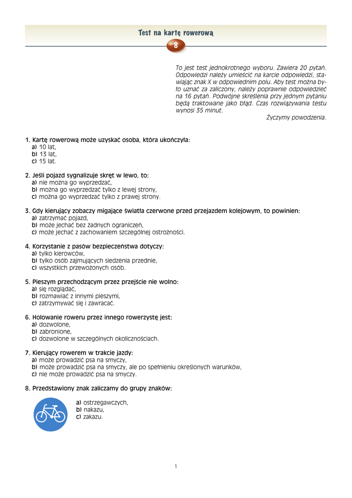 Test na kart´ rowerowà 8 To jest test jednokrotnego wyboru. Zawiera 20 pytań. Odpowiedzi należy umieścić na karcie odpowiedzi, stawiając znak X w odpowiednim polu. Aby test można było uznać za zaliczony, należy poprawnie odpowiedzieć na 16 pytań. Podwójne skreślenia przy jednym pytaniu będą traktowane jako błąd. Czas rozwiązywania testu wynosi 35 minut. Życzymy powodzenia. 1. Kartę rowerową może uzyskać osoba, która ukończyła: a) 10 lat, b) 13 lat, c) 15 lat. 2. Jeśli pojazd sygnalizuje skręt w lewo, to: a) nie można go wyprzedzać, b) można go wyprzedzać tylko z lewej strony, c) można go wyprzedzać tylko z prawej strony. 3. Gdy kierujący zobaczy migające światła czerwone przed przejazdem kolejowym, to powinien: a) zatrzymać pojazd, b) może jechać bez żadnych ograniczeń, c) może jechać z zachowaniem szczególnej ostrożności. 4. Korzystanie z pasów bezpieczeństwa dotyczy: a) tylko kierowców, b) tylko osób zajmujących siedzenia przednie, c) wszystkich przewożonych osób. 5. Pieszym przechodzącym przez przejście nie wolno: a) się rozglądać, b) rozmawiać z innymi pieszymi, c) zatrzymywać się i zawracać. 6. Holowanie roweru przez innego rowerzystę jest: a) dozwolone, b) zabronione, c) dozwolone w szczególnych okolicznościach. 7. Kierujący rowerem w trakcie jazdy: a) może prowadzić psa na smyczy, b) może prowadzić psa na smyczy, ale po spełnieniu określonych warunków, c) nie może prowadzić psa na smyczy. 8. Przedstawiony znak zaliczamy do grupy znaków: a) ostrzegawczych, b) nakazu, c) zakazu. 1 Test na kart´ rowerowà 8 9. Przedstawiony znak oznacza: a) zakaz skrętu w prawo, b) nakaz skrętu w prawo przed znakiem, c) nakaz skrętu w prawo za znakiem. 10. Pierwszeństwo przejazdu przedstawia znak: a) b) c) 11. Rowerzystów nie dotyczy znak: a) b) c) 12. Ustąpienie pierwszeństwa nakazuje znak: a) b) c) 13. Brak krążenia można rozpoznać po: a) braku tętna na tętnicy szyjnej, b) bólu w klatce piersiowej, c) chrapiącym oddechu. 14. Przy oparzeniu należy: a) przemyć ranę spirytusem, b) schłodzić ranę zimną wodą, c) założyć tłusty opatrunek. 15. Numer alarmowy straży pożarnej to: a) 997, b) 989, c) 998. 2 Test na kart´ rowerowà 8 16. Przy złamaniu ręki należy: a) nałożyć jałowy opatrunek, b) natychmiast nastawić uszkodzoną rękę, c) unieruchomić rękę. 17. W przedstawionej sytuacji kierujący rowerem: 2 a) przejeżdża pierwszy, b) ustępuje pierwszeństwa pojazdowi 2, c) ustępuje pierwszeństwa pojazdowi 3. 3 1 18. W przedstawionej sytuacji kierujący rowerem: 3 2 CT C T - 99 99 1 a) przejeżdża pierwszy, b) ustępuje pierwszeństwa pojazdowi 3, c) przejeżdża ostatni. 19. W przedstawionej sytuacji kierujący rowerem: 3 1 a) przejeżdża pierwszy, b) ustępuje pierwszeństwa pojazdowi 3, c) ustępuje pierwszeństwa pojazdowi 2. 2 20. W przedstawionej sytuacji kierujący rowerem: a) przejeżdża pierwszy b) ustępuje pierwszeństwa tylko pojazdowi 2, c) przejeżdża ostatni. 3 2 4 1 3