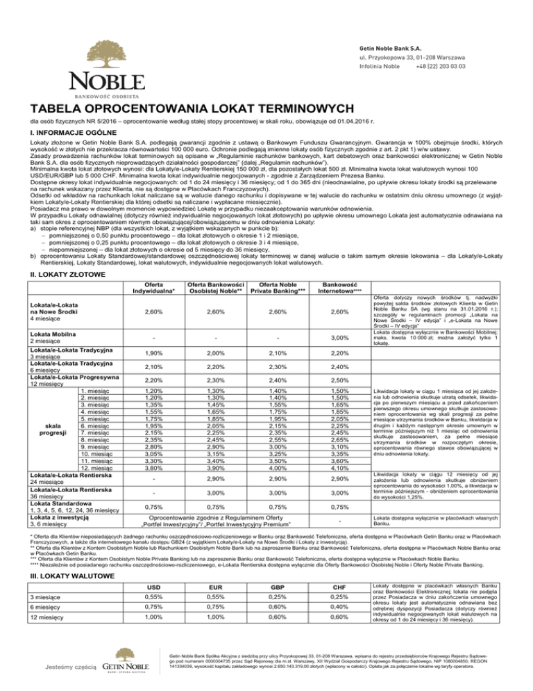 TABELA OPROCENTOWANIA LOKAT TERMINOWYCH dla osób fizycznych NR 5/2016 – oprocentowanie według stałej stopy procentowej w skali roku, obowiązuje od 01.04.2016 r. I. INFORMACJE OGÓLNE Lokaty złożone w Getin Noble Bank S.A. podlegają gwarancji zgodnie z ustawą o Bankowym Funduszu Gwarancyjnym. Gwarancja w 100% obejmuje środki, których wysokość w złotych nie przekracza równowartości 100 000 euro. Ochronie podlegają imienne lokaty osób fizycznych zgodnie z art. 2 pkt 1) w/w ustawy. Zasady prowadzenia rachunków lokat terminowych są opisane w „Regulaminie rachunków bankowych, kart debetowych oraz bankowości elektronicznej w Getin Noble Bank S.A. dla osób fizycznych nieprowadzących działalności gospodarczej” (dalej „Regulamin rachunków”). Minimalna kwota lokat złotowych wynosi: dla Lokaty/e-Lokaty Rentierskiej 150 000 zł, dla pozostałych lokat 500 zł. Minimalna kwota lokat walutowych wynosi 100 USD/EUR/GBP lub 5 000 CHF. Minimalna kwota lokat indywidualnie negocjowanych - zgodnie z Zarządzeniem Prezesa Banku. Dostępne okresy lokat indywidualnie negocjowanych: od 1 do 24 miesięcy i 36 miesięcy; od 1 do 365 dni (nieodnawialne, po upływie okresu lokaty środki są przelewane na rachunek wskazany przez Klienta, nie są dostępne w Placówkach Franczyzowych). Odsetki od wkładów na rachunkach lokat naliczane są w walucie danego rachunku i dopisywane w tej walucie do rachunku w ostatnim dniu okresu umownego (z wyjątkiem Lokaty/e-Lokaty Rentierskiej dla której odsetki są naliczane i wypłacane miesięcznie). Posiadacz ma prawo w dowolnym momencie wypowiedzieć Lokatę w przypadku niezaakceptowania warunków odnowienia. W przypadku Lokaty odnawialnej (dotyczy również indywidualnie negocjowanych lokat złotowych) po upływie okresu umownego Lokata jest automatycznie odnawiana na taki sam okres z oprocentowaniem równym obowiązującej/obowiązującemu w dniu odnowienia Lokaty: a) stopie referencyjnej NBP (dla wszystkich lokat, z wyjątkiem wskazanych w punkcie b): − pomniejszonej o 0,50 punktu procentowego – dla lokat złotowych o okresie 1 i 2 miesiące, − pomniejszonej o 0,25 punktu procentowego – dla lokat złotowych o okresie 3 i 4 miesiące, − niepomniejszonej – dla lokat złotowych o okresie od 5 miesięcy do 36 miesięcy, b) oprocentowaniu Lokaty Standardowej/standardowej oszczędnościowej lokaty terminowej w danej walucie o takim samym okresie lokowania – dla Lokaty/e-Lokaty Rentierskiej, Lokaty Standardowej, lokat walutowych, indywidualnie negocjowanych lokat walutowych. II. LOKATY ZŁOTOWE Oferta Indywidualna* Oferta Bankowości Osobistej Noble** Oferta Noble Private Banking*** Bankowość Internetowa**** Lokata/e-Lokata na Nowe Środki 4 miesiące 2,60% 2,60% 2,60% 2,60% Lokata Mobilna 2 miesiące - - - 3,00% 1,90% 2,00% 2,10% 2,20% 2,10% 2,20% 2,30% 2,40% 2,20% 2,30% 2,40% 2,50% 1,20% 1,20% 1,35% 1,55% 1,75% 1,95% 2,15% 2,35% 2,80% 3,05% 3,30% 3,80% 1,30% 1,30% 1,45% 1,65% 1,85% 2,05% 2,25% 2,45% 2,90% 3,15% 3,40% 3,90% 1,40% 1,40% 1,55% 1,75% 1,95% 2,15% 2,35% 2,55% 3,00% 3,25% 3,50% 4,00% 1,50% 1,50% 1,65% 1,85% 2,05% 2,25% 2,45% 2,65% 3,10% 3,35% 3,60% 4,10% - 2,90% 2,90% 2,90% - 3,00% 3,00% 3,00% 0,75% 0,75% 0,75% 0,75% Lokata/e-Lokata Tradycyjna 3 miesiące Lokata/e-Lokata Tradycyjna 6 miesięcy Lokata/e-Lokata Progresywna 12 miesięcy 1. miesiąc 2. miesiąc 3. miesiąc 4. miesiąc 5. miesiąc 6. miesiąc skala progresji 7. miesiąc 8. miesiąc 9. miesiąc 10. miesiąc 11. miesiąc 12. miesiąc Lokata/e-Lokata Rentierska 24 miesiące Lokata/e-Lokata Rentierska 36 miesięcy Lokata Standardowa 1, 3, 4, 5, 6, 12, 24, 36 miesięcy Lokata z inwestycją 3, 6 miesięcy Oprocentowanie zgodnie z Regulaminem Oferty „Portfel Inwestycyjny”/ „Portfel Inwestycyjny Premium” - Oferta dotyczy nowych środków tj. nadwyżki powyżej salda środków złotowych Klienta w Getin Noble Banku SA (wg stanu na 31.01.2016 r.); szczegóły w regulaminach promocji „Lokata na Nowe Środki – IV edycja” i „e-Lokata na Nowe Środki – IV edycja” Lokata dostępna wyłącznie w Bankowości Mobilnej; maks. kwota 10 000 zł; można założyć tylko 1 lokatę. Likwidacja lokaty w ciągu 1 miesiąca od jej założenia lub odnowienia skutkuje utratą odsetek, likwidacja po pierwszym miesiącu a przed zakończeniem pierwszego okresu umownego skutkuje zastosowaniem oprocentowania wg skali progresji za pełne miesiące utrzymania środków w Banku, likwidacja w drugim i każdym następnym okresie umownym w terminie późniejszym niż 1 miesiąc od odnowienia skutkuje zastosowaniem, za pełne miesiące utrzymania środków w rozpoczętym okresie, oprocentowania równego stawce obowiązującej w dniu odnowienia lokaty. Likwidacja lokaty w ciągu 12 miesięcy od jej założenia lub odnowienia skutkuje obniżeniem oprocentowania do wysokości 1,00%, a likwidacja w terminie późniejszym - obniżeniem oprocentowania do wysokości 1,25%. Lokata dostępna wyłącznie w placówkach własnych Banku. * Oferta dla Klientów nieposiadających żadnego rachunku oszczędnościowo-rozliczeniowego w Banku oraz Bankowość Telefoniczna, oferta dostępna w Placówkach Getin Banku oraz w Placówkach Franczyzowych, a także dla internetowego kanału dostępu GB24 (z wyjątkiem Lokaty/e-Lokaty na Nowe Środki i Lokaty z inwestycją). ** Oferta dla Klientów z Kontem Osobistym Noble lub Rachunkiem Osobistym Noble Bank lub na zaproszenie Banku oraz Bankowość Telefoniczna, oferta dostępna w Placówkach Noble Banku oraz w Placówkach Getin Banku. *** Oferta dla Klientów z Kontem Osobistym Noble Private Banking lub na zaproszenie Banku oraz Bankowość Telefoniczna, oferta dostępna wyłącznie w Placówkach Noble Banku. **** Niezależnie od posiadanego rachunku oszczędnościowo-rozliczeniowego, e-Lokata Rentierska dostępna wyłącznie dla Oferty Bankowości Osobistej Noble i Oferty Noble Private Banking. III. LOKATY WALUTOWE 3 miesiące USD EUR GBP CHF 0,55% 0,5