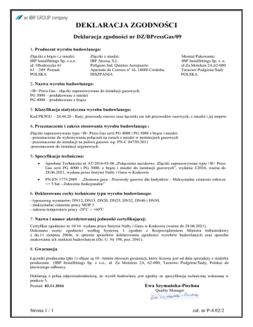 DEKLARACJA ZGODNOŚCI Deklaracja zgodności nr DZ/BPressGas/09 1. Producent wyrobu budowlanego: Złączki z brązu i z miedzi: IBP Instalfittings Sp. z o.o. ul. Obodrzycka 61 61 – 249 Poznań POLSKA Złączki z miedzi: IBP Atcosa, S.L Polígono Ind. Quintos Aeropuerto Apartado de Correos nº 16, 14080 Córdoba, HISZPANIA Montaż/Pakowanie: IBP Instalfittings Sp. z .o. ul.Za Motelem 2A,62-080 Tarnowo Podgórne/Sady POLSKA 2. Nazwa wyrobu budowlanego: >B< Press Gas - złączki zaprasowywane do instalacji gazowych: PG 5000 – produkowane z miedzi PG 4000 – produkowane z brązu 3. Klasyfikacja statystyczna wyrobu budowlanego: Kod PKWiU – 24.44.26 - Rury, przewody rurowe oraz łączniki rur lub przewodów rurowych, z miedzi i jej stopów. 4. Przeznaczenie i zakres stosowania wyrobu budowlanego : Złączki zaprasowywane typu >B< Press Gas serii PG 4000 i PG 5000 z brązu i miedzi: - przeznaczone do wykonywania połączeń na rurach z miedzi w instalacjach gazowych - przeznaczone do instalacji na paliwa gazowe wg PN-C 04750:2011 -przeznaczone do instalacji argonowych 5. Specyfikacja techniczna: Aprobata Techniczna nr AT/2016-03-06 „Połączenia zaciskowe. Złączki zaprasowywane typu >B< Press Gas serii PG 4000 i PG 5000, z brązu i miedzi do instalacji gazowych”, wydanie I/2016, ważna do 28.06.2021, wydana przez Instytut Nafty i Gazu w Krakowie PN-EN 1775:2009 – „Dostawa gazu - Przewody gazowe dla budynków - Maksymalne ciśnienie robocze <= 5 bar - Zalecenia funkcjonalne” 6. Deklarowane cechy techniczne typu wyrobu budowlanego: - typoszereg wymiarów: DN12, DN15, DN20, DN25, DN32, DN40 i DN50, - maksymalne ciśnienie pracy MOP 5 - zakresu temperatury pracy -20oC ÷ +60oC 7. Nazwa i numer akredytowanej jednostki certyfikującej: Certyfikat zgodności nr 10/16 wydane przez Instytut Nafty i Gazu w Krakowie (ważne do 28.06.2021). Dokonano oceny zgodności według Systemu 1 zgodnie z Rozporządzeniem Ministra Infrastruktury z dn.11 sierpnia 2004r, w sprawie sposobów deklarowania zgodności wyrobów budowlanych oraz sposobu znakowania ich znakiem budowlanym (Dz. U. Nr 198, poz. 2041). 8. Gwarancja Łączniki producenta (pkt 1) objęte są 10 –letnim okresem gwarancji, który liczony jest od dnia sprzedaży z siedziby producenta (IBP Instalfittings Sp. z o.o., ul. Za Motelem 2A, 62-080, Tarnowo Podgórne/Sady, Polska) do pierwszego odbiorcy. Deklaruję z pełną odpowiedzialnością, że wyrób budowlany jest zgodny ze specyfikacją techniczną wskazaną w punkcie 5. Poznań 02.11.2016 Ewa Szymańska-Piechna Quality Manager Strona 1 / 1 zał. nr P-4.02/2