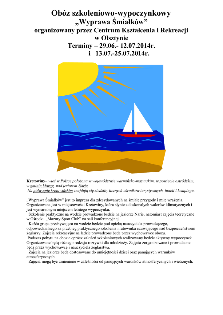 Obóz szkoleniowo-wypoczynkowy „Wyprawa Śmiałków” organizowany przez Centrum Kształcenia i Rekreacji w Olsztynie Terminy – 29.06.- 12.07.2014r. i 13.07.-25.07.2014r. Kretowiny– wieś w Polsce położona w województwie warmińsko-mazurskim, w powiecie ostródzkim, w gminie Morąg, nad jeziorem Narie. Na półwyspie kretowińskim znajdują się siedziby licznych ośrodków turystycznych, hoteli i kempingu. „Wyprawa Śmiałków” jest to impreza dla zdecydowanych na śmiałe przygody i miłe wrażenia. Organizowana jest w miejscowości Kretowiny, która słynie z doskonałych walorów klimatycznych i jest wymarzonym miejscem letniego wypoczynku. Szkolenie praktyczne na wodzie prowadzone będzie na jeziorze Narie, natomiast zajęcia teoretyczne w Ośrodku „Mazury Sport Club” na sali konferencyjnej. Każda grupa przebywająca na wodzie będzie pod opieką nauczyciela prowadzącego, odpowiedzialnego za przebieg praktycznego szkolenia i ratownika czuwającego nad bezpieczeństwem żeglarzy. Zajęcia rekreacyjne na lądzie prowadzone będą przez wychowawcę obozu. Podczas pobytu na obozie oprócz założeń szkoleniowych realizowany będzie aktywny wypoczynek. Organizowane będą różnego rodzaju rozrywki dla młodzieży. Zajęcia zorganizowane i prowadzone będą przez wychowawcę i nauczyciela żeglarstwa. Zajęcia na jeziorze będą dostosowane do umiejętności dzieci oraz panujących warunków atmosferycznych. Zajęcia mogą być zmienione w zależności od panujących warunków atmosferycznych i wietrznych. Informacje ogólne Termin 29.06 – 12.07.2014 i termin drugiego obozu 13.07-25.07.2014 Wyjazd 29.06.20114r. o godz.10.00, spotkanie na „Słonecznej Polanie” w Olsztynie o godz. 10.30. Przejazd Olsztyn-Kretowiny i tak samo 13.07.2014 Powrót 12.07.2014r.w godz.15.00 -16.00; i 25.07.2014 Noclegi Ośrodek Wypoczynkowy „Mazury Sport Club”- w Kretowinach nad jeziorem Narie wyżywienie (śniadanie, obiad, kolacja +podwieczorek) cena obozu -1460zł -14 dniowy, 1260zł -12 dniowy organizator Jolanta Piotrowicz - tel. kontaktowy 600 337 244 Organizator zapewnia Zgłoszenie obozu w Kuratorium Przejazd do ośrodka i powrót Całodzienne wyżywienie i noclegi Ubezpieczenie uczestników obozu sportowo-żeglarskiego Program sportowo – turystyczno - krajoznawczy Wykwalifikowaną kadrę i nadzór pedagogiczny Zabezpieczenie na wodzie- ratownik tylko dla dzieci obozowych Uczestnicy muszą posiadać Ciepłe ubranie, sztormiak lub kurtkę przeciwdeszczową, dres, koszulki Wygodne, sportowe obuwie, klapki, nakrycie na głowę (czapka z daszkiem, wandamka) Przybory toaletowe, krem ochronny, krem przeciw komarom, 2 ręczniki kąpielowe, strój kąpielowy, ROWER na wycieczki rowerowe Dobry humor, apetyt poznawczy Jeżeli musisz brać leki to koniecznie zabierz ze sobą w opakowaniu plastykowym wraz ze szczegółową instrukcją podawania!!! Zlecenie od lekarza i upoważnienie dla n-la - Jolanta Piotrowicz do podania leku Organizator wymaga od uczestników obozu Przestrzeganie Regulaminu obozu Słuchanie poleceń kierownika i opiekunów obozu Pozytywny stosunek do koleżanek, kolegów oraz opiekunów Informacji o chęci ewentualnego oddalenia się od grupy Nieprzestrzeganie w/w wymagań może być powodem odesłania uczestnika obozu do domu w trybie natychmiastowym na koszt rodziców(w takim przypadku rodzice muszą przyjechać po dziecko osobiście). W godzinach wieczornych odbywać się będą krótkie zbiórki w czasie których uczestnicy: - podsumują dzień, przedyskutują sprawy bieżące zapoznają się z planem na dzień następny W programie: nauka i doskonalenie pływania na łódkach typu Optymist i Omega nauka i doskonalenie pływania łódkami wiosłowymi, kajakami, rowerami wodnymi piesze i rowerowe wycieczki po okolicy rozgrywki w tenisa stołowego, paintball, quad, piłka nożna, siatkowa zabawy terenowe, gry na boisku i w wodzie; dzień piratów, przygotowanie strojów pirackich, flagi, bitwa drużyn, poszukiwanie skarbów, piracka dyskoteka warsztaty świetlicowe - zajęcia plastyczne, malowanie koszulek ,wykonywanie totemów drużyn, zajęcia z zakresu udzielania pierwszej pomocy kąpiele słoneczne, plażowanie ,konkursy budowle i rzeźby z piasku leśne igrzyska, olimpiada sportowa nauka podstawowych węzłów żeglarskich nurkowanie i zwiedzanie świata podwodnego na głębokości 2m regaty z podziałem na stopień zaawansowania, zawody kajakowe chrzest żeglarski nowicjuszy. Obóz żeglarsko-wypoczynkowy „Wyprawa Śmiałków” organizowany przez Centrum Kształcenia i Rekreacji oraz Pałac Młodzieży w Olsztynie Terminy- 29.06.- 12.07.2014r. (5 miejsc) i 13.07.-25.07.2014r.(12miejsc) Kretowiny– wieś w Polsce położona w województwie warmińsko-mazurskim, w powiecie ostródzkim, w gminie Morąg, nad jeziorem Narie. Na półwyspie kretowińskim znajdują się siedziby licznych ośrodków turystycznych, hoteli i kempingu. „Wyprawa Śmiałków” jest to impreza dla zdecydowanych na śmiałe przygody i miłe wrażenia. Szkolenie praktyczne na wodzie prowadzone będzie na jeziorze Narie, natomiast zajęcia teoretyczne w Ośrodku „Mazury Sport Club” na sali konferencyjnej. Każda grupa przebywająca na wodzie będzie pod opieką nauczyciela prowadzącego, odpowiedzialnego za przebieg praktycznego szkolenia i ratownika czuwającego nad bezpieczeństwem żeglarzy. Zajęcia rekreacyjne na lądzie prowadzone będą przez wychowawcę obozu. Podczas pobytu na obozie oprócz założeń szkoleniowych realizowany będzie aktywny wypoczynek. Organizowane będą różnego rodzaju rozrywki dla młodzieży. Zajęcia zorganizowane i prowadzone będą przez wychowawcę i nauczyciela żeglarstwa. Zajęcia na jeziorze będą dostosowane do umiejętności dzieci oraz panujących warunków atmosferycznych. Informacje ogólne Termin 29.06 – 12.07.2014 i termin drugiego obozu 13.07-25.07.2014 Wyjazd 29.06.20114r. o godz.10.00, spotkanie na „Słonecznej Polanie”