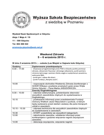 Wyższa Szkoła Bezpieczeństwa z siedzibą w Poznaniu Wydział Nauk Społecznych w Giżycku Aleja 1 Maja 4 / 19 11 – 500 Giżycko Tel. 602 466 522 [email protected] Weekend Zdrowia 5 – 6 września 2015 r. W dniu 5 września 2015 r. – sobota (Las Miejski w Gajewie koło Giżycka) Godziny 9.30 – 17.00 Zaplanowane przedsięwzięcia 10.00 - rozpoczęcie obchodów Weekendu Zdrowia (konferansjer z GOKiR Wilkasy); powitanie przybyłych gości przez Wójta Gminy Giżycko – Pana Marka JASUDOWICZA; Zawody Dogtrekkingowe - odprawa weterynaryjna, potwierdzanie obecności wszystkich zawodników chętnych do wystartowania w Dogtrekkingu; - przekazanie informacji przez przedstawiciela Fundacji Ochrony Wielkich Jezior Mazurskich o punkcie, w którym będą wydawane przed startem zestawy dla psów biorących udział w zawodach; - odprawa techniczna dla wszystkich zawodników chętnych do wystartowania w zawodach; - START uczestników we wszystkich kategoriach; - zakończenie zawodów, udzielenie informacji przez konferansjera o godzinie wręczenia nagród zwycięzcom zawodów; - dekoracja zwycięzców, wręczenie nagród; 9.30 – 10.00 10.15 10.15 – 10.30 10.30 12.00 14.00 - ekspozycja przygotowanego przez PSSE w Giżycku punktu promocji zdrowia, aktywności fizycznej i zdrowego odżywiania, punkt pomiaru ciśnienia tętniczego i pomiaru tlenku węgla w wydychanym powietrzu, wyliczanie BMI; - punkt gier i zabaw dla dzieci; - punkt Fundacji „Ratujmy życie”; 10.30 – 11.30 11.30 – 12.00 12.00 – 12.30 12.30 – 13.00 13.00 – 14.00 14.00 – 14.30 14.30 – 15.30 15.30 – 16.00 16.00 – 16.15 16.15 – 17.00 Oprawa artystyczna - wystąpienie sekcji artystycznej GOKiR Wilkasy; - przyjmowanie pierwszych zawodników przekraczających metę; quiz tematyczny związany ze zdrowiem - przeprowadza PSSE w Giżycku; - gra w boccia; przeprowadza CPUiIS; - Ochotnicza Straż Pożarna w Spytkowie; - Szpilki na siłowni; przeprowadzenie wykładu dotyczącego zdrowego żywienia w formie pogadanki, ćwiczenia aktywizujące słuchaczy; - wręczenie nagród zwycięzcom zawodów Dogtrekkingowych; - Klub AIKIDO w Giżycku; pokaz sztuk walki; przeprowadzenie gier i zabaw dla dzieci; - Anna Leczycka Klub Fitness; wystąpienie grupy – pokaz zumby; - Występy sekcji Giżyckiego Uniwersytetu Trzeciego Wieku. - Występy rosyjkich wokalistek; muzyka w rytmach gruzińskich, ukraińskich i rosyjskich. W dniu 6 września 2015 r. – niedziela (Amfiteatr, Plaża Miejska w Giżycku) Godziny 14.00 – 18.00 14.00 – 14.10 14.10 – 14.40 14.40 – 15.00 15.00 – 15.30 15.30 – 16.00 16.00 – 16.20 16.20 – 16.50 16.50 – 17.20 17.20 – 18.00 Od 18.00 Zaplanowane przedsięwzięcia - punkt promocji zdrowia przygotowany przez Stowarzyszenie Diabetyków, punkt pomiaru ciśnienia, pomiaru poziomu cukru we krwi; - rozpoczęcie drugiego dnia Weekendu Zdrowia; powitanie gości; - wykład mgr. Tomasza DEMBSKIEGO „Zagrożenia wodne dla zdrowia i życia”; - występy artystyczne GOKiR Wilkasy; - wykład mgr Urszuli GASPEROWICZ „Jak zdrowo uzależnić się życiem”; pytania i konkurs; - wykład prof. dr. hab. Witolda JASVINA „Ekopsychologia”; - występy artystyczne GOKiR Wilkasy; - wykład przeprowadzony przez przedstawiciela Kliniki Onkologicznej w Elblągu; pytania i konkurs; - wykład Marty ZDUNIAK „Felinoterapia”; - wykład dr. Kibysh ANATOLIJA – wykład otwarty; pytania i konkurs. Koncert Marty Podulki – wokalistka obdarzona niezwykłym głosem. Zasłynęła występami w IV edycji Mam Talent, gdzie zajęła 3 miejsce.