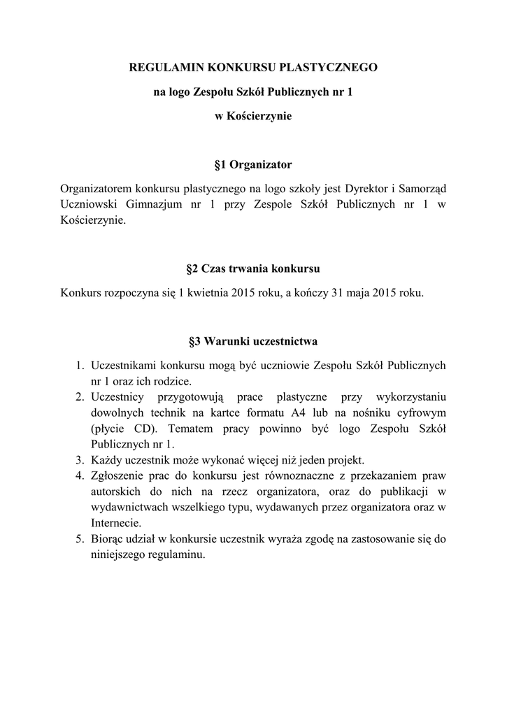 REGULAMIN KONKURSU PLASTYCZNEGO na logo Zespołu Szkół Publicznych nr 1 w Kościerzynie §1 Organizator Organizatorem konkursu plastycznego na logo szkoły jest Dyrektor i Samorząd Uczniowski Gimnazjum nr 1 przy Zespole Szkół Publicznych nr 1 w Kościerzynie. §2 Czas trwania konkursu Konkurs rozpoczyna się 1 kwietnia 2015 roku, a kończy 31 maja 2015 roku. §3 Warunki uczestnictwa 1. Uczestnikami konkursu mogą być uczniowie Zespołu Szkół Publicznych nr 1 oraz ich rodzice. 2. Uczestnicy przygotowują prace plastyczne przy wykorzystaniu dowolnych technik na kartce formatu A4 lub na nośniku cyfrowym (płycie CD). Tematem pracy powinno być logo Zespołu Szkół Publicznych nr 1. 3. Każdy uczestnik może wykonać więcej niż jeden projekt. 4. Zgłoszenie prac do konkursu jest równoznaczne z przekazaniem praw autorskich do nich na rzecz organizatora, oraz do publikacji w wydawnictwach wszelkiego typu, wydawanych przez organizatora oraz w Internecie. 5. Biorąc udział w konkursie uczestnik wyraża zgodę na zastosowanie się do niniejszego regulaminu. §4 Termin i warunki dostarczenia prac 1. Prace należy dostarczyć osobiście do organizatora konkursu, czyli na ręce opiekuna Samorządu Uczniowskiego Gimnazjum nr 1, pani Aleksandry Meger, w terminie do 31 maja 2015 roku. 2. Prace należy dostarczyć w kopertach, podpisane hasłem; w kopercie należy umieścić drugą, zaklejoną kopertę, również opatrzoną hasłem, w której należy podać imię i nazwisko autora, klasę (w przypadku rodziców – klasę dziecka), adres zamieszkania i telefon. 3. Prace przechodzą na własność organizatora i nie będą zwracane. 4. Prace konkursowe powinny być oryginalne, nie kopiowane z innych źródeł. §5 Zasady przyznawania nagród 1. Komisja wyłoniona przez organizatora konkursu do 19 czerwca 2015 roku wyłoni zwycięską pracę przyznając nagrodę zwycięzcy. 2. Komisja zastrzega sobie prawo do niewybrania żadnej pracy. 3. Nagrodą w konkursie będzie tablet. 4. Komisja może, ale nie musi, przyznać wyróżnienia. 5. Prace nie spełniające warunków regulaminowych nie będą klasyfikowane przez komisję. 6. Decyzja komisji jest ostateczna i nieodwołalna. 7. Wyniki konkursu zostaną ogłoszone na stronie internetowej Zespołu Szkół Publicznych nr 1 w Kościerzynie. 8. Warunkiem otrzymania nagrody jest przekazanie przez osoby, które zostaną wyłonione jako zwycięzcy pisemnego oświadczenia o przeniesieniu praw autorskich na organizatora (w przypadku osób niepełnoletnich – pisemnego oświadczenia opiekunów prawnych). 9. Termin uroczystego wręczenia nagród zostanie ogłoszony na stronie internetowej Zespołu Szkół Publicznych nr 1 w Kościerzynie. §6 Niniejszy regulamin jest dostępny w siedzibie oraz na stronie internetowej Zespołu Szkół Publicznych nr 1 w Kościerzynie. Szczegółowe informacje o konkursie można uzyskać u opiekunów Samorządu Uczniowskiego Gimnazjum nr 1, pani Aleksandry Meger i pani Marioli Czajkowskiej.