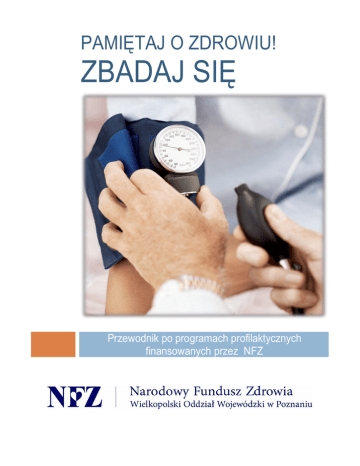 PAMIĘTAJ O ZDROWIU! ZBADAJ SIĘ Przewodnik po programach profilaktycznych finansowanych przez NFZ Pamiętaj o zdrowiu! Zbadaj się Lepiej zapobiegać niż leczyć Program profilaktyki chorób układu krążenia Choroby układu krążenia są główną przyczyną zgonów w Polsce i na świecie. Niewłaściwe odżywianie się prowadzące do otyłości, mała aktywność ruchowa, palenie papierosów, picie alkoholu oraz stres to czynniki najbardziej wpływające na rozwój chorób układu krążenia. Badania profilaktyczne pozwalają na wczesne zdiagnozowanie ewentualnych nieprawidłowości i podjęcie leczenia. Program skierowany jest do osób w grupie wiekowej najbardziej zagrożonej chorobami układu krążenia. Z badań mogą korzystać osoby w wieku 35, 40, 45, 50 oraz 55 lat, które w ciągu ostatnich pięciu lat nie korzystały z tego typu badań. Jakie badania w ramach programu? W ramach programu wykonywane są m.in.: badania układu krążenia, określenie BMI (wskaźnik masy ciała), pomiar ciśnienia, badania biochemiczne krwi. W przypadku wykrycia nieprawidłowości pacjent kierowany jest na dalszą diagnostykę. Jak skorzystać z badań? Program ten realizowany jest przez wszystkich lekarzy rodzinnych, którzy mają zawartą umowę z NFZ. Osoby kwalifikujący się do programu mogą z niego skorzystać wyłącznie u swojego lekarza rodzinnego. Strona 1 Pamiętaj o zdrowiu! Zbadaj się Program profilaktyki chorób odtytoniowych Palenie tytoniu jest chorobą przewlekłą opisaną w Międzynarodowej Statystycznej Klasyfikacji Chorób. Związane z paleniem objawy chorobowe i zgony występują zwykle po długim okresie bezobjawowym. Skala i niekorzystne wzory palenia w Polsce doprowadziły do epidemii chorób odtytoniowych. Umieralność na nowotwory płuca, chorobę występującą prawie wyłącznie u palaczy tytoniu, jest w Polsce na jednym z najwyższych poziomów na świecie. Co roku z powodu schorzeń odtytoniowych umiera przedwcześnie ok. 50 000 Polaków. Obecnie tylko u około 17% chorych wykrywany jest wcześnie rak płuca. A choroba we wczesnym stadium rozwoju może być całkowicie uleczalna!!! Program skierowany jest do osób powyżej 18 roku życia palących papierosy, w tym – w zakresie Przewlekłej Obturacyjnej Choroby Płuc (POChP) – w szczególności do kobiet i mężczyzn pomiędzy 40 a 65 rokiem życia, którzy nie mieli wykonywanych badań spirometrycznych w ramach programu profilaktyki POChP w ciągu ostatnich 36 miesięcy i u których nie zdiagnozowano wcześniej POChP, przewlekłego zapalenia oskrzeli czy rozedmy. Jakie badania w ramach programu? 1. Zebranie wywiadu dotyczącego palenia tytoniu 2. Wykonanie badań lekarskich i diagnostycznych: pomiar masy ciała, wzrostu, ciśnienia tętniczego krwi, badanie fizykalne oraz - w przypadku osób palących papierosy zakwalifikowanych do działań w zakresie profilaktyki POCHP - dodatkowo wykonywane jest badanie spirometryczne (polega na oddychaniu do aparatu mierzącego pojemność płuc i szybkość wydechu) 3. Udzielenie porady lekarskiej: w tym m.in. edukacja dotycząca skutków zdrowotnych palenia tytoniu; porada antynikotynowa z zaplanowaniem terapii odwykowej; prowadzenie terapii odwykowej. Jak skorzystać z badań? Bezpłatne badania w ramach programu można wykonać w poradniach, które podpisały z NFZ umowę na realizację tych badań. Wystarczy zgłosić się osobiście lub umówić na wizytę telefonicznie. Skierowanie nie jest wymagane. Strona 2 Pamiętaj o zdrowiu! Zbadaj się Program profilaktyki gruźlicy Gruźlica jest chorobą zakaźną - wywołana przez bakterię prątek gruźlicy, który jest wrażliwy na działanie promieniowania ultrafioletowego i wysoką temperaturę. Źródłem zakażenia jest najczęściej chory na gruźlicę - prątkujący. Osoba chora na gruźlicę podczas kaszlu, kichania, odkrztuszania, mówienia wydala prątki wraz z kropelkami śluzu. Zakażenie drogą powietrzną, zwane też zakażeniem inhalacyjnym jest najczęstszym sposobem zakażenia. Jeden nieleczony chory prątkujący zakaża w ciągu roku średnio 10 do 15 ludzi. Ciągle wzrastająca liczba zachorowań na gruźlicę w niektórych województwach wymaga działań w zakresie ograniczenia rozprzestrzeniania się choroby. Program skierowany jest do osób, które miały bezpośredni kontakt z chorym na gruźlicę lub stwierdzają objawy mogące świadczyć o chorobie (osłabienie, nagły spadek masy ciała). Jakie badania w ramach programu? W ramach programu wykonywane są m.in.: wywiad w kierunku gruźlicy; edukacja zdrowotna. W sytuacji gdy istnieje podejrzenie, że pacjent choruje na gruźlicę, jest on kierowany do lekarza rodzinnego, a później na dalszą diagnostykę i leczenie. Jak korzystać z badań? Program realizowany jest przez pielęgniarki podstawowej opieki zdrowotnej, działające w ramach umowy z NFZ. Strona 3 Pamiętaj o zdrowiu! Zbadaj się Populacyjny program wczesnego wykrywania raka piersi Rak piersi to najczęściej występujący nowotwór złośliwy u kobiet. Stanowi około 20% wszystkich zachorowań na nowotwory złośliwe u Polek. Najlepszym sposobem wczesnego wykrycia nieprawidłowych zmian w piersi jest mammografia badanie bezpieczne i bezbolesne. Rak piersi wcześnie wykryty może być w pełni uleczalny. Program profilaktyczny skierowany jest do grupy kobiet najbardziej zagrożonych rakiem piersi - w wieku od 50 do 69 lat, które przez ostatnie dwa lata nie miały wykonywanej mammografii oraz tych, które otrzymały pisemne wskazanie do wykonania ponownego badania mammograficznego po upływie 12 miesięcy. Jakie badania w ramach programu? I. Etap podstawowy: mammografia Badanie mammograficzne obejmuje wykonanie dwóch zdjęć każdej piersi oraz opis badania. W przypadku konieczności wykonania dodatkowych badań, lekarz kieruje pacjentkę do etapu pogłębionej diagnostyki i informuje kobietę, gdzie takie badania są wykonywane. II. Etap pogłębionej diagnostyki: USG i biopsja 