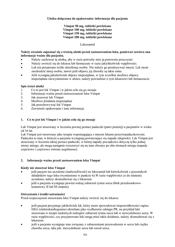 Ulotka dołączona do opakowania: informacja dla pacjenta Vimpat 50 mg, tabletki powlekane Vimpat 100 mg, tabletki powlekane Vimpat 150 mg, tabletki powlekane Vimpat 200 mg, tabletki powlekane Lakozamid Należy uważnie zapoznać się z treścią ulotki przed zastosowaniem leku, ponieważ zawiera ona informacje ważne dla pacjenta. • Należy zachować tę ulotkę, aby w razie potrzeby móc ją ponownie przeczytać. • Należy zwrócić się do lekarza lub farmaceuty w razie jakichkolwiek wątpliwości. • Lek ten przepisano ściśle określonej osobie. Nie należy go przekazywać innym. Lek może zaszkodzić innej osobie, nawet jeśli objawy jej choroby są takie same. • Jeśli wystąpią jakiekolwiek objawy niepożądane, w tym wszelkie możliwe objawy niepożądane niewymienione w ulotce, należy powiedzieć o tym lekarzowi lub farmaceucie. Spis treści ulotki 1. Co to jest lek Vimpat i w jakim celu się go stosuje 2. Informacje ważne przed zastosowaniem leku Vimpat 3. Jak stosować lek Vimpat 4. Możliwe działania niepożądane 5. Jak przechowywać lek Vimpat 6. Zawartość opakowania i inne informacje 1. Co to jest lek Vimpat i w jakim celu się go stosuje Lek Vimpat jest stosowany w leczeniu pewnej postaci padaczki (patrz poniżej) u pacjentów w wieku od 16 lat. Lek Vimpat jest stosowany jako terapia wspomagająca z innymi lekami przeciwpadaczkowymi. Padaczka to stan, w którym u pacjenta występują powtarzające się napady (drgawki). Lek Vimpat jest stosowany w leczeniu takiej postaci padaczki, w której napady początkowo dotyczą tylko jednej strony mózgu, ale mogą następnie rozszerzyć się na inne obszary po obu stronach mózgu (napady częściowe i częściowe wtórnie uogólnione). 2. Informacje ważne przed zastosowaniem leku Vimpat Kiedy nie stosować leku Vimpat • jeśli pacjent ma uczulenie (nadwrażliwość) na lakozamid lub którykolwiek z pozostałych składników tego leku (wymienione w punkcie 6).W razie wątpliwości co do istnienia uczulenia, należy skonsultować się z lekarzem • jeśli u pacjenta występuje pewien rodzaj zaburzeń rytmu serca (blok przedsionkowokomorowy II lub III stopnia) Ostrzeżenia i środki ostrożności Przed rozpoczęciem stosowania leku Vimpat należy zwrócić się do lekarza: • • jeśli pacjent przyjmuje jakikolwiek lek, który może spowodować nieprawidłowości zapisu EKG (elektrokardiogramu) określane jako wydłużenie odstępu PR, na przykład leki stosowane w terapii niektórych rodzajów zaburzeń rytmu serca lub w niewydolności serca. W razie wątpliwości, czy przyjmowane leki mogą mieć takie działanie, należy skonsultować się z lekarzem. jeśli u pacjenta występuje stan związany z zaburzeniami przewodzenia w sercu lub ciężka choroba serca, taka jak: niewydolność serca lub zawał serca. 123 Lek Vimpat może powodować zawroty głowy, które mogą zwiększać ryzyko przypadkowego urazu lub upadku. Z tego względu należy zachować ostrożność do czasu przekonania się, jak organizm reaguje na lek. U niektórych pacjentów leczonych lekami przeciwpadaczkowymi, takimi jak lakozamid, występowały myśli o samookaleczeniu lub myśli samobójcze. Jeśli kiedykolwiek wystąpią takie myśli, należy natychmiast skontaktować się z lekarzem. Inne leki i Vimpat Należy powiedzieć lekarzowi o wszystkich lekach przyjmowanych obecnie lub ostatnio, a także o lekach które pacjent planuje przyjmować. Jest to szczególnie istotne w razie przyjmowania leków stosowanych w chorobach serca (patrz również punkt „Ostrzeżenia i środki ostrożności” powyżej). Vimpat z jedzeniem, piciem i alkoholem Lek Vimpat można przyjmować z pokarmem lub bez pokarmu. Nie zaleca się picia alkoholu podczas stosowania leku Vimpat, ponieważ Vimpat może powodować uczucie zmęczenia i zawroty głowy. Picie alkoholu może nasilić te działania. Ciąża i karmienie piersią Nie zaleca się przyjmowania leku Vimpat w czasie ciąży, ponieważ wpływ tego leku na jej przebieg i nienarodzone dziecko nie jest znany. Jeśli pacjentka zajdzie w ciążę lub planuje ciążę, należy natychmiast skontaktować się z lekarzem; lekarz zdecyduje, czy należy przyjmować lek Vimpat. Nie zaleca się karmienia piersią w okresie przyjmowania leku Vimpat, ponieważ nie wiadomo, czy lek Vimpat nie przenika do mleka matki. W razie karmienia piersią należy natychmiast skonsultować się z lekarzem; lekarz zdecyduje, czy należy przyjmować lek Vimpat. Badania wykazały zwiększone ryzyko wad urodzeniowych u dzieci kobiet, które stosowały leki przeciwpadaczkowe. Jednak nie wolno przerywać skutecznego leczenia przeciwpadaczkowego, ponieważ nasilenie objawów choroby jest szkodliwe dla matki i nienarodzonego dziecka. W ciąży i w okresie karmienia piersia lub gdy istnieje podejrzenie, że kobieta jest w ciąży, lub gdy planuje ciążę, przed zastosowaniem tego leku należy poradzić się lekarza lub farmaceuty. Prowadzenie pojazdów i obsługa maszyn Lek Vimpat może powodować zawroty głowy lub niewyraźne widzenie. Może to wpływać na zdolność prowadzenia pojazdów i obsługi narzędzi lub maszyn. Nie należy prowadzić pojazdów ani obsługiwać maszyn do momentu upewnienia się, jak lek wpływa na zdolność pacjenta do wykonywania tych czynności. 3. Jak stosować lek Vimpat Ten lek należy zawsze stosować zgodnie z zaleceniami lekarza lub farmaceuty. W razie wątpliwości, należy zwrócić się do lekarza lub farmaceuty. Dawkowanie Lek Vimpat musi być przyjmowany dwa razy na dobę, raz rano i raz wieczorem, mniej więcej o tej samej porze każdego dnia. Vimpat stosuje się w leczeniu długotrwałym. Przeciętna dawka początkowa leku Vimpat wynosi 100 mg na dobę – podawane w dwóch dawkach na dobę - 50 mg rano i 50 mg wieczorem. Lekarz może zwiększać stosowaną dawkę dobową co tydzień o 100 mg, aż do osiągnięcia tak zwanej dawki podtrzymującej, wynoszącej między 200 mg i 400 mg na dobę, podaw
