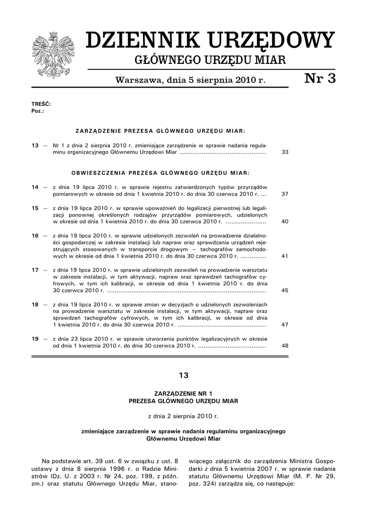 DZIENNIK URZĘDOWY GŁÓWNEGO URZĘDU MIAR Nr 3 Warszawa, dnia 5 sierpnia 2010 r. TREŚĆ: Poz.: ZARZĄDZENIE PREZESA GŁÓWNEGO URZĘDU MIAR: 13 — Nr 1 z dnia 2 sierpnia 2010 r. zmieniające zarządzenie w sprawie nadania regulaminu organizacyjnego Głównemu Urzędowi Miar ............................................... 33 OBWIESZCZENIA PREZESA GŁÓWNEGO URZĘDU MIAR: 14 — z dnia 19 lipca 2010 r. w sprawie rejestru zatwierdzonych typów przyrządów pomiarowych w okresie od dnia 1 kwietnia 2010 r. do dnia 30 czerwca 2010 r. ... 37 15 — z dnia 19 lipca 2010 r. w sprawie upoważnień do legalizacji pierwotnej lub legalizacji ponownej określonych rodzajów przyrządów pomiarowych, udzielonych w okresie od dnia 1 kwietnia 2010 r. do dnia 30 czerwca 2010 r. ...................... 40 16 — z dnia 19 lipca 2010 r. w sprawie udzielonych zezwoleń na prowadzenie działalności gospodarczej w zakresie instalacji lub napraw oraz sprawdzania urządzeń rejestrujących stosowanych w transporcie drogowym − tachografów samochodowych w okresie od dnia 1 kwietnia 2010 r. do dnia 30 czerwca 2010 r. .............. 41 17 — z dnia 19 lipca 2010 r. w sprawie udzielonych zezwoleń na prowadzenie warsztatu w zakresie instalacji, w tym aktywacji, napraw oraz sprawdzeń tachografów cyfrowych, w tym ich kalibracji, w okresie od dnia 1 kwietnia 2010 r. do dnia 30 czerwca 2010 r. ...................................................................................... 45 18 — z dnia 19 lipca 2010 r. w sprawie zmian w decyzjach o udzielonych zezwoleniach na prowadzenie warsztatu w zakresie instalacji, w tym aktywacji, napraw oraz sprawdzeń tachografów cyfrowych, w tym ich kalibracji, w okresie od dnia 1 kwietnia 2010 r. do dnia 30 czerwca 2010 r. ................................................ 47 19 — z dnia 23 lipca 2010 r. w sprawie utworzenia punktów legalizacyjnych w okresie od dnia 1 kwietnia 2010 r. do dnia 30 czerwca 2010 r. ..................................... 48 13 ZARZĄDZENIE NR 1 PREZESA GŁÓWNEGO URZĘDU MIAR z dnia 2 sierpnia 2010 r. zmieniające zarządzenie w sprawie nadania regulaminu organizacyjnego Głównemu Urzędowi Miar Na podstawie art. 39 ust. 6 w związku z ust. 8 ustawy z dnia 8 sierpnia 1996 r. o Radzie Ministrów (Dz. U. z 2003 r. Nr 24, poz. 199, z późn. zm.) oraz statutu Głównego Urzędu Miar, stano- wiącego załącznik do zarządzenia Ministra Gospodarki z dnia 5 kwietnia 2007 r. w sprawie nadania statutu Głównemu Urzędowi Miar (M. P. Nr 29, poz. 324) zarządza się, co następuje: Dziennik Urzędowy Głównego Urzędu Miar Nr 3 — 34 — § 1. W regulaminie organizacyjnym Głównego Urzędu Miar stanowiącym załącznik do Zarządzenia nr 2 Prezesa Głównego Urzędu Miar z dnia 18 kwietnia 2008 r. (Dz. Urz. GUM Nr 2, poz. 8) wprowadza się następujące zmiany: Poz. 13 „32) przygotowanie, we współpracy z komórkami organizacyjnymi, projektów aktów wewnętrznych prezesa, a w szczególności projektu zarządzenia prezesa w sprawie nadania regulaminu organizacyjnego Urzędu.”, 1) w § 1: b) dodaje się ust. 3 w brzmieniu: a) dotychczasową treść oznacza się jako ust. 1, a pkt 6 otrzymuje następujące brzmienie: „6) ustawy z dnia 7 maja 2009 r. o towarach paczkowanych (Dz. U. Nr 91, poz. 740).”, „3. W zakresie funkcjonowania jednostki notyfikowanej Gabinet Prezesa wykonuje zadania w zakresie polityki informacyjnej.”; 8) w § 17: b) dodaje się ust. 2 w brzmieniu: „2. Główny Urząd Miar wykonuje również zadania Jednostki Notyfikowanej 1440, zwanej dalej „jednostką notyfikowaną”.”; 2) w § 4 w ust. 4 pkt 9 kropkę zastępuje się średnikiem i dodaje się pkt 10 w brzmieniu: „10) wydawanie certyfikatów dla przyrządów pomiarowych w systemie oceny zgodności.”; a) w ust. 2: – pkt 10 otrzymuje brzmienie: „10) przygotowywanie opinii i ocen oraz prowadzenie spraw powierzonych przez prezesa, w szczególności spraw związanych z organizowaniem posiedzeń Kierownictwa i Kolegium Głównego Urzędu Miar;”, – pkt 17 otrzymuje brzmienie: 3) w § 6 w ust. 2 w pkt 6 kropkę zastępuje się średnikiem i dodaje się pkt 7 w brzmieniu: „7) nadzór nad organizacją i funkcjonowaniem systemu kontroli zarządczej w Urzędzie, jako jednostce sektora finansów publicznych.”; 4) w § 7 dotychczasową treść § 7 oznacza się jako ust. 1 i dodaje się ust. 2 w brzmieniu: „2. Zadania Urzędu jako jednostki notyfikowanej realizują komórki określone w ust. 1 pkt 1-7 oraz 9-13.”; 5) w § 10 pkt 6 otrzymuje brzmienie: „6) realizację zadań z obszaru kontroli zarządczej w komórce organizacyjnej, w szczególności za zarządzanie ryzykiem;”; 6) w § 15 w ust. 2 w pkt 31 kropkę zastępuje się średnikiem i dodaje się pkt 32 w brzmieniu: „32) opracowywanie okresowych informacji z zakresu kontroli zarządczej wraz z wnioskami i propozycjami ewentualnych działań.”; 7) w § 16: a) w ust. 2 w pkt 31 kropkę zastępuje się średnikiem i dodaje się pkt 32 w brzmieniu: „17) koordynowanie w Urzędzie;”, kontroli zarządczej – dodaje się pkt 18 w brzmieniu: „18) realizacja zadań Biura wynikających z kontroli zarządczej, polegających w szczególności na: a) analizowaniu i sporządzaniu zbiorczej informacji na podstawie zebranych sprawozdań oraz wstępne formułowanie wniosków dotyczących stanu kontroli zarządczej, b) weryfikowaniu informacji zawartych w sprawozdaniach załączanych do oświadczeń cząstkowych składanych przez dyrektorów okręgowych urzędów miar i okręgowych urzędów probierczych z wynikami nadzoru sprawowanego przez prezesa nad administracją metrologiczną i probierczą.”, b) dodaje się ust. 3 w brzmieniu: „3. W zakresie funkcjonowania jednostki notyfikowanej Biuro Rozwiązań Systemowych wykonuje zadania polegające na koordynowaniu prac związanych z tworzeniem i uaktualnianiem dokumentacji Dziennik Urzędowy Głównego Urzędu Miar Nr 3 — 35 — systemu zarządzania