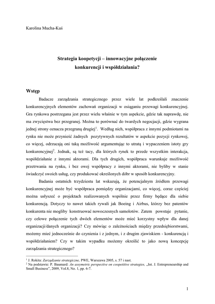 Karolina Mucha-Kuś Strategia koopetycji – innowacyjne połączenie konkurencji i współdziałania? Wstęp Badacze zarządzania strategicznego przez wiele lat podkreślali znaczenie konkurencyjnych elementów zachowań organizacji w osiąganiu przewagi konkurencyjnej. Gra rynkowa postrzegana jest przez wielu właśnie w tym aspekcie, gdzie tak naprawdę, nie ma zwycięstwa bez przegranej. Można to porównać do twardych negocjacji, gdzie wygrana jednej strony oznacza przegraną drugiej1. Według nich, współpraca z innymi podmiotami na rynku nie może przynieść żadnych pozytywnych rezultatów w aspekcie pozycji rynkowej, co więcej, odrzucają oni taką możliwość argumentując to utratą i wypaczeniem istoty gry konkurencyjnej2. Jednak, są też tacy, dla których rynek to przede wszystkim interakcja, współdziałanie z innymi aktorami. Dla tych drugich, współpraca warunkuje możliwość przetrwania na rynku, i bez owej współpracy z innymi aktorami, nie byliby w stanie świadczyć swoich usług, czy produkować określonych dóbr w sposób konkurencyjny. Badania ostatnich trzydziestu lat wskazują, że potencjalnym źródłem przewagi konkurencyjnej może być współpraca pomiędzy organizacjami, co więcej, coraz częściej można usłyszeć o projektach realizowanych wspólnie przez firmy będące dla siebie konkurencją. Dotyczy to nawet takich rywali jak Boeing i Airbus, którzy bez patentów konkurenta nie mogliby konstruować nowoczesnych samolotów. Zatem powstaje pytanie, czy celowe połączenie tych dwóch elementów może mieć korzystny wpływ dla danej organizacji/danych organizacji? Czy mówiąc o zależnościach między przedsiębiorstwami, możemy mieć jednocześnie do czynienia i z jednym, i z drugim zjawiskiem - konkurencją i współdziałaniem? Czy w takim wypadku możemy określić to jako nową koncepcję zarządzania strategicznego? J. Rokita: Zarządzanie strategiczne, PWE, Warszawa 2005, s. 57 i nast. Na podstawie: P. Baumard: An assymetric perspective on coopetitive strategies, „Int. J. Entrepreneurship and Small Business”, 2009, Vol.8, No. 1, pp. 6-7. 1 2 1 Konkurencja Przedsiębiorstwa muszą stworzyć i konsekwentnie rozwijać czynniki wpływające na ich trwałą konkurencyjność, co pozwoli im na utrzymanie przewagi rynkowej w długim terminie3. Konkurencja to rywalizacja między poszczególnymi osobami lub grupami zainteresowanymi w osiąganiu tych samych celów4 a konkurenci to organizacje, które rywalizują z innymi organizacjami o zasoby. Najbardziej oczywistym typem takich zasobów są pieniądze klientów. Organizacje jednak mogą konkurować o inne zasoby, którymi mogą być m.in. wyspecjalizowana siła robocza, przełomowe wynalazki, patenty czy rzadkie surowce. W branżach technologicznie zmieniających się innowacyjność i umiejętność szybkiego wdrożenia innowacji są jednym z najważniejszych narzędzi konkurencji5. Można zatem odnieść wrażenie, że powszechnie uznanym modelem zachowań organizacji jest konkurencja, jednak relacje współpracy stają się coraz ważniejsze w osiąganiu przewagi konkurencyjnej dla firm będących członkami sieci współpracy. Podstawę zachowań współpracy można zatem odnieść do konwencjonalnych teorii opisujących źródła przewagi konkurencyjnej. I tak, w literaturze podkreśla się znaczenie konfiguracji działań organizacji oraz ich koordynacji jako sposobów osiągania przewagi konkurencyjnej6. Z drugiej strony, natomiast, mówi się o umiejętnościach wyróżniających jako źródłach tej przewagi, lub o znaczeniu identyfikacji i rozwijaniu swoich kluczowych kompetencji7. Kluczowe kompetencje, są tu rozumiane jako zbiorowe uczenie się organizacji, w szczególności jeśli chodzi o koordynację różnorodnych zdolności produkcyjnych i integrację licznych strumieni technologii8. Kluczowe kompetencje powinny prowadzić do kluczowych produktów, które z kolei umożliwiają osiągnięcie przewagi konkurencyjnej. Jednym z założeń podejścia strategii jest fakt mówiący o tym, że przewaga konkurencyjna wynika zarówno z rozwijania kompetencji wewnętrznych, jak i ze zmieniających się warunków w otoczeniu organizacji9. Kolejne założenia mówią również o tym że przewaga konkurencyjna jest rezultatem uczenia się organizacji, a także zachowań konkurencyjnych i współpracy, oraz, że złożoność i nieprzewidywalność zmian zarówno J. Rokita.: Zarządzanie strategiczne, PWE, Warszawa 2005, s. 57 i nast. E. Urbanowska-Sojkin, P. Banaszyk, H. Witczak: Zarządzanie strategiczne przedsiębiorstwem, Polskie Wydawnictwo Ekonomiczne, Warszawa 2007, s. 114. 5 A. Nowak-Far: Globalna Konkurencja, Wydawnictwo Naukowe PWN, Warszawa 2000, s. 90. 6 W. Czakon: Łańcuch wartości w teorii zarządzania przedsiębiorstwem, AE Katowice 2005, s. 91. 7 M. Bratnicki.: Kompetencje przedsiębiorstwa, Placet, Warszawa 2000, s. 16-19. 8 G. Stonehouse, J. Hamill, D. Campbell, T. Purdie: Globalizacja Strategia i Zarządzanie, Wydawnictwo FELBERG SJA, Warszawa 2001, s.128,129. 9 J. Rokita: Zarządzanie strategiczne, PWE, Warszawa 2005, s. 141-148. 3 4 2 w otoczeniu firm jak i w samych firmach oznacza, że firmy muszą być organizacjami inteligentnymi , uczącymi się. Przedsiębiorstwa konkurują ze sobą w ramach sektorów czy rynków, a najważniejszą konkurencją są dla nich organizacje opierające się na podobnych kluczowych kompetencjach, realizujące podobne strategie i zaspokajające podobne potrzeby klientów. Analizy grup strategicznych to przecież porównanie firmy z grupą firm będących jej bezpośrednimi konkurentami. Grupa strategiczna składa się z organizacji, które dysponują podobnymi kluczowymi kompetencjami, wykorzystują podobne strategie, obsługują podobną grupę klientów i podobne segmenty rynku, stosują podobne technologie, używają podobnych kanałów dystrybucji, oraz wytwarzają podobne i porównywalnej jakości produkty lub usługi. Bior