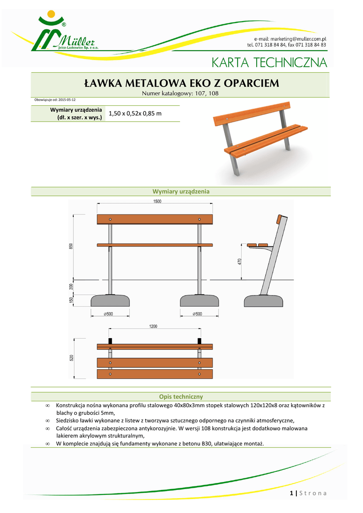 ŁAWKA METALOWA EKO Z OPARCIEM Numer katalogowy: 107, 108 Obowiązuje od: 2015-05-12 Wymiary urządzenia (dł. x szer. x wys.) 1,50 x 0,52x 0,85 m Wymiary urządzenia Opis techniczny • • • • Konstrukcja nośna wykonana profilu stalowego 40x80x3mm stopek stalowych 120x120x8 oraz kątowników z blachy o grubości 5mm, Siedzisko ławki wykonane z listew z tworzywa sztucznego odpornego na czynniki atmosferyczne, Całość urządzenia zabezpieczona antykorozyjnie. W wersji 108 konstrukcja jest dodatkowo malowana lakierem akrylowym strukturalnym, W komplecie znajdują się fundamenty wykonane z betonu B30, ułatwiające montaż. 1|Strona