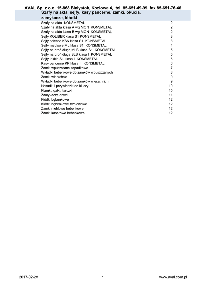 AVAL Sp. z o.o. 15-868 Białystok, Kozłowa 4, tel. 85-651-49-99, fax 85-651-76-46 Szafy na akta, sejfy, kasy pancerne, zamki, okucia, zamykacze, kłódki Szafy na akta KONSMETAL Szafy na akta klasa A wg MON KONSMETAL Szafy na akta klasa B wg MON KONSMETAL Sejfy KOLIBER klasa S1 KONSMETAL Sejfy ścienne KSN klasa S1 KONSMETAL Sejfy meblowe ML klasa S1 KONSMETAL Sejfy na broń długą MLB klasa S1 KONSMETAL Sejfy na broń długą SLB klasa I KONSMETAL Sejfy lekkie SL klasa I KONSMETAL Kasy pancerne KP klasa II KONSMETAL Zamki wpuszczane zapadkowe Wkładki bębenkowe do zamków wpuszczanych Zamki wierzchnie Wkładki bębenkowe do zamków wierzchnich Nasadki i przywieszki do kluczy Klamki, gałki, tarczki Zamykacze drzwi Kłódki bębenkowe Kłódki bębenkowe trzpieniowe Zamki meblowe bębenkowe Zamki kasetowe bębenkowe 2017-02-28 1 2 2 2 3 3 4 5 5 6 6 7 8 9 9 10 10 11 12 12 12 12 www.aval.com.pl AVAL Sp. z o.o. 15-868 Białystok, Kozłowa 4, tel. 85-651-49-99, fax 85-651-76-46 Typ Opis Cena netto Cena brutto nadstawka MS2D Nadstawka dwudrzwiowa na szafę MS2D; konstrukcja ze stali o podwyższonej wytrzymałości; zamek kluczowy Eurolock z 2 kluczami; WxSxG zewn. 470x1200x400mm, wewn. 395x1195x362mm; pojemność 171l; masa 23kg; kolor jasnoszary RAL 7035 Nadstawka dwudrzwiowa na szafę MS2; konstrukcja ze stali o podwyższonej wytrzymałości; zamek kluczowy Eurolock z 2 kluczami; WxSxG zewn. 470x1000x400mm, wewn. 395x995x362mm; pojemność 142l; masa 20kg; kolor jasnoszary RAL 7035 Nadstawka dwudrzwiowa na szafę MS2M; konstrukcja ze stali o podwyższonej wytrzymałości; zamek kluczowy Eurolock z 2 kluczami; WxSxG zewn. 470x800x400mm, wewn. 395x795x362mm; pojemność 114l; masa 17kg; kolor jasnoszary RAL 7035 Szafa na dokumenty dwudrzwiowa; konstrukcja ze stali o podwyższonej wytrzymałości; zamek kluczowy Eurolock z 2 kluczami; 4 półki; WxSxG zewn. 1990x1200x400mm, wewn. 1915x1185x362mm; pojemność 821l; masa 82kg; kolor jasnoszary RAL 7035 Szafa na dokumenty dwudrzwiowa; konstrukcja ze stali o podwyższonej wytrzymałości; zamek kluczowy Eurolock z 2 kluczami; 4 półki; WxSxG zewn. 1990x1000x400mm, wewn. 1915x985x362mm; pojemność 683l; masa 72kg; kolor jasnoszary RAL 7035 Szafa na dokumenty dwudrzwiowa; konstrukcja ze stali o podwyższonej wytrzymałości; zamek kluczowy Eurolock z 2 kluczami; 4 półki; WxSxG zewn. 1990x800x400mm, wewn. 1915x785x362mm; pojemność 544l; masa 62kg; kolor jasnoszary RAL 7035 Wyposażenie dodatkowe do szaf MS/A: Skrytka do szafy 2-drzwiowej MS2 na zamek Eurolock Półka do szafy MS2 Szafy na akta KONSMETAL nadstawka MS2 nadstawka MS2M MS2 D199 MS2 199 MS2 M199 518,70 638,00 491,87 605,00 460,98 567,00 943,09 1160,00 861,79 1060,00 778,05 957,00 191,06 44,72 235,00 55,00 1219,51 1500,00 1333,33 1640,00 1504,07 1850,00 175,61 247,97 238,21 312,20 40,65 46,34 30,89 10,00 15,04 216,00 305,00 293,00 384,00 50,00 57,00 38,00 12,30 18,50 5569,11 6850,00 Szafy na akta klasa A wg MON KONSMETAL MS1M/A 150 MS1M/A 190 MS2M/A 190 Szafa na akta jednodrzwiowa; konstrukcja stalowa o wysokiej odporności na włamanie; zamek kluczowy kl. A; 3 regulowane półki; WxSxG zewn. 1500x700x400mm, wewn. 1425x685x340mm; pojemność 332l; masa 51kg; kl. A wg MON; kolor jasnoszary RAL 7035 Szafa na akta jednodrzwiowa; konstrukcja stalowa o wysokiej odporności na włamanie; zamek kluczowy kl. A; 4 regulowane półki; WxSxG zewn. 1900x700x400mm, wewn. 1825x685x340mm; pojemność 425l; masa 63kg; kl. A wg MON; kolor jasnoszary RAL 7035 Szafa na akta dwudrzwiowa; konstrukcja stalowa o wysokiej odporności na włamanie; zamek kluczowy kl. A; 4 regulowane półki; WxSxG zewn. 1900x1000x400mm, wewn. 1825x985x340mm; pojemność 611l; masa 84kg; kl. A wg MON; kolor jasnoszary RAL 7035 Wyposażenie dodatkowe do szaf MS/A: Skrytka do szafy 1-drzwiowej MS1/A na zamek Eurolock Skrytka do szafy 1-drzwiowej MS1/A na zamek kluczowy kl. A Skrytka do szafy 2-drzwiowej MS2/A na zamek Eurolock Skrytka do szafy 2-drzwiowej MS2/A na zamek kluczowy kl. A Półka do szafy MS1/A Półka do szafy MS2/A Plombowanie do szafy MS1/A i MS2/A 2 otwory montażowe w dnie szafy MS1/A i MS2/A 2 kotwy do szafy MS1/A i MS2/A Szafy na akta klasa B wg MON KONSMETAL MS2/B 185 2017-02-28 Szafa na akta dwudrzwiowa; konstrukcja ze stali 3mm; zamek kluczowy kl. B z 2 kluczami i zamek szyfrowy mechaniczny kl. B; 4 regulowane półki; WxSxG zewn. 1850x1000x500mm, wewn. 1844x994x410mm; pojemność 752l; masa 215kg; kl. B wg MON; kolor jasnoszary RAL 7035 2 www.aval.com.pl AVAL Sp. z o.o. 15-868 Białystok, Kozłowa 4, tel. 85-651-49-99, fax 85-651-76-46 Typ Opis Cena netto Cena brutto Koliber16/S1 Sejf; korpus z blachy 3mm; płyta drzwi 5mm z osłoną mechanizmu ryglowego i zamka; zamek kluczowy kl.A, 2 klucze; WxSxG zewn. 160x310x180mm, wewn. 154x304x130mm; pojemność 6l; masa 10kg; kl. S1 wg EN 14450; kolor jasnoszary lub czarny Sejf; korpus z blachy 3mm; płyta drzwi 5mm z osłoną mechanizmu ryglowego i zamka; zamek kluczowy kl.A, 2 klucze; WxSxG zewn. 200x310x200mm, wewn. 194x304x150mm; pojemność 9l; masa 12kg; kl. S1 wg PN-EN 14450; kolor jasnoszary lub czarny Sejf; korpus z blachy 3mm; płyta drzwi 5mm z osłoną mechanizmu ryglowego i zamka; zamek kluczowy kl.A, 2 klucze; WxSxG zewn. 200x490x370mm, wewn. 194x484x320mm; pojemność 30l; masa 21kg; kl. S1 wg PN-EN 14450; kolor jasnoszary lub czarny Sejf; korpus z blachy 3mm; płyta drzwi 5mm z osłoną mechanizmu ryglowego i zamka; zamek kluczowy kl.A, 2 klucze; WxSxG zewn. 350x310x280mm, wewn. 344x294x230mm; pojemność 23l; masa 19kg; kl. S1 wg PN-EN 14450; kolor jasnoszary lub czarny Sejf; korpus z blachy 3mm; płyta drzwi 5mm z osłoną mechanizmu ryglowego i zamka; zamek kluczowy kl.A, 2 klucze; 1 półka; WxSxG zewn. 450x400x370mm, wewn. 444x394x320mm; pojemność 56l; masa 35kg; kl. S1 wg PN-EN 14450; kolor jasnoszary lub czarny Sejf; korpus z blachy 3mm; płyta drzwi 5mm z osłoną mechanizmu ryglowego i zamka; zamek kluczowy kl.A, 2 klucze; 1 półka;