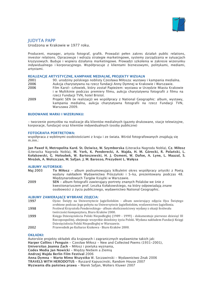 JUDYTA PAPP Urodzona w Krakowie w 1977 roku. Producent, manager, artysta fotograf, grafik. Prowadzi pełen zakres działań public relations, investor relations. Opracowuje i wdraża strategie marketingowe, systemy zarządzania w sytuacjach kryzysowych. Buduje i wspiera działania marketingowe. Prowadzi szkolenia w zakresie wizerunku indywidualnego i korporacyjnego. Współpracuje z klientami biznesowymi, politykami, mediami, artystami. REALIZACJE ARTYSTYCZNE, KAMPANIE MEDIALNE, PROJEKTY WIZUALN 2001 90. urodziny polskiego noblisty Czesława Miłosza: wystawy i kampania medialna. 2006 Aukcja charytatywna na rzecz fundacji Anny Dymnej w Krakowie i Warszawie. 2006 Film Karol- człowiek, który został Papieżem: wystawa w Urzędzie Miasta Krakowie i w Multikinie podczas premiery filmu, aukcja charytatywna fotografii z filmu na rzecz Fundacji TVN, hotel Bristol. 2009 Projekt SEN (w realizacji) we współpracy z National Geographic: album, wystawy, kampania medialna, aukcja charytatywna fotografii na rzecz Fundacji TVN, Warszawa 2009. BUDOWANIE MARKI I WIZERUNKU: - tworzenie pomysłów na realizacje dla klientów medialnych (gazety drukowane, stacje telewizyjne, korporacje, fundacje) oraz klientów indywidualnych (osoby publiczne) FOTOGRAFIA PORTRETOWA: współpraca z wybitnymi osobistościami z kraju i ze świata. Wśród fotografowanych znajdują się m.inn.: Jan Paweł II, Metropolita Kard. St. Dziwisz, W. Szymborska (Literacka Nagroda Nobla), Cz. Miłosz (Literacka Nagroda Nobla), M. York, K. Penderecki, A. Wajda, H. M. Górecki, R. Polański, L. Kołakowski, G. Holoubek, W. Bartoszewski, H. J. Osment, W. Dafoe, A. Lyne, L. Maazal, S. Mrożek, A. Wolszczan, M. Safjan. J. M. Barosso, Prezydent L. Wałęsa ALBUMY AUTORSKIE: Maj 2003 To Miłosz - album podsumowujący kilkuletni okres współpracy artystki z Poetą wydany nakładem Wydawnictwa Prószyński i S-ka, prezentowany podczas 48. Międzynarodowych Targów Książki w Warszawie. 2009 SEN - album fotografii zawierający portrety znanych Polaków we śnie z kwestionariuszem prof. Leszka Kołakowskiego, na który odpowiadają znane osobowości z życia publicznego, wydawnictwo National Geographic. ALBUMY ZAWIERAJĄCE WYBRANE ZDJĘCIA: Ojciec Święty na Uniwersytecie Jagiellońskim -‐ album zawierający zdjęcia Ojca Świętego 1997 zrobione podczas Jego pobytu na Uniwersytecie Jagiellońskim, wydawnictwo Jagiellonia. Festiwal Krzysztofa Pendereckiego -‐ album okolicznościowy wydany z okazji festiwalu 1998 twórczości kompozytora, Biuro Kraków 2000. Księga Dziesięciolecia Polski Niepodległej (1989 -‐ 1999) -‐ dokumentuje pierwsze dziesięć III 1999 Rzeczpospolitej, obejmuje wszystkie dziedziny życia Polski. Wydana nakładem Fundacji Księgi Dziesięciolecia Polski Niepodległej w Warszawie. Przewodnik po Kulturze Krakowa -‐ Biuro Kraków 2000. 2002 OKŁADKI: Autorskie projekty okładek dla krajowych i zagranicznych wydawnictw takich jak: Harper Collins i Penguin - Czesław Miłosz - New and Collected Poems (1931-2001), Universitas Joanna Zach - Miłosz i poetyka wyznania, Codex Media Jan Nowicki - Między Niebem a Ziemią Andrzej Wajda Berlin Film Festival 2006 Anna Dymna - Warto Mimo Wszystko W. Szczawinski - Wydawnictwo Znak 2006 TRAVELS WITH HERODOTUS - Ryszard Kapuscinski, Random House 2007 Wyzwania dla państwa prawa - Marek Safjan, Wolters Kluwer 2007 Andrzej Wajda Etnograficzny Remanent - katalog wystawy - Kraków, 2008 SEN - Judyta Papp / Leszek Kołakowski, National Geographic, 2009 Współpraca z wydawnictwami obejmuje dodatkowo projekty przygotowane dla: National Geographic, Jagiellonia, Muza, Wydawnictwo Literackie, Prószyński i S-ka Wydawnictwo Literackie INNE PROJEKTY GRAFICZNE: PLAKATY: - Autorskie wystawy fotograficzne, Kraków - Warszawa - Londyn - Galeria Autorska - Hotel Intercontinetal w Warszawie 2006-2007 - Wyzwania dla państwa prawa - Marek Safjan, Wolters Kluwer 2007 KATALOGI: - 90. Urodziny Czesława Miłosza - katalog wystawy do Magistratu, Kraków - Wystawy Karol film w fotografii Judyty Papp, 2005r - Andrzej Wajda Etnograficzny Remanent - oprawa graficzna wystawy, plakat, katalog, reklamy, zaproszenia - Krakow, 2008 PŁYTY CD, STRONY INTERNETOWE, REKLAMY FOTOGRAFIA REPORTAŻOWA: plany filmowe: ŚWIADECTWO - reż. P. Pitera - Rzym-Kraków - 2007 KAROL- CZLOWIEK, KTÓRY ZOSTAŁ PAPIEZEM - rez. Giacomo Battiato - Kraków 2005 r. EDGES OF THE LORD, reż. Yurek Bogayevicz - Nowy Sącz 2001 r. LOVE HARD WAY - reż. Peter Zehr - New York 2001 r. OGNIEM I MIECZEM - reż. Jerzy Hoffman - Warszawa 2000 r. ZŁOTO DEZERTERÓW - reż. Janusz Majewski - Warszawa 2001 r. przedstawienia teatralne: Jak wam się podoba, William Shakespeare, rez. Andrzej Wajda, Krakow 2001 WSPÓŁPRACA Z PRASĄ: Der Spiegel, El Pais, Paris Match, The New York Times, Reuters, Gazeta Wyborcza, Dziennik, Dekada Literacka, Newsweek, Polityka, Wprost, Tygodnik Powszechny, Film, VIVA!, Gala, Top Gear. AUTORSKIE WYSTAWY: 30 czerwca 2001 To Miłoszwystawa wielkoformatowych zdjęć Czesława Miłosza Kraków zorganizowana z okazji obchodów 90. rocznicy urodzin poety. 2001 Sztokholm Jubileusz 100. rocznicy wręczenia pierwszej Nagrody Nobla. 2002 Ołomuniec Fotografie Czesława Miłosza prezentowane na Festiwalu Poezji. 2002 Kraków Kraków - znaki szczególne: zbiór portretów wybitnych Polaków związanych z Krakowem m.in.: Papież Jan Paweł II, W. Szymborska, Cz. Miłosz, A. Dymna, S. Mrożek, R. Polański, K. Penderecki, A. Wajda. Twórca wystawy: Judyta Papp; współpraca organizacyjna: Urząd Miasta Krakowa; patronat honorowy: Prezydent Krakowa. 2003 Kraków, To Miłosz - wystawa w gmachu Muzeum Narodowego w Warszawie połączona Warszawa z promocją albumu To Miłosz. 2003 Kraków Czesław Miłosz - wystawa w Centrum Sztuki i Techniki Manggha. 2004 Kraków Noworoczna wystawa najnowszych zdjęć Czesława Miłosza połączona z aukcją charytatywną fotografii na rzecz Fundacji Anny Dymnej, Pałac Wielopolskich. 2005 Warszaw