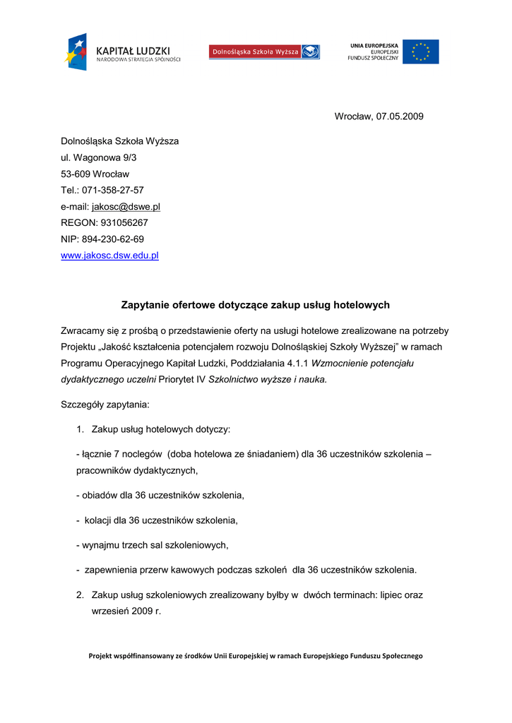 Wrocław, 07.05.2009 Dolnośląska Szkoła Wyższa ul. Wagonowa 9/3 53-609 Wrocław Tel.: 071-358-27-57 e-mail: [email protected] REGON: 931056267 NIP: 894-230-62-69 www.jakosc.dsw.edu.pl Zapytanie ofertowe dotyczące zakup usług hotelowych Zwracamy się z prośbą o przedstawienie oferty na usługi hotelowe zrealizowane na potrzeby Projektu „Jakość kształcenia potencjałem rozwoju Dolnośląskiej Szkoły Wyższej” w ramach Programu Operacyjnego Kapitał Ludzki, Poddziałania 4.1.1 Wzmocnienie potencjału dydaktycznego uczelni Priorytet IV Szkolnictwo wyższe i nauka. Szczegóły zapytania: 1. Zakup usług hotelowych dotyczy: - łącznie 7 noclegów (doba hotelowa ze śniadaniem) dla 36 uczestników szkolenia – pracowników dydaktycznych, - obiadów dla 36 uczestników szkolenia, - kolacji dla 36 uczestników szkolenia, - wynajmu trzech sal szkoleniowych, - zapewnienia przerw kawowych podczas szkoleń dla 36 uczestników szkolenia. 2. Zakup usług szkoleniowych zrealizowany byłby w dwóch terminach: lipiec oraz wrzesień 2009 r. Projekt współfinansowany ze środków Unii Europejskiej w ramach Europejskiego Funduszu Społecznego Złożona oferta powinna zawierać co najmniej: nazwę i adres oferenta opis nawiązujący do parametrów wyszczególnionych w zapytaniu ofertowym wartość oferty (netto i brutto) termin ważności oferty Oferta powinna posiadać datę sporządzenia. Termin składania ofert upływa 02.06.2009 Wybór najkorzystniejszej oferty nastąpi w oparciu o następujące kryteria 35 % 25 % cena jakość (spełnienie istotnych warunków zamówienia) gwarancja wykonania usługi dostępność 20 % 20 % 100% Z poważaniem Monika Siurdyban Koordynator Projektu Dolnośląska Szkoła Wyższa Projekt współfinansowany ze środków Unii Europejskiej w ramach Europejskiego Funduszu Społecznego