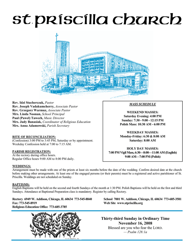 Rev. Idzi Stacherczak, Pastor Rev. Joseph Vadakumcherry, Associate Pastor Rev. Grzegorz Warmuz, Associate Pastor Mrs. Linda Noonan, School Principal Paul (Pawel) Tawech, Music Director Mrs. Judy Banasiak, Coordinator of Religious Education Mrs. Anna Adamowski, Parish Secretary RITE OF RECONCILIATION: (Confession) 3:00 PM to 3:45 PM, Saturday or by appointment. Weekday Confession held at 7:00 to 7:15 AM. PARISH REGISTRATION: At the rectory during office hours. Regular Office hours 9:00 AM to 8:00 PM daily. MASS SCHEDULE WEEKEND MASSES: Saturday Evening: 4:00 PM Sunday: 7:30 - 9:00 - 12:15 PM Polish Mass: 10:30 AM - 6:00 PM WEEKDAY MASSES: Monday-Friday: 6:30 & 8:00 AM Saturday: 8:00 AM HOLY DAY MASSES: 7:00 PM Vigil Mass, 6:30—8:00—11:00 AM (English) 9:00 AM—7:00 PM (Polish) WEDDINGS: Arrangement must be made with one of the priests at least six months before the date of the wedding. Confirm desired date at the church before making other arrangements. At least one of the engaged persons (or their parents) must be a registered and active parishioner of St. Priscilla. Weddings are not scheduled on Sunday. BAPTISMS: English Baptisms will be held on the second and fourth Sundays of the month at 1:30 PM. Polish Baptisms will be held on the first and third Sundays. Attendance at Baptismal Preparation class is mandatory. Register by calling Rectory. Rectory 6949 W. Addison, Chicago, IL 60634 773-545-8840 Fax: 773-545-8919 Religious Education Office 773-685-3785 School 7001 W. Addison, Chicago, IL 60634 773-685-3581 Web Site www.stpriscilla.org Thirty-third Sunday in Ordinary Time November 16, 2008 Blessed are you who fear the LORD. — Psalm 128:1a Page Two November 16, 2008 November 2008 Dear Sisters and Brothers in Christ: For over thirty-eight years, the Catholic Campaign for Human Development (CCHD) has been a living example of our Church’s social teaching. This year, CCHD is funding twenty-one organizations that work to address the root causes of poverty with seniors, youth, immigrants, people with disabilities and low-wage workers in Cook and Lake counties. Please make a special effort during this Thanksgiving season to give generously to the CCHD’s Collection this weekend. Your contribution will enable the poor to achieve greater dignity and to build God’s kingdom of justice and peace. One hundred percent of the CCHD budget comes from individual donations—of any size—just like yours. Your contribution does make a powerful difference. May God bless you for your support of the Catholic Campaign for Human Development. You and those you love are in my prayers; please keep me in yours. Drodzy Bracia i Siostry i Chrystusie: Katolicka Kampania na Rzecz Rozwoju Człowieka (CCHD) - program walki z biedą i ubóstwem działający od 38 lat—jest żywym przykładem stosowania w praktyce społecznej nauki Kościoła. W roku obecnym CCHD finansuje działalność 21 organizacji pracujących na rzecz zwalczania przyczyn ubóstwa wraz z osobami starszymi, młodzieżą, imigrantami, osobami niepełnosprawnymi i niskoopłacanymi pracownikami powiatów Cook i Lake. Proszę Was gorąco o szczodrość w czasie nadchodzącego okresu Dziękczynienia. Tegoroczna składka dla wspomożenia dzialałności CCHD będzie miała miejsce w obecny weekend. Wasze ofiary umożliwiają ubogim prowadzenie godnego życia i pomagają w budowaniu już dzisiaj Królestwa pokoju i sprawiedliwości. Budżet CCHD stanowią w stu procentach składki prywatne—w każdej wysokości—właśnie takie jak Wasza. Każda ofiara jaką złożycie na tacę ma wielkie znaczenie. Niech Bóg błogosławi Wam za wsparcie udzielane Katolickiej Kampanii na Rzecz Rozwoju Człowieka. Modlę się za Was i Waszych bliskich i proszę żebyście i Wy pamiętali o mnie w Waszych modlitwach. Oddany Wam w Chrystusie, Francis Kardynał George, O.M.I. Arcybiskup Chicago Thirty-Third Sunday in Ordinary Time THIRTY-THIRD SUNDAY IN ORDINARY TIME (16) 7:30 — +Stanley Wojewoda (Family) +Eleanor Mroz (Husband Gene) +In loving memory of Tomaszek Klepacz (Family) +Helen & George Fedor (Cromley Family) 9:00 — +Salvatore DeSimone (Family) +Al Cademartrie 21st Death Anniversary (Evelyn) +Frank Aredia Birthday Remembrance (Daughter) +Deceased Members of the Kokot Family +Celestina Barsellotti (Family) In Thanksgiving (Evelyn Cademartrie) +Bob Suwalski (Bill & Mary Hetland) +Charlie Hum (Bill & Mary Hetland) +Evarista Canet (Villegas Family) Dominador Macaso Good Healthy & Blessings Thanksgiving Mass (Teresito Villegas) 10:00— Wypominki 10:30— O zdrowie i bł. Boże dla Kazimiery Karbarz O Boże bł i łaskę zdrowia dla Andrzeja i rodziny +Jacek Śliwiński +Jadwiga Ulma +O szczęście wieczne dla Michałka i Stanisława Adamowski +Danuta, Mieczysław, Józefa i Stanisław Leśniak +O radość w wieczności dla Victora Burzyńskiego (Rodzice) +Józef, Franciszka, Konrad i Bogdana +Antoni Zapolski 9-ta rocz. śmierci +Maria i Mieczysław Dworzańczyk 12:15— +Deceased Members of Marienfeld Family (Jim Miketta) +Mary Koziara 19th Death Anniversary +Jan & Anna Łoś +John Lestina (Rosalie McGlynn) Thanksgiving Mass (Teresito Villegas) 6:00 — +Zdzisław Zabielski I-sza rocz. śmierci (Przyjaciele) MONDAY (17) Elizabeth of Hungary, religious 6:30 — All Souls in Purgatory 8:00 — +James & MaryEllen Barrett (James) TUESDAY (18) Weekday 6:30 — All Souls in Purgatory 8:00 — +Stanisław, Marian & Staś Kulaga (Family) WEDNESDAY (19) Weekday 6:30 — All Souls in Purgatory 8:00 — +Ann & Ray Burns (Family) THURSDAY (20) Weekday 6:30 — All Souls in Purgatory 8:00 — +Marlene Tucker (Hermina Schaefer) FRIDAY (21) Presentation of the Blessed Virgin Mary 6:30 — All Souls in Purgatory 8:00 — +Nora & Tony Patrice (Friend) Page Three SATURDAY (22) Cecilia, virgin, martyr 8:00 — +Myles Druffel (Frank & Dolores Firlotte) 4:00 — +Deceased Members of Niziolek Family (Voight Fam) +Rev. Thomas Hosty Birthday Remembrance (Manczak Family) +Jose Ray