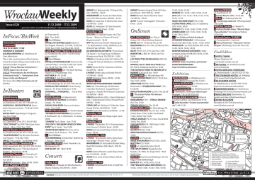 WrocławWeekly Free City Guide to Events, Music, Film, Theatre, Museum, Pubs & More Issue #226 11.12.2009 - 17.12.2009 > get more online: www.WroclawWeekly.pl > [email protected] InFocus:ThisWeek International Animation Day: Continued 14 & 15.12.2009 - 17:00 (Monday & Tuesday) Galeria ENTROPIA (ul. Rzeźnicza 4) Free Admission This is the continuation of the International Animation Day events held at the end of October. Program: [14.12] “Young Warsaw Animations" + “ASIFA Japan vol.1 & vol.2" [15.12] “Presentations by the Warsaw Animation Study" + “Animations from Korea, India and Bulgaria" For more info: http://entropia.art.pl/ (EN/PL) InTheaters Współczesny (Contemporary) Theatre (ul. Rzeźnicza 12, tel. 071/ 358-89-22) Akropolis. Rekonstrukcja (Acropolis, Reconstruction) - Fri & Sat 18:15; Sun 17:15 Nie do pary (Speaking in Tongues) Tue-Thu 19:00 Polski Theatre (ul. Zapolskiej 3, tel. 071/ 316-07-80) “Noc Trybad" by PWST Wrocław Actor School - Mon 11:00; Tue 19:00 Polski Theatre / Kameralna (ul. Świdnicka 28, tel. 071/ 316-07-52) “Gastronomia" by Wrocław Pantomime Theatre - Fri & Sat 19:00 Smycz (The Leash) - Tue & Wed 19:00 Polski Theatre / Świebodzki (pl. Orląt Lwowskich 20c, tel. 071/ 341-29-54) Nirvana (Based on “Tibetan Book of Death") - Mon & Tue 19:00 Komedia Theatre (pl. Teatralny 4) Mayday 2 (It Runs in the Family) - FriSun 20:00 Zemsta (Revenge) - Mon 10:00, 19:00 Lalek (Puppet) Theatre IMPART (ul. Mazowiecka 17) Kayah (Polish: 120PLN) - 20:30 BEZSENNOŚĆ (ul. Ruska 51) Matt Didemus (CA) (Electronica: 20PLN) - 21:00 RURA (ul. Łazienna 4) Optimystic (Jazz: 15/10PLN) - 21:00 ALIVE (ul. Kolejowa 12) [Jam Session] Wanted Friends (Free) - 21:00 Saturday 12th (pl.Teatralny 4) Sło - Thu 18:00 >> For Children: Mikołaj w teatrze lalek (Santa in the Puppet Theatre) - Fri 9:00, 12:00; Sat 15:00; Sun 11:00; Tue-Thu 9:00, 12:00 Lalek (Puppet) Theatre: RENOMA (ul. Świdnicka 40, Level -1 of the shopping centre)) >> For Children: Mikołaj w krainie bajek (Santa in the Land of Tales) - Fri 9:30, 12:00; Sat 12:00; Sun 16:00; Tue-Thu 9:30, 12:00 Ad Spectatores (At The Main Railway Station, ul. Piłsudskiego 103) Historia III - Fri 20:00 Historia II - Sat & Sun 20:00 CAPITOL Musical Theatre (ul. Piłsudskiego 67, tel. 071/789-04-52) Opera za trzy grosze (Three Penny Opera) - Fri & Sat 19:00; Sun 17:00 Chmurno... / PoDoBno... - Tue & Wed 20:00 ARKA Theatre (ul. Mennicza 3) Kamienie na szaniec (Forbidden Songs) - Fri 19:00 Oskar i Pani Róża (Oscar et la dame rose) - Thu 19:00 OPERA Wrocławska (ul. Świdnicka35) “Opowieści Hoffmanna (Les Contes d’Hoffmann)" by J. Offenbach - Fri & Sat 19:00 “Carmen" by G. Bizet - Sun 17:00 “Falstaff / The Merry Wives of Windsor" by G. Verdi - Tue 19:00 “Kobieta bez cienia (Die Frau ohne Schatten)" by R. Strauss - Thu 19:00 >> For Children: “Aschenbrödel (Cinderella)" [ballet] by J. Strauss - Wed 19:00 SONG THEATRE (Teatr Piosenki / ul. Mazowiecka 17) Ona na on - o! - Wed 19:00 G23/CRK (ul. Jagiellończyka 10c) The Kurws - “Music to ‘Prince of Persia’" (Experimental) - 18:00 WFF (Wytwórnia Filmów Fabularnych / ul. Wystawowa 1) Hey, Hatifnats, Lov (Polish/Pop: 50PLN) - 19:00 OD ZMIERZCHU DO ŚWITU (“From Dusk Till Dawn" / ul. Krupnicza 15) Believe (Progressive Rock: 30/25PLN) - 19:30 FIRLEJ (ul. Grabiszyńska 56) Callisto (FI) + Forge Of Clouds (Hardcore: 50/40PLN) - 20:00 RURA Tymon & The Transistors (Polish: 30/20PLN) - 20:00 ŁYKEND Słodki całus od buby (Polish: 15/10PLN) - 20:00 ALIVE Niebonie (Rock: 8PLN) - 21:00 Sunday 13th WROCŁAW PHILHARMONIC CONCERT HALL (ul. Piłsudskiego 19) Wrocław Chamber Orchestra “Leopoldinum" program: J.Haydn/W.A.Mozart (Classical: 30/20PLN) - 18:00 FIRLEJ Goatwhore (US) + Toxic Holocaust (US) + Skeletonwitch (US) (Thrash/Punk: 35PLN) - 19:00 STREFA WZ (pl. Wolności 7) Marika, Pepe Skuad (Polish: 39/29PLN) - 19:00 ALIVE Psychoformalina (10/6PLN) - 21:00 Monday 14th ALIVE [Jam Session] Indigo Light (Jazz: Free) - 21:00 Tuesday 15th ŁYKEND “December ‘81: A Commemoration Concert" (Polish: Free) - 20:00 RURA [Jam Session] Robert Chyła (Jazz: Free) - 20:30 Wednesday 16th Concerts ŁYKEND “Wrocławski Salon Jacka Kaczmarskiego" (Polish: Free) - 20:00 WAGENBURG (ul. Na Grobli) Rocket Mary, Road Kill Zombies (DE) (Rock: 10PLN) 20:00 RURA Ziemia Planeta Ludzi (Experimental: 15/10PLN) - 20:30 ALIVE Chris June & Halo (Metal: 2PLN) - 21:00 ŁYKEND (ul. Podwale 37/38) Mechanicy Shanty (Shanty: 30/25PLN) - 20:00 ŁYKEND Carrantuohill (Irish: 25/20PLN) - 20:00 Friday 11th Thursday 17th Contact: Wrocław Tourist Information Center, Rynek 14, 50-101 Wrocław, tel. (+48 71) 344 31 11 IMPART Harlem Gospel Choir (US) (Gospel/Choir: 140/110PLN) - 20:00 RURA Bartosz Pernal Quintet (Jazz: 14/10PLN) - 20:30 ALIVE “Carols: Unplugged" (Acoustic: Free) - 21:00 OnScreen ACF DWORCOWE (ul. Piłsudskiego 105 / Main Railway Station) Nord (SE) Fri 14:30; Sat-Thu 21:45 Galerianki (PL) Fri 15:45, 22:00; Sat-Thu 15:30, 20:15 Ricky (FR/IT) Fri 17:15; Sat-Thu 17:00 Buntat na L. (BG) Fri 18:45; Sat-Thu 18:30 Les Triplettes de Belleville (FR/CA) Fri 20:30 Nurkuj, Olly! / Dive Olly Dive! (GB/ US: Polish Dubbed) Sat & Sun 13:00 The Sound of Insects: Record of a Mummy (CH) Sat & Sun 14:00 WARSZAWA (ul. Piłsudskiego 64) Taking Woodstock (US) Fri 15:45; SatThu 15:45, 20:00 Séraphine (BE/FR) 17:45 Grotowski’s “Książę Niezłomny" (PL) Fri 20:00 Bracia Karamazow (CZ/PL) Thu 20:00 >> The Latest Polish Film Review “Cinemahrad": Konsumenci (PL) + Teraz i zawsze (PL) Thu 17:00 Terror wizja (PL) Thu 20:00 WARSZAWA: NOT (ul. Piłsudskiego 74) Epidemia miłości (PL) Fri-Sun 17:00, 20:00; Mon 17:00, 18:00; Tue & Wed 17:00, 20:00; Thu 19:00 Teraz i zawsze (PL) Fri-Sun, Tue & Wed 18:00; Thu 20:00 Sun Qingguo (CN, 1985) Mon 19:00 Mleczarnia Café & Hostel LWOW (ul. 1.Hallera 15) 2. Współczesny (Contemporary) pl. Jana Pawła II District 9 (US) 17:00 Theatre 3. Lalekkvinnor (Puppet) Theatre Män som hatar (DK/SE