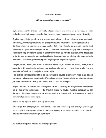 Dominika Sobel „Mimo wszystko, mogę wszystko” Była zima, płatki śniegu wirowały eleganckiego walczyka w powietrzu, a wiatr cichutko zawodził swoją melodię. Na dworze, mimo wczesnej pory, ściemniało się. Agatka z przyklejonym do szyby nosem siedziała przy oknie i obserwowała podwórko kamienicy, do której niedawno się przeprowadzili z rodzicami i starszą siostrą Elą. Dookoła domy z czerwonej cegły, trochę dalej mały kiosk, po prawej stronie jakiś kolorowy budynek otoczony parkanem… Właśnie tam teraz spoglądała dziewczynka. Rzucające się śnieżkami dzieci o zarumienionych od mrozu buziach, inne biegające to tu, to tam wzajemnie się przekrzykiwały, jeszcze inne — chyba młodsze — lepiły bałwana. Dochodzący stamtąd przez szybę gwar, zirytował Agatkę. Minęła jesień, znów jest zima, a ona nie może wyjść nawet na sanki, pomyślała z zawodem. Z zazdrością patrzyła na goniące się dzieci — była trochę zła, bo ona musiała być w domu i omijała ją taka frajda. Pan doktor powiedział ostatnio, że jej serduszko szybko się męczy, więc musi dbać o nie jak o najlepszego przyjaciela. Polecił wprawdzie Agatce dużo się uśmiechać, ale jak się tu uśmiechać, kiedy nic nie można, bo jest się chorym? Nagle ni stąd, ni zowąd coś uderzyło w okno. Dziewczynka natychmiast otrząsnęła się z ponurych rozmyślań — to śnieżka trafiła w szybę. Agatka spojrzała w dół. Jeden z chłopców bawiących się na podwórku przyległym do kolorowego budynku, pomachał jej serdecznie ręką. Zaskoczona Agatka schowała się za firanką. „Dlaczego ten chłopczyk mi pomachał? Przecież wcale się nie znamy”, przebiegło przez myśl dziewczynce, ale głos mamy wołającej ją na obiad sprawił, że po chwili to zdarzenie całkiem uleciało jej z pamięci. * Po obiedzie Agatka wróciła do swojego pokoju. 1 — Może byś coś narysowała? — zaproponowała mama widząc znudzenie córki. — Nie mam ochoty… — odparła znużonym głosem. — Zobacz, dostałaś nowe kredki. Te, o których marzyłaś… — mama najwyraźniej nie dawała za wygraną. — Mogłabyś na przykład narysować naszą ostatnią wizytę u cioci Krysi i wujka Leona albo niedzielny spacer... To prawda — zabawa u wujostwa z Zuzią, Marianką i Wojtkiem była przednia, a wspomnienie ostatniego spaceru w parku, na placu zabaw jeszcze długo będzie ją cieszyć — ale Agatka po prostu nie miała ochoty na rysowanie. Wolałaby szalone psoty na podwórku, może mogłaby nawet uprosić mamę, żeby zawitać do dzieci, które wcześniej widziała przez okno, niż siedzieć w pokoju sama jak palec. Ela była jeszcze w szkole, a kiedy wróci pewnie będzie musiała odrabiać lekcje, a jej się nudzi teraz! Agatka znów podeszła do okna — dzieci już nie było. Ale zaraz, zaraz… Ktoś tam jeszcze skacze na jednej nóżce po śniegu jak wróbelek. To ten chłopiec, który przed obiadem ją pozdrowił. Teraz też — jakby spodziewając się, że ją zobaczy — nagle odwrócił się prosto w stronę okna dziewczynki i radośnie pomachał. Tym razem Agatka się nie speszyła — ucieszyła się, że ktoś nowy wie, że tutaj mieszka i może kiedyś go spotka. Ale niestety, po chwili jakaś pani podeszła do chłopca, nachyliła się od niego i powiedziała coś, po czym chłopiec odwrócił się i razem z nią pomaszerował w stronę tego dużego, kolorowego domu. Podwórko zostało całkiem puste, umilkły głosy, które wcześniej tak zezłościły dziewczynkę i zrobiło się całkiem cicho i pusto. * Następnego dnia Agatka po śniadaniu postanowiła obserwować, co dzieje się za oknem. Może ten chłopiec, który wczoraj ją zauważył, znów będzie się tu bawił? Agatka z nadzieją co chwila podchodziła do okna zaniedbując Anię — swoją ulubioną lalkę. — Mamusiu… — zaczęła niepewnie, gdy mama weszła do pokoju. — Dlaczego dziś nie ma tych dzieci, które wczoraj bawiły się tam na podwórku? — Agata wskazała brodą niewiele oddalony od ich kamienicy budynek. 2 — Kochanie, może pojechały na wycieczkę lub wyszły na spacer… — rozważania mamy przerwał nagły dźwięk domofonu. „Kto to może być o tej porze? Pan listonosz, a może babcia?” — mama już otwierała drzwi, gdy Agatka analizowała w myślach, kto mógł ich odwiedzić. W przedpokoju słychać było jakieś nieznajome głosy — jeden młodszy, drugi starszy. Agata z ciekawością wyściubiła nos zza drzwi pokoju. „To ten chłopiec!” — pomyślała rozgorączkowana widząc znajomą twarz. — „Co on może tu robić?” Tymczasem mama już zapraszała panią, która go przyprowadziła, do kuchni, a małego gościa kierowała w stronę pokoju Agaty. „Puk, puk!” — rozległo się pukanie. — Agatko, masz gościa. — zakomunikowała uroczyście mama, otwierając drzwi. — To Piotrek, mieszka nieopodal… — trajkotała dalej. — Cześć! — chłopiec dziarsko wyciągnął rękę na powitanie. — Jestem Piotrek. — Cześć… — wychrypiała zdziwiona dziewczynka. — Agata… — przedstawiła się podając dłoń chłopcu. — Co tutaj robisz? — Przyszedłem cię odwiedzić. Pomyślałem, że się nudzisz i zapytałem się naszej pani, czy mogę do ciebie pójść. — tłumaczył chłopiec. Agatka patrzyła na niego zaskoczona: — To nie była twoja mama? — Nie, nie mam ani mamy, ani taty — wyjaśnił zdumionej dziewczynce w warkoczykach mały chłopiec. — Mieszkam w domu dziecka… Agata zaczęła wypytywać Piotrusia o to, jak to jest w domu dziecka, czy ma miłe towarzystwo, sama zaś opowiedziała mu o swojej chorobie… Chłopiec ochoczo opowiadał o sobie z zapałem pałaszując ciastka z marmoladą, które przyniosła na tacy mama; zaskoczył Agatkę, że wszyscy są bardzo dobrzy dla siebie i chętnie sobie pomagają. — Ale jak to? Nie kłócicie się o zabawki? Ja z moją siostrą czasami drzemy koty, bo ja chcę 