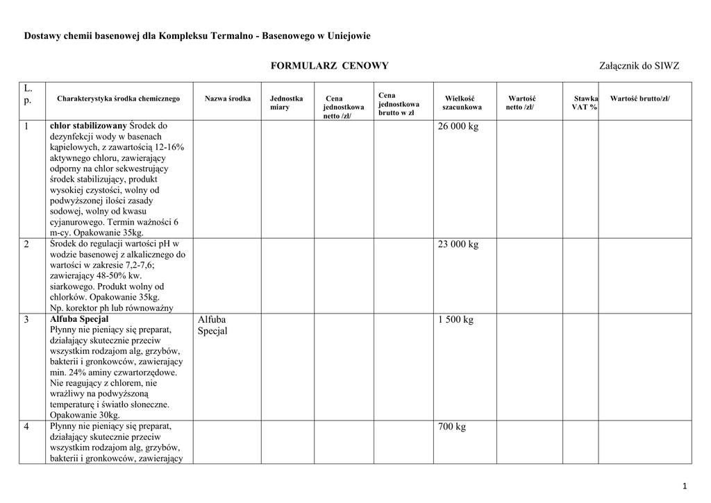Dostawy chemii basenowej dla Kompleksu Termalno - Basenowego w Uniejowie Załącznik do SIWZ FORMULARZ CENOWY L. p. 1 2 3 4 Charakterystyka środka chemicznego chlor stabilizowany Środek do dezynfekcji wody w basenach kąpielowych, z zawartością 12-16% aktywnego chloru, zawierający odporny na chlor sekwestrujący środek stabilizujący, produkt wysokiej czystości, wolny od podwyższonej ilości zasady sodowej, wolny od kwasu cyjanurowego. Termin ważności 6 m-cy. Opakowanie 35kg. Środek do regulacji wartości pH w wodzie basenowej z alkalicznego do wartości w zakresie 7,2-7,6; zawierający 48-50% kw. siarkowego. Produkt wolny od chlorków. Opakowanie 35kg. Np. korektor ph lub równoważny Alfuba Specjal Płynny nie pieniący się preparat, działający skutecznie przeciw wszystkim rodzajom alg, grzybów, bakterii i gronkowców, zawierający min. 24% aminy czwartorzędowe. Nie reagujący z chlorem, nie wrażliwy na podwyższoną temperaturę i światło słoneczne. Opakowanie 30kg. Płynny nie pieniący się preparat, działający skutecznie przeciw wszystkim rodzajom alg, grzybów, bakterii i gronkowców, zawierający Nazwa środka Jednostka miary Cena jednostkowa netto /zł/ Cena jednostkowa brutto w zł Wielkość szacunkowa Wartość netto /zł/ Stawka VAT % Wartość brutto/zł/ 26 000 kg 23 000 kg Alfuba Specjal 1 500 kg 700 kg 1 Dostawy chemii basenowej dla Kompleksu Termalno - Basenowego w Uniejowie min. 36% aminy czwartorzędowe. Nie reagujący z chlorem, nie wrażliwy na podwyższoną temperaturę i światło słoneczne. W okresie wyższych temperatur i dużego nasłonecznienia skutecznie zabezpieczający przed rozwojem glonów na basenie. Opakowanie 35kg. Np. Algen Super lub równoważny 5 Kwaśny, płynny środek myjący, usuwający kamień, wapno i naloty mineralne, zawiera <25%, <10% kwasu ortofosforowego, biologicznie rozkładające się środki powierzchniowo-czynne, inhibitory korozji. Rozcieńczalny 1:100. Opakowanie 35kg. 150 kg Np. Compactal lub równoważny 6 Alkaliczny, płynny środek czyszczący, usuwający wszelkie zabrudzenia organiczne, tłuszcze i oleje, zawierający alkohole i glikole <10%, wodorotlenek sodowy [sic!] <10%, biologicznie rozkładające się środki powierzchniowo-czynne, środki ochrony skóry, substancje zapachowe, wysokowartościowe środki powierzchniowo-czynne, ładnie pachnący, wolny od związków chloru, podchlorynu sodu, chloranu sodu. Rozcieńczalny w stosunku 1:100. Opakowanie 30 kg. 150 kg Np. Flisan lub równoważny 7 Wysoko aktywny środek do czyszczenia folii i tworzyw sztucznych, usuwania tłuszczów, 120 kg 2 Dostawy chemii basenowej dla Kompleksu Termalno - Basenowego w Uniejowie oleju i rdzy nalotowej. Do usuwania zabrudzeń z krawędzi basenu na linii wody. Zawierający alkohole, glikole, środki ochronne, środki powierzchniowo-czynne szybko biodegradalne, środki zapachowe. Preparat musi być dopuszczony do bezpośredniego kontaktu z wodą basenową, wolny od związków chloru, podchlorynu sodu, chloranu sodu. Np. Randklar lub równoważny 8 9 Tabletka solna na bazie soli spożywczej o średnicy 25 mm i grubości 13 mm, obustronna soczewka, o zawartości min. 99,4% (zalecana 99,9%, aby sól była wolna od jakichkolwiek koagulant i zwiększyć żywotność membrany). Sól nie powinna przekraczać następujących wartości: a) materiały rozpuszczalne: max. 100ppm b) wapń: max. 70ppm c) magnez: max. 70ppm. Preparat do stosowania w profesjonalnych elekrolizerach basenowych. Opakowanie 25kg. Płynny, hydratyzowany chlorek glinu, wytrącający zanieczyszczenia powodujące zmętnienie wodybasenowej i osadzający je na złożu filtracyjnym. Skuteczność działania w zakresie 5-9 pH. Obojętny wobec chloru. Dawka dozowania max w przedziale 0,2-0,5 g/m3 wody przepływającej. Opakowanie 30kg. 32 000 kg 3 200 kg Np. Flockmix Ultra płynny lub równoważny 3 Dostawy chemii basenowej dla Kompleksu Termalno - Basenowego w Uniejowie 10 11 Chloryn sodu o zawartości 7,5%, stosowany z innym składnikiem do wytwarzania ClO2 (dwutlenku chloru). Opakowanie 30kg. Kwas solny o stężeniu 9%, stosowany z innym składnikiem do wytwarzania ClO2. Opakowanie 30kg. 450 kg 450 kg Razem: ……………………………………..…… (Pieczęć Wykonawcy oraz podpis osoby upoważnionej) 4