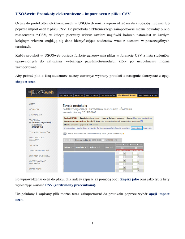 USOSweb: Protokoły elektroniczne - import ocen z pliku CSV Oceny do protokołów elektronicznych w USOSweb można wprowadzać na dwa sposoby: ręcznie lub poprzez import ocen z pliku CSV. Do protokołu elektronicznego zaimportować można dowolny plik o rozszerzeniu *.CSV, w którym pierwszy wiersz zawiera nagłówki kolumn natomiast w każdym kolejnym wierszu znajdują się dane identyfikujące studentów wraz z ocenami w poszczególnych terminach. Każdy protokół w USOSweb posiada funkcję generowania pliku w formacie CSV z listą studentów uprawnionych do zaliczania wybranego przedmiotu/modułu, który po uzupełnieniu można zaimportować. Aby pobrać plik z listą studentów należy otworzyć wybrany protokół a następnie skorzystać z opcji eksport ocen. Po wprowadzeniu ocen do pliku, plik należy zapisać za pomocą opcji Zapisz jako oraz jako typ z listy wybierając wartość CSV (rozdzielony przecinkami). Uzupełniony i zapisany plik można teraz zaimportować do protokołu poprzez wybór opcji import ocen. 1 W formularzu importu należy wybrać wcześniej przygotowany plik a następnie wczytać zawartość pliku naciskając PRZEŚLIJ. W kolejnym kroku należy dokonać przypisania kolumn z pliku do odpowiednich atrybutów protokołu. W pierwszej kolumnie (Nazwa kolumny) znajduje się lista nagłówków kolumn z pliku CSV, w drugiej kolumnie należy natomiast wybrane kolumny przypisać do odpowiednich pól protokołu. Aby system mógł przyporządkować oceny właściwym osobom konieczne jest przypisanie numeru indeksu lud identyfikatora osoby (os_id) oraz kolumny zawierającej oceny. Jeżeli w pliku znajdują się oceny dla kilku terminów protokołu, w formularzu należy wskazać kilka kolumn z ocenami odpowiednio dla każdego terminu. 2 Poniżej formularza służącego do mapowania kolumn znajduje się podgląd zawartości importowanego pliku. Jeżeli zawartość pliku nie jest rozdzielona na poszczególne kolumny oznacza to, że plik został zapisany w innym formacie aniżeli CSV. Po zaznaczeniu odpowiednich opcji należy kliknąć przycisk IMPORTUJ. W tym momencie protokół zostanie uzupełniony ocenami z pliku. 3