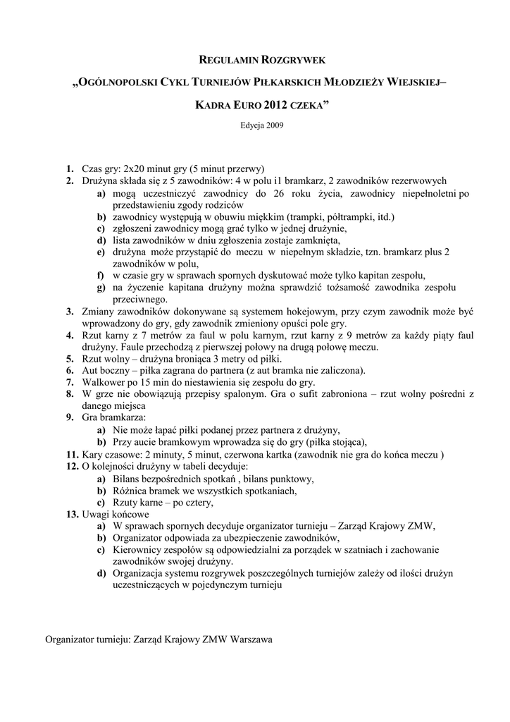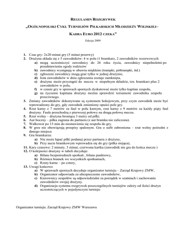 REGULAMIN ROZGRYWEK „OGÓLNOPOLSKI CYKL TURNIEJÓW PIŁKARSKICH MŁODZIEŻY WIEJSKIEJ– KADRA EURO 2012 CZEKA” Edycja 2009 1. Czas gry: 2x20 minut gry (5 minut przerwy) 2. Drużyna składa się z 5 zawodników: 4 w polu i1 bramkarz, 2 zawodników rezerwowych a) mogą uczestniczyć zawodnicy do 26 roku życia, zawodnicy niepełnoletni po przedstawieniu zgody rodziców b) zawodnicy występują w obuwiu miękkim (trampki, półtrampki, itd.) c) zgłoszeni zawodnicy mogą grać tylko w jednej drużynie, d) lista zawodników w dniu zgłoszenia zostaje zamknięta, e) drużyna może przystąpić do meczu w niepełnym składzie, tzn. bramkarz plus 2 zawodników w polu, f) w czasie gry w sprawach spornych dyskutować może tylko kapitan zespołu, g) na życzenie kapitana drużyny można sprawdzić tożsamość zawodnika zespołu przeciwnego. 3. Zmiany zawodników dokonywane są systemem hokejowym, przy czym zawodnik może być wprowadzony do gry, gdy zawodnik zmieniony opuści pole gry. 4. Rzut karny z 7 metrów za faul w polu karnym, rzut karny z 9 metrów za każdy piąty faul drużyny. Faule przechodzą z pierwszej połowy na drugą połowę meczu. 5. Rzut wolny – drużyna broniąca 3 metry od piłki. 6. Aut boczny – piłka zagrana do partnera (z aut bramka nie zaliczona). 7. Walkower po 15 min do niestawienia się zespołu do gry. 8. W grze nie obowiązują przepisy spalonym. Gra o sufit zabroniona – rzut wolny pośredni z danego miejsca 9. Gra bramkarza: a) Nie może łapać piłki podanej przez partnera z drużyny, b) Przy aucie bramkowym wprowadza się do gry (piłka stojąca), 11. Kary czasowe: 2 minuty, 5 minut, czerwona kartka (zawodnik nie gra do końca meczu ) 12. O kolejności drużyny w tabeli decyduje: a) Bilans bezpośrednich spotkań , bilans punktowy, b) Różnica bramek we wszystkich spotkaniach, c) Rzuty karne – po cztery, 13. Uwagi końcowe a) W sprawach spornych decyduje organizator turnieju – Zarząd Krajowy ZMW, b) Organizator odpowiada za ubezpieczenie zawodników, c) Kierownicy zespołów są odpowiedzialni za porządek w szatniach i zachowanie zawodników swojej drużyny. d) Organizacja systemu rozgrywek poszczególnych turniejów zależy od ilości drużyn uczestniczących w pojedynczym turnieju Organizator turnieju: Zarząd Krajowy ZMW Warszawa