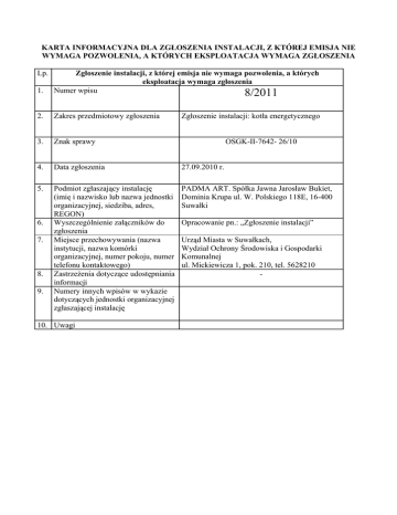 KARTA INFORMACYJNA DLA ZGŁOSZENIA INSTALACJI, Z KTÓREJ EMISJA NIE WYMAGA POZWOLENIA, A KTÓRYCH EKSPLOATACJA WYMAGA ZGŁOSZENIA Lp. 1. Zgłoszenie instalacji, z której emisja nie wymaga pozwolenia, a których eksploatacja wymaga zgłoszenia Numer wpisu 8/2011 2. Zakres przedmiotowy zgłoszenia 3. Znak sprawy 4. Data zgłoszenia 27.09.2010 r. 5. Podmiot zgłaszający instalację (imię i nazwisko lub nazwa jednostki organizacyjnej, siedziba, adres, REGON) Wyszczególnienie załączników do zgłoszenia Miejsce przechowywania (nazwa instytucji, nazwa komórki organizacyjnej, numer pokoju, numer telefonu kontaktowego) Zastrzeżenia dotyczące udostępniania informacji Numery innych wpisów w wykazie dotyczących jednostki organizacyjnej zgłaszającej instalację PADMA ART. Spółka Jawna Jarosław Bukiet, Dominia Krupa ul. W. Polskiego 118E, 16-400 Suwałki 6. 7. 8. 9. 10. Uwagi Zgłoszenie instalacji: kotła energetycznego OSGK-II-7642- 26/10 Opracowanie pn.: „Zgłoszenie instalacji” Urząd Miasta w Suwałkach, Wydział Ochrony Środowiska i Gospodarki Komunalnej ul. Mickiewicza 1, pok. 210, tel. 5628210 -