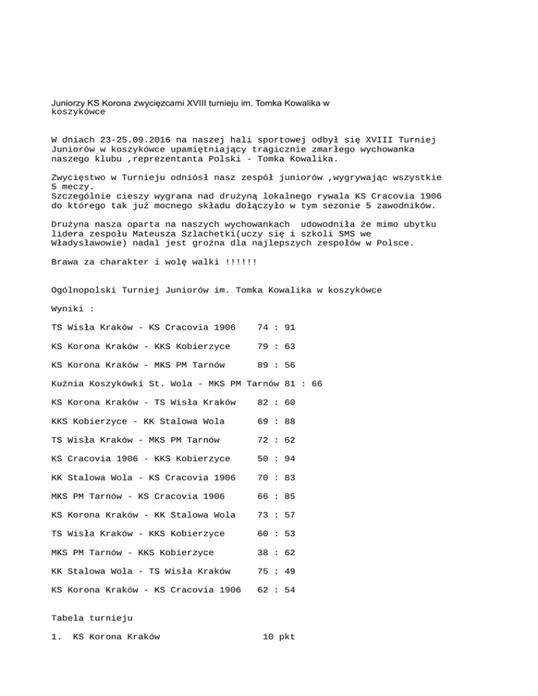 Juniorzy KS Korona zwycięzcami XVIII turnieju im. Tomka Kowalika w koszykówce W dniach 23-25.09.2016 na naszej hali sportowej odbył się XVIII Turniej Juniorów w koszykówce upamiętniający tragicznie zmarłego wychowanka naszego klubu ,reprezentanta Polski - Tomka Kowalika. Zwycięstwo w Turnieju odniósł nasz zespół juniorów ,wygrywając wszystkie 5 meczy. Szczególnie cieszy wygrana nad drużyną lokalnego rywala KS Cracovia 1906 do którego tak już mocnego składu dołączyło w tym sezonie 5 zawodników. Drużyna nasza oparta na naszych wychowankach udowodniła że mimo ubytku lidera zespołu Mateusza Szlachetki(uczy się i szkoli SMS we Władysławowie) nadal jest groźna dla najlepszych zespołów w Polsce. Brawa za charakter i wolę walki !!!!!! Ogólnopolski Turniej Juniorów im. Tomka Kowalika w koszykówce Wyniki : TS Wisła Kraków - KS Cracovia 1906 74 : 91 KS Korona Kraków - KKS Kobierzyce 79 : 63 KS Korona Kraków - MKS PM Tarnów 89 : 56 Kuźnia Koszykówki St. Wola - MKS PM Tarnów 81 : 66 KS Korona Kraków - TS Wisła Kraków 82 : 60 KKS Kobierzyce - KK Stalowa Wola 69 : 88 TS Wisła Kraków - MKS PM Tarnów 72 : 62 KS Cracovia 1906 - KKS Kobierzyce 50 : 94 KK Stalowa Wola - KS Cracovia 1906 70 : 83 MKS PM Tarnów - KS Cracovia 1906 66 : 85 KS Korona Kraków - KK Stalowa Wola 73 : 57 TS Wisła Kraków - KKS Kobierzyce 60 : 53 MKS PM Tarnów - KKS Kobierzyce 38 : 62 KK Stalowa Wola - TS Wisła Kraków 75 : 49 KS Korona Kraków - KS Cracovia 1906 62 : 54 Tabela turnieju 1. KS Korona Kraków 10 pkt 2. KS Cracovia 1906 Kraków 9 pkt 3. Kuźnia Koszykówki Stalowa Wola 8 pkt 4. TS Wisła Kraków 7 pkt 5. KKS Kobierzyce 6 pkt 6. MKS PM Tarnów 5 pkt Najlepszy zawodnik turnieju MVP - Maciej Koperski Maciej - Korona Kraków Najlepsi zawodnicy drużyn : KS Korona - Maciej Skorupski KS Cracovia - KK Stalowa Wola TS Wisła - Łukasz Bogusławski - Nieznański Mateusz Wierzba Jakub KKS Kobierzyce MKS PM Tarnów - Esangdebo Josh Kras Aleksander Turniej organizowany przy współudziale Urzędu Miasta Krakowa. Skład zwycięskiej drużyny : Michał Pieniążek, Maciej Skorupski, Tomasz Betley , Bartłomiej Chmiel, Jan Brykalski, Maciej Koperski, Maciej Wolnicki, Krystian Zawada, Maciej Pluciński, Gabriel Raś, Michał Przepiórski, Olek Gil, Stanisław Kubać,