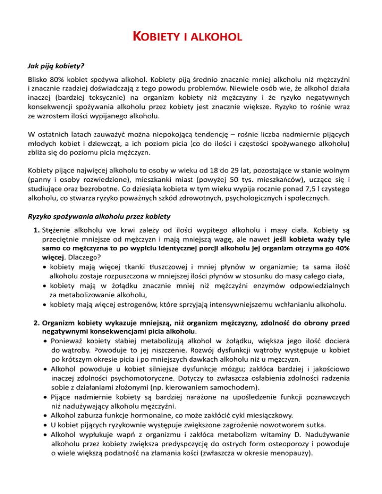 KOBIETY I ALKOHOL Jak piją kobiety? Blisko 80% kobiet spożywa alkohol. Kobiety piją średnio znacznie mniej alkoholu niż mężczyźni i znacznie rzadziej doświadczają z tego powodu problemów. Niewiele osób wie, że alkohol działa inaczej (bardziej toksycznie) na organizm kobiety niż mężczyzny i że ryzyko negatywnych konsekwencji spożywania alkoholu przez kobiety jest znacznie większe. Ryzyko to rośnie wraz ze wzrostem ilości wypijanego alkoholu. W ostatnich latach zauważyć można niepokojącą tendencję – rośnie liczba nadmiernie pijących młodych kobiet i dziewcząt, a ich poziom picia (co do ilości i częstości spożywanego alkoholu) zbliża się do poziomu picia mężczyzn. Kobiety pijące najwięcej alkoholu to osoby w wieku od 18 do 29 lat, pozostające w stanie wolnym (panny i osoby rozwiedzione), mieszkanki miast (powyżej 50 tys. mieszkańców), uczące się i studiujące oraz bezrobotne. Co dziesiąta kobieta w tym wieku wypija rocznie ponad 7,5 l czystego alkoholu, co stwarza ryzyko poważnych szkód zdrowotnych, psychologicznych i społecznych. Ryzyko spożywania alkoholu przez kobiety 1. Stężenie alkoholu we krwi zależy od ilości wypitego alkoholu i masy ciała. Kobiety są przeciętnie mniejsze od mężczyzn i mają mniejszą wagę, ale nawet jeśli kobieta waży tyle samo co mężczyzna to po wypiciu identycznej porcji alkoholu jej organizm otrzyma go 40% więcej. Dlaczego? kobiety mają więcej tkanki tłuszczowej i mniej płynów w organizmie; ta sama ilość alkoholu zostaje rozpuszczona w mniejszej ilości płynów w stosunku do masy całego ciała, kobiety mają w żołądku znacznie mniej niż mężczyźni enzymów odpowiedzialnych za metabolizowanie alkoholu, kobiety mają więcej estrogenów, które sprzyjają intensywniejszemu wchłanianiu alkoholu. 2. Organizm kobiety wykazuje mniejszą, niż organizm mężczyzny, zdolność do obrony przed negatywnymi konsekwencjami picia alkoholu. Ponieważ kobiety słabiej metabolizują alkohol w żołądku, większa jego ilość dociera do wątroby. Powoduje to jej niszczenie. Rozwój dysfunkcji wątroby występuje u kobiet po krótszym okresie picia i po mniejszych dawkach alkoholu niż u mężczyzn. Alkohol powoduje u kobiet silniejsze dysfunkcje mózgu; zakłóca bardziej i jakościowo inaczej zdolności psychomotoryczne. Dotyczy to zwłaszcza osłabienia zdolności radzenia sobie z działaniami złożonymi (np. kierowaniem samochodem). Pijące nadmiernie kobiety są bardziej narażone na upośledzenie funkcji poznawczych niż nadużywający alkoholu mężczyźni. Alkohol zaburza funkcje hormonalne, co może zakłócić cykl miesiączkowy. U kobiet pijących ryzykownie występuje zwiększone zagrożenie nowotworem sutka. Alkohol wypłukuje wapń z organizmu i zakłóca metabolizm witaminy D. Nadużywanie alkoholu przez kobiety zwiększa predyspozycję do ostrych form osteoporozy i powoduje o wiele większą podatność na złamania kości (zwłaszcza w okresie menopauzy). Skutkiem nadużywania alkoholu przez kobiety może być brak zainteresowania seksem, oziębłość płciowa i niezdolność do przeżywania orgazmu. Ryzykowne spożywanie alkoholu przez kobiety może być przyczyną występowania zaburzeń nastroju, zwłaszcza o charakterze lękowym i depresyjnym. Każda ilość alkoholu spożywanego przez kobiety w ciąży działa toksycznie na rozwijające się w ich łonie dziecko. U kobiet pijących alkohol podczas ciąży znacznie częściej występują przedwczesne porody oraz poronienia, jak również wzrasta prawdopodobieństwo urodzenia dziecka z wadami. 3. Ryzyko szkód zdrowotnych pojawia się już wtedy, gdy kobieta wypija dziennie więcej niż dwie standardowe porcje alkoholu (czyli 1 półlitrowe piwo, kieliszek wina o pojemności 200 ml, czy 60 ml wódki). Trzy standardowe porcje alkoholu dziennie powodują u kobiet zaburzenia zdrowia, które występują u mężczyzn pijących więcej niż dziewięć standardowych porcji alkoholu dziennie. 4. Kobiety nadmiernie pijące są częściej niż pijący nadmiernie mężczyźni ofiarami: wypadków, urazów, przemocy fizycznej, gwałtów i nadużyć seksualnych. 5. Picie alkoholu zwiększa natężenie zachowań ryzykownych, w tym seksualnych, co pociąga za sobą zagrożenie przemocą seksualną, zakażeniami czy niechcianą ciążą. ŹRÓDŁO: J. FUDAŁA „KOBIETY I ALKOHOL”. PARPAMEDIA 2007