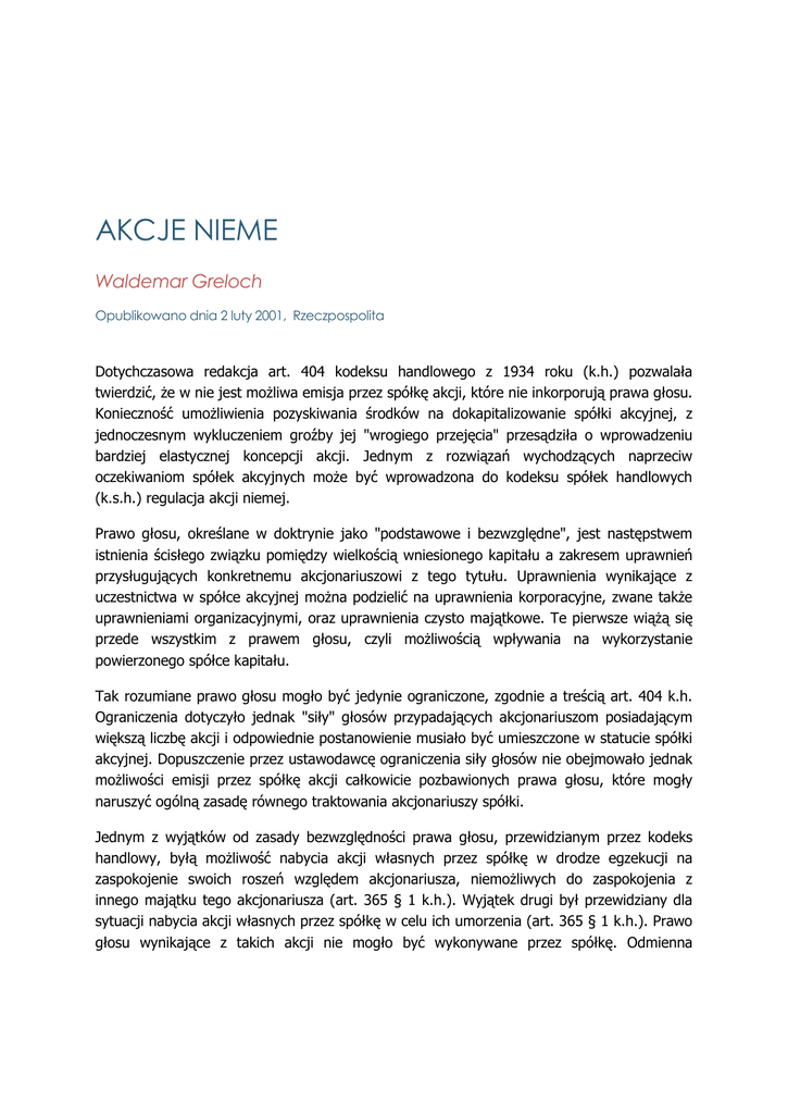 AKCJE NIEME Waldemar Greloch Opublikowano dnia 2 luty 2001, Rzeczpospolita Dotychczasowa redakcja art. 404 kodeksu handlowego z 1934 roku (k.h.) pozwalała twierdzić, że w nie jest możliwa emisja przez spółkę akcji, które nie inkorporują prawa głosu. Konieczność umożliwienia pozyskiwania środków na dokapitalizowanie spółki akcyjnej, z jednoczesnym wykluczeniem groźby jej "wrogiego przejęcia" przesądziła o wprowadzeniu bardziej elastycznej koncepcji akcji. Jednym z rozwiązań wychodzących naprzeciw oczekiwaniom spółek akcyjnych może być wprowadzona do kodeksu spółek handlowych (k.s.h.) regulacja akcji niemej. Prawo głosu, określane w doktrynie jako "podstawowe i bezwzględne", jest następstwem istnienia ścisłego związku pomiędzy wielkością wniesionego kapitału a zakresem uprawnień przysługujących konkretnemu akcjonariuszowi z tego tytułu. Uprawnienia wynikające z uczestnictwa w spółce akcyjnej można podzielić na uprawnienia korporacyjne, zwane także uprawnieniami organizacyjnymi, oraz uprawnienia czysto majątkowe. Te pierwsze wiążą się przede wszystkim z prawem głosu, czyli możliwością wpływania na wykorzystanie powierzonego spółce kapitału. Tak rozumiane prawo głosu mogło być jedynie ograniczone, zgodnie a treścią art. 404 k.h. Ograniczenia dotyczyło jednak "siły" głosów przypadających akcjonariuszom posiadającym większą liczbę akcji i odpowiednie postanowienie musiało być umieszczone w statucie spółki akcyjnej. Dopuszczenie przez ustawodawcę ograniczenia siły głosów nie obejmowało jednak możliwości emisji przez spółkę akcji całkowicie pozbawionych prawa głosu, które mogły naruszyć ogólną zasadę równego traktowania akcjonariuszy spółki. Jednym z wyjątków od zasady bezwzględności prawa głosu, przewidzianym przez kodeks handlowy, byłą możliwość nabycia akcji własnych przez spółkę w drodze egzekucji na zaspokojenie swoich roszeń względem akcjonariusza, niemożliwych do zaspokojenia z innego majątku tego akcjonariusza (art. 365 § 1 k.h.). Wyjątek drugi był przewidziany dla sytuacji nabycia akcji własnych przez spółkę w celu ich umorzenia (art. 365 § 1 k.h.). Prawo głosu wynikające z takich akcji nie mogło być wykonywane przez spółkę. Odmienna AKCJE NIEME STRONA 2 interpretacja, pozwalająca wykonywać prawa z akcji własnych nabytych przez spółkę, prowadziłaby do sytuacji, w której zarząd spółki samodzielnie wykonywałby prawa służące ze swojej istoty do kontroli działalności zarządu. Taka wykorzystanie praw z akcji byłoby sprzeczne z ich funkcją. Druga grupa praw, przypadających akcjonariuszowi z tytułu powierzenia spółce swojego kapitału obejmowała uprawnienia czysto majątkowe tj.: prawo do dywidendy, prawo poboru, prawo do udziału w majątku spółki w razie likwidacji. Prawo głosu jednocześnie pozwala akcjonariuszowi kontrolować realizację praw czysto majątkowych t.j.: prawa do dywidendy, prawa poboru, prawa do udziału w majątku spółki w razie likwidacji, przypadających jemu z tytułu uczestnictwa w spółce akcyjnej. Według k.h. istniała możliwość emisji przez spółkę akcji specjalnie uprzywilejowanych w zakresie prawa do dywidendy (art. 357 k.h.). Uprzywilejowanie akcji w ten sposób nie mogło być jednak większe niż dwie jednostki powyżej przeciętnej stopy dyskontowej Narodowego Banku Polskiego, obowiązującej dla weksli krajowych w ciągu ubiegłego roku obrotowego spółki (art. 359 § 1 k.h.). To uprzywilejowanie kwotowo wynosiłoby więc: kwota dyskonta weksli plus dwa procent. Jeżeli np. kwota dyskonta wynosi 25 procent, to dywidenda z akcji uprzywilejowanej wynosić by mogła maksimum 27 procent. Emisja akcji, w tym akcji uprzywilejowanych w zakresie prawa do dywidendy, oznaczała jednak dla spółki zwiększenie ryzyka przejęcia dokonanego przez inwestorów, którzy w związku z emisją mogli objąć pakiet kontrolny akcji. Stanowiło to istotny czynnik ograniczający możliwość pozyskiwania przez spółkę kapitału w drodze emisji nowych akcji. Ustawodawstwa innych krajów przewidywały możliwość emisji przez spółkę akcji pozbawionych prawa głosu, zwanych przez to akcjami niemymi. Jednakże z oczywistych powodów, konstrukcja akcji, z wyłączonym prawem głosu stanowiłaby akcję mniej atrakcyjną niż akcja zwykła, i jako taka nie mogłaby stanowić efektywnego środka na pozyskanie kapitału przez spółkę. W związku z tym pozbawienie akcji prawa korporacyjnego, jakim jest prawo głosu, musiało iść w parze z uprzywilejowaniem z zakresie praw czysto majątkowych. Ten efekt osiągnięto poprzez różne, w zależności od modelu ustawodawstwa, uprzywilejowanie akcji w zakresie prawa do dywidendy. Uprzywilejowanie z reguły dotyczy możliwości zagwarantowania prawa do dywidendy w umówionej wysokości, niezależnie od tego, czy spółka osiągnie zysk za dany rok obrotowy. Uprawnienie może być realizowane w przyszłych latach, z pierwszeństwem przed pozostałymi akcjonariuszami. Co do zasady wyłączona jest możliwość realizacji prawa do dywidendy oraz uprzywilejowania w tym zakresie, z majątku spółki. Takie uprawnienia mogą być realizowane jedynie z osiągniętego zysku w danym roku dywidendowym, lub z zysku osiągniętego w latach przyszłych. AKCJE NIEME STRONA 3 Atrakcyjność formy akcji niemych, jako środka na pozyskanie niezbędnego spółce kapitału spowodowała, że nasz ustawodawca zdecydował się zamieścić w k.s.h. odpowiednie normy prawne dopuszczające emisję przez spółkę takich akcji. Według koncepcji przewidzianej w k.s.h. akcje nieme są podtypem akcji uprzywilejowanych w zakresie prawa do dywidendy. Akcje nieme, pomimo uprzywilejowania w zakresie prawa do dywidendy, są pozbawione podstawowego prawa korporacyjnego, jakim jest prawo głosu. Poprawność klasyfikacji wymaga odróżnienia zakresu uprawnień przysługujących z akcji niemej oraz zakr