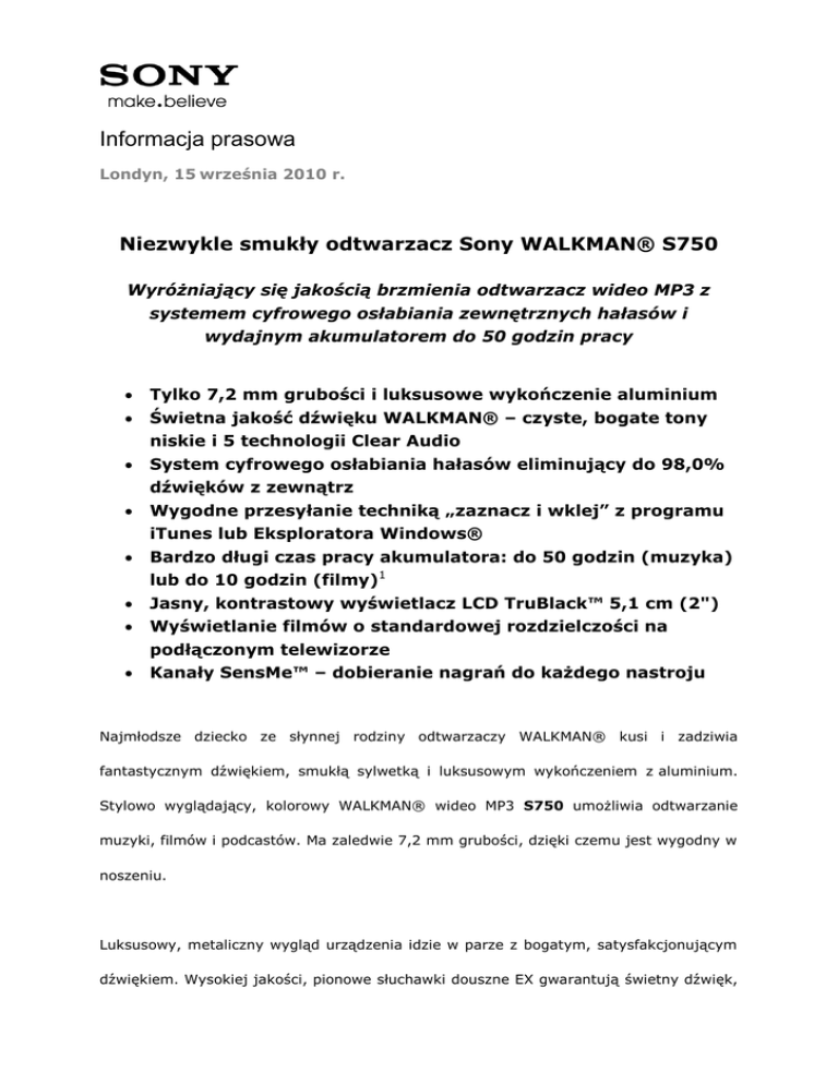 Informacja prasowa Londyn, 15 września 2010 r. Niezwykle smukły odtwarzacz Sony WALKMAN® S750 Wyróżniający się jakością brzmienia odtwarzacz wideo MP3 z systemem cyfrowego osłabiania zewnętrznych hałasów i wydajnym akumulatorem do 50 godzin pracy Tylko 7,2 mm grubości i luksusowe wykończenie aluminium Świetna jakość dźwięku WALKMAN® – czyste, bogate tony niskie i 5 technologii Clear Audio System cyfrowego osłabiania hałasów eliminujący do 98,0% dźwięków z zewnątrz Wygodne przesyłanie techniką „zaznacz i wklej” z programu iTunes lub Eksploratora Windows® Bardzo długi czas pracy akumulatora: do 50 godzin (muzyka) lub do 10 godzin (filmy)1 Jasny, kontrastowy wyświetlacz LCD TruBlack™ 5,1 cm (2") Wyświetlanie filmów o standardowej rozdzielczości na podłączonym telewizorze Kanały SensMe™ – dobieranie nagrań do każdego nastroju Najmłodsze dziecko ze słynnej rodziny odtwarzaczy WALKMAN® kusi i zadziwia fantastycznym dźwiękiem, smukłą sylwetką i luksusowym wykończeniem z aluminium. Stylowo wyglądający, kolorowy WALKMAN® wideo MP3 S750 umożliwia odtwarzanie muzyki, filmów i podcastów. Ma zaledwie 7,2 mm grubości, dzięki czemu jest wygodny w noszeniu. Luksusowy, metaliczny wygląd urządzenia idzie w parze z bogatym, satysfakcjonującym dźwiękiem. Wysokiej jakości, pionowe słuchawki douszne EX gwarantują świetny dźwięk, a cyfrowy system osłabiania hałasów eliminuje do 98% odgłosów z zewnątrz. Dostarczona przejściówka pozwala na podłączenie urządzenia do pokładowego systemu rozrywkowego i korzystanie z zalet cyfrowego systemu osłabiania hałasów WALKMAN® również na pokładzie samolotu. W odtwarzaczu S750 zastosowano szereg firmowych technologii Sony Clear Audio. Pomagają one w pełnym wykorzystaniu posiadanej kolekcji nagrań. Technologie Clear Bass i Clear Stereo uzupełnia system DSEE (Digital Sound Enhancement Engine), który przywraca wysokie częstotliwości zanikające podczas kompresji plików muzycznych. Kolejnym atutem odtwarzacza WALKMAN® S750 jest niezwykła łatwość, z jaką użytkownik może korzystać z posiadanego zbioru nagrań. Dostarczane oprogramowanie Content Transfer upraszcza przesyłanie do odtwarzacza plików muzycznych z Eksploratora Windows® lub biblioteki iTunes (oprócz plików DRM), pozwalając na użycie intuicyjnej techniki „zaznacz i wklej”. System Windows® zatroszczy się nawet o konwersję przechowywanych na twardym dysku plików z filmami DivX® i AVCHD do formatu obsługiwanego przez odtwarzacz. Jasny, wyraźny ekran LCD 5,1 cm (2") znakomicie nadaje się do wyświetlania filmów, zdjęć lub okładek albumów i pozwala na ich oglądanie w szerokim zakresie kątów. Po raz pierwszy w historii rodziny WALKMAN® zastosowany wyświetlacz jest oparty na technologii TruBlack. Technologia ta osłabia niepożądane refleksy światła i tym samym zwiększa kontrast, zarówno w pomieszczeniach jak i w plenerze. Aby spersonalizować odtwarzacz, można wskazać ulubione zdjęcie, które będzie wyświetlane jako tapeta w głównym menu. Do wyboru jest ponadto 9 fabrycznie zaprogramowanych tapet. Chcesz dopasować muzykę do swojego nastroju? Unikatowa technologia Sony SensMe™ przeprowadzi analizę posiadanych nagrań i automatycznie podzieli je na 10 kanałów tematycznych. Później wystarczy po prostu wybrać kanał dostosowany do klimatu chwili, od melancholii do zastrzyku energii. Odtwarzacz WALKMAN® S750 otwiera przed miłośnikami muzyki szereg fascynujących możliwości rozrywkowych. Funkcja Lyrics Sync wyświetla na ekranie tekst odtwarzanego utworu. Tryb Karaoke automatycznie wycisza głos wykonawcy utworu, dzięki czemu użytkownik może wyraźnie usłyszeć swoje własne wykonanie. W razie problemu z zaśpiewaniem najwyższych lub najniższych dźwięków można skorzystać z funkcji transpozycji, która zmieni tonację utworu bez zmiany szybkości odtwarzania. Używając oferowanego oddzielnie przewodu wyjściowego A/V, można nawet podłączyć odtwarzacz do dowolnego telewizora – i zaprosić znajomych na prywatny wieczór karaoke. Odtwarzacz WALKMAN® S750 pomoże w opanowaniu trudnych fraz wszystkim uczącym się języków obcych. Funkcja nauki języka powtarza bowiem w pętli, w zwolnionym tempie wybrany fragment nagrania, bez zmiany wysokości dźwięku i bez szkody dla czystości brzmienia. Nic ciekawego w telewizji? Wobec tego można skorzystać z oferowanego oddzielnie przewodu wyjściowego A/V, podłączyć odtwarzacz S750 do telewizora i oglądać filmy na dużym ekranie, w rozdzielczości 720 x 480. Po naładowaniu akumulator odtwarzacza wystarcza do 50 godzin odtwarzania muzyki lub do 10 godzin odtwarzania filmów1. Odpoczywając w domu, do reprodukcji dźwięku z odtwarzacza można wykorzystać stylowy dok z głośnikami RDP-NWD300, oferowany (opcjonalnie) w dwóch wersjach kolorystycznych, czarnej i białej. Dok zapewnia czysty, pełny dźwięk stereo, ładuje akumulator odtwarzacza i jest dostarczany w komplecie z pilotem. Często podróżującym można z kolei polecić nowy model RDP-NWR100 – nieduży, odporny na zachlapanie wodą dok głośnikami, który wygląda i brzmi świetnie na brzegu basenu, w radosne dni spędzane na powietrzu, a nawet w łazience2. Nowy WALKMAN® S750 jest częścią pełnej gamy odtwarzaczy MP3 i MP4 firmy Sony. Rodzina WALKMAN® obejmuje zaawansowaną, bogatą w funkcje serię A o luksusowym wyglądzie i brzmieniu; zakładaną na głowę serię W dla uprawiających sport; miłą, kolorową serię E oraz prostą w obsłudze serię B. Nowy odtwarzacz wideo MP3 WALKMAN® S750 będzie dostępny na początku listopada br. Najnowsze wiadomości, zdjęcia dotyczące odtwarzaczy WALKMAN® znajdziesz na oficjalnej stronie fanów w serwisie Facebook: www.facebook.com/walkman UWAGI: 1 50 godzin (w przybliżeniu) odtwarzania muzyki z plików MP3 o przepływności 128 kb/s; korektor ustawiony na „None”, wygaszacz e