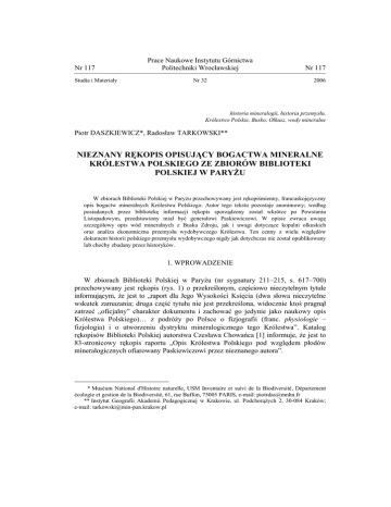 Nr 117 Studia i Materiały Prace Naukowe Instytutu Górnictwa Politechniki Wrocławskiej Nr 32 Nr 117 2006 historia mineralogii, historia przemysłu, Królestwo Polskie, Busko, Olkusz, wody mineralne Piotr DASZKIEWICZ*, Radosław TARKOWSKI** NIEZNANY RĘKOPIS OPISUJĄCY BOGACTWA MINERALNE KRÓLESTWA POLSKIEGO ZE ZBIORÓW BIBLIOTEKI POLSKIEJ W PARYŻU W zbiorach Biblioteki Polskiej w Paryżu przechowywany jest rękopiśmienny, francuskojęzyczny opis bogactw mineralnych Królestwa Polskiego. Autor tego tekstu pozostaje anonimowy; według posiadanych przez bibliotekę informacji rękopis sporządzony został wkrótce po Powstaniu Listopadowym, przedstawiony miał być generałowi Paskiewiczowi. W opisie zwraca uwagę szczegółowy opis wód mineralnych z Buska Zdroju, jak i uwagi dotyczące kopalni olkuskich oraz analiza ekonomiczna przemysłu wydobywczego Królestwa. Ten cenny z wielu względów dokument historii polskiego przemysłu wydobywczego nigdy jak dotychczas nie został opublikowany lub choćby zbadany przez historyków. 1. WPROWADZENIE W zbiorach Biblioteki Polskiej w Paryżu (nr sygnatury 211–215, s. 617–700) przechowywany jest rękopis (rys. 1) o przekreślonym, częściowo nieczytelnym tytule informującym, że jest to „raport dla Jego Wysokości Księcia (dwa słowa nieczytelne wskutek zamazania; druga część tytułu nie jest przekreślona, widocznie ktoś pragnął zatrzeć „oficjalny” charakter dokumentu i zachować go jedynie jako naukowy opis Królestwa Polskiego)… z podróży po Polsce o fizjografii (franc. physiologie – fizjologia) i o utworzeniu dystryktu mineralogicznego tego Królestwa”. Katalog rękopisów Biblioteki Polskiej autorstwa Czesława Chowańca [1] informuje, że jest to 83-stronicowy rękopis raportu „Opis Królestwa Polskiego pod względem płodów mineralogicznych ofiarowany Paskiewiczowi przez nieznanego autora”. * Muséum National d'Histoire naturelle, USM Inventaire et suivi de la Biodiversité, Département écologie et gestion de la Biodiversité, 61, rue Buffon, 75005 PARIS, e-mail: [email protected] ** Instytut Geografii Akademii Pedagogicznej w Krakowie, ul. Podchorążych 2, 30-084 Kraków; e-mail: [email protected] 24 Nie wiadomo gdzie Chowaniec odnalazł informację na temat prezentacji raportu naczelnikowi Królestwa Polskiego albowiem z jego treści nie wynika, że został on przedstawiony Iwanowi Paskiewiczowi (1752–1856). Rys. 1. Strona tytułowa rękopisu Fig. 1. Title page of the manuscript 2. POCHODZENIE RAPORTU Zawarte w raporcie informacje nie pozwalają na określenie dokładnej daty jego powstania. Po zdobyciu Warszawy i stłumieniu Powstania Listopadowego Iwan Paskiewicz nagrodzony został przez cara tytułem księcia warszawskiego oraz 25 stanowiskiem namiestnika Królestwa Polskiego; funkcję tę pełnił do 1856 roku. Raport najprawdopodobniej powstał lub przynajmniej został mu przedstawiony właśnie w tym okresie. Dodatkową wskazówką daty powstania raportu może być to, że jego autor opisując drogę do Buska skarży się na niebezpieczeństwo „wystrzałów”, które „Polacy często oddawali”. Swoją podróż odbywał zatem najprawdopodobniej gdy w Polsce dogasało Powstanie Listopadowe. Niewiele można powiedzieć na temat autora raportu. Jeżeli podróżował w okresie gdy trwały jeszcze powstańcze walki to być może był rosyjskim oficerem, któremu powierzono misję opisania pokonanego kraju lub inżynierem pracującym dla carskiej armii? Z treści rękopisu wynika, że nie był on Polakiem. Rękopis napisany jest po francusku. Jednakże w pierwszej połowie dziewiętnastego wieku język ten był jeszcze „lingua franca” europejskiej nauki. Francuski był także powszechnie znany i używany przez rosyjską arystokrację. Autor władał francuskim doskonale, jednakże niektóre z błędów i sformułowań wskazują, że nie był on Francuzem. Nie wiadomo także czy raport ten powstał na zlecenie rosyjskiej administracji pragnącej poznać przemysł i bogactwa naturalne, niedawno przecież podbitej przez Rosjan, Polski, czy też był on inicjatywą autora liczącego na carskie wynagrodzenie (medal?). O autorze możemy na podstawie treści raportu jedynie powiedzieć, że posiadał solidne wykształcenie inżynieryjno-techniczne, być może mechaniczne, sądząc po bardzo szczegółowych opisach maszyn fabryk Królestwa. Wiadomo także, że część swojego technicznego wykształcenia zdobył w Anglii, jak wynika nie tylko ze stosunkowo częstych cytowań angielskich autorów, ale i ze wspomnień z wizyt w brytyjskich fabrykach. Niewątpliwie nie posiadał on wykształcenia przyrodniczego. Nie znał ponadto nawet podstawowych prac z zakresu interesującej go tematyki i to zarówno polskich jak choćby „O ziemiorództwie…” Stanisława Staszica, jak i prac francuskich dotyczących mineralogii i geologii Polski, jak choćby prac Jean-Etienne Guettarda. Anonimowy autor rozpoczyna nawet swój tekst informacją, że fizjografia Polski jest mało poznana, że konieczne jest przeprowadzenie kolejnych podróży i badań aby zmienić ten stan rzeczy. Jednakże stwierdzenie to bardziej charakteryzuje przecież jego stan wiedzy czy raczej ignorancji licznych już wówczas źródeł naukowych niż faktyczny stan rzeczy. Brak jest jakiekolwiek informacji kiedy i w jaki sposób dokument ten trafił do zbiorów Biblioteki Polskiej. Biblioteka posiada dużą kolekcję rożnego rodzaju dokumentów rosyjskiej administracji, dotyczących Polski, zgromadzonych w pierwszym, bezpośrednio popowstaniowym okresie gdy emigracyjni politycy i działacze Hotelu Lambert starali się zebrać jak najkompletniejszą dokumentację dotyczącą historii Polski jak i rosyjskiej polityki, także gospodarczej prowadzonej przez carską administrację na ziemiach dawnej Rzeczpospolitej. Raport znajduje się w zbiorze „Miscellana geograficzne” wraz z różnymi polonikami geograficznymi. Dokumenty zgromadzone w