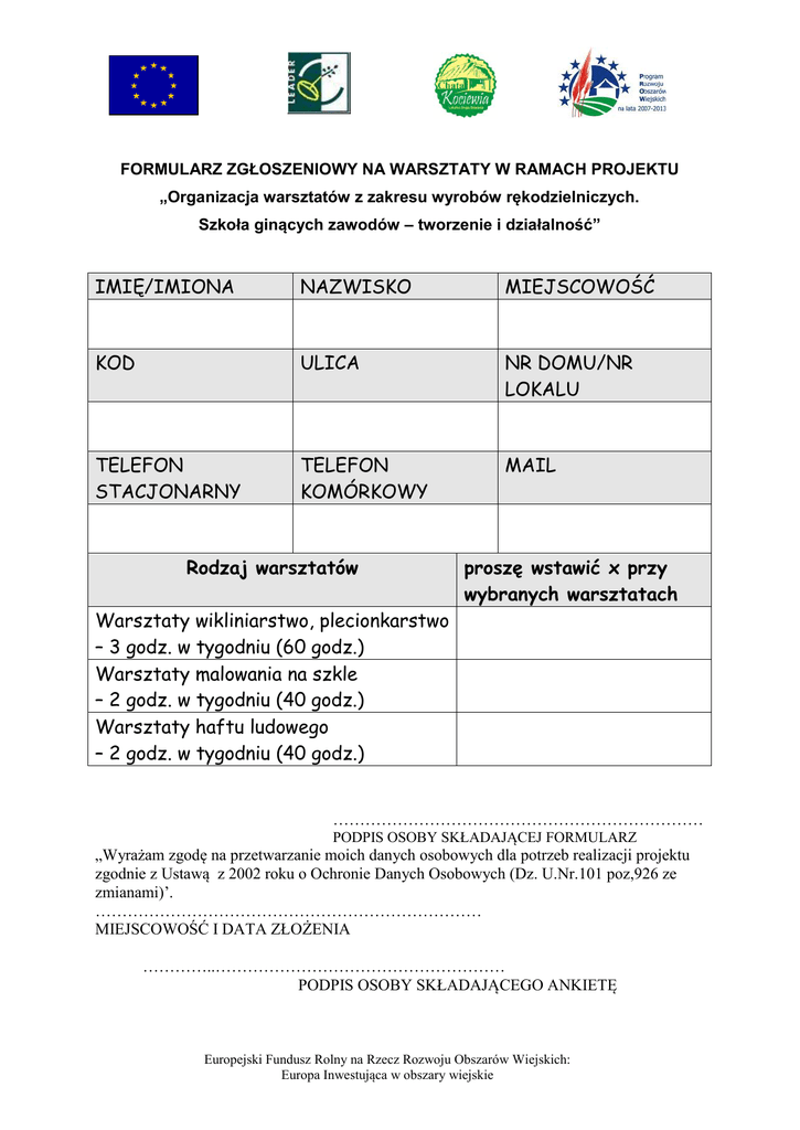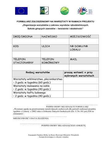 FORMULARZ ZGŁOSZENIOWY NA WARSZTATY W RAMACH PROJEKTU „Organizacja warsztatów z zakresu wyrobów rękodzielniczych. Szkoła ginących zawodów – tworzenie i działalność” IMIĘ/IMIONA NAZWISKO MIEJSCOWOŚĆ KOD ULICA NR DOMU/NR LOKALU TELEFON STACJONARNY TELEFON KOMÓRKOWY MAIL Rodzaj warsztatów proszę wstawić x przy wybranych warsztatach Warsztaty wikliniarstwo, plecionkarstwo – 3 godz. w tygodniu (60 godz.) Warsztaty malowania na szkle – 2 godz. w tygodniu (40 godz.) Warsztaty haftu ludowego – 2 godz. w tygodniu (40 godz.) …………………………………………………………… PODPIS OSOBY SKŁADAJĄCEJ FORMULARZ „Wyrażam zgodę na przetwarzanie moich danych osobowych dla potrzeb realizacji projektu zgodnie z Ustawą z 2002 roku o Ochronie Danych Osobowych (Dz. U.Nr.101 poz,926 ze zmianami)’. ……………………………………………………………… MIEJSCOWOŚĆ I DATA ZŁOŻENIA …………..……………………………………………… PODPIS OSOBY SKŁADAJĄCEGO ANKIETĘ Europejski Fundusz Rolny na Rzecz Rozwoju Obszarów Wiejskich: Europa Inwestująca w obszary wiejskie