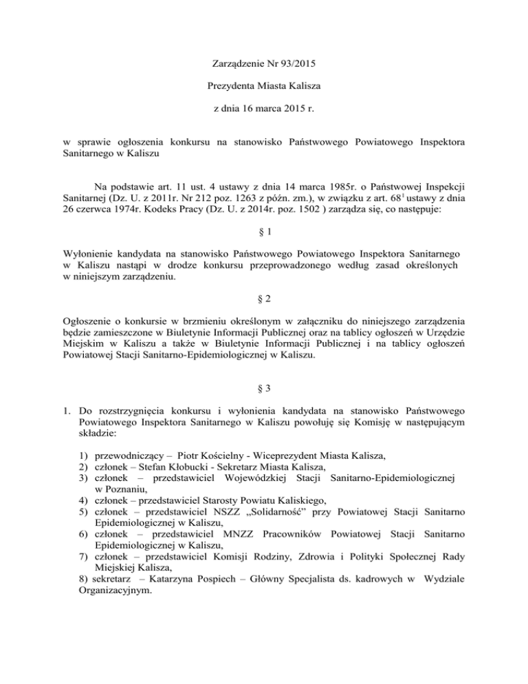 Zarządzenie Nr 93/2015 Prezydenta Miasta Kalisza z dnia 16 marca 2015 r. w sprawie ogłoszenia konkursu na stanowisko Państwowego Powiatowego Inspektora Sanitarnego w Kaliszu Na podstawie art. 11 ust. 4 ustawy z dnia 14 marca 1985r. o Państwowej Inspekcji Sanitarnej (Dz. U. z 2011r. Nr 212 poz. 1263 z późn. zm.), w związku z art. 68 1 ustawy z dnia 26 czerwca 1974r. Kodeks Pracy (Dz. U. z 2014r. poz. 1502 ) zarządza się, co następuje: §1 Wyłonienie kandydata na stanowisko Państwowego Powiatowego Inspektora Sanitarnego w Kaliszu nastąpi w drodze konkursu przeprowadzonego według zasad określonych w niniejszym zarządzeniu. §2 Ogłoszenie o konkursie w brzmieniu określonym w załączniku do niniejszego zarządzenia będzie zamieszczone w Biuletynie Informacji Publicznej oraz na tablicy ogłoszeń w Urzędzie Miejskim w Kaliszu a także w Biuletynie Informacji Publicznej i na tablicy ogłoszeń Powiatowej Stacji Sanitarno-Epidemiologicznej w Kaliszu. §3 1. Do rozstrzygnięcia konkursu i wyłonienia kandydata na stanowisko Państwowego Powiatowego Inspektora Sanitarnego w Kaliszu powołuję się Komisję w następującym składzie: 1) przewodniczący – Piotr Kościelny - Wiceprezydent Miasta Kalisza, 2) członek – Stefan Kłobucki - Sekretarz Miasta Kalisza, 3) członek – przedstawiciel Wojewódzkiej Stacji Sanitarno-Epidemiologicznej w Poznaniu, 4) członek – przedstawiciel Starosty Powiatu Kaliskiego, 5) członek – przedstawiciel NSZZ „Solidarność” przy Powiatowej Stacji Sanitarno Epidemiologicznej w Kaliszu, 6) członek – przedstawiciel MNZZ Pracowników Powiatowej Stacji Sanitarno Epidemiologicznej w Kaliszu, 7) członek – przedstawiciel Komisji Rodziny, Zdrowia i Polityki Społecznej Rady Miejskiej Kalisza, 8) sekretarz – Katarzyna Pospiech – Główny Specjalista ds. kadrowych w Wydziale Organizacyjnym. 2. Do zadań Komisji należy: 1) stwierdzenie spełnienia przez kandydatów wymogów formalnych określonych w ogłoszeniu o konkursie. 2) przeprowadzenie konkursu i wyłonienie kandydata na Państwowego Powiatowego Inspektora Sanitarnego w Kaliszu. 3. Ustala się następujące zasady postępowania konkursowego: 1) postępowaniem konkursowym kieruje Przewodniczący Komisji, 2) komisja w I etapie dokonuje oceny złożonych ofert pod względem spełnienia przez kandydatów wymagań formalnych określonych w ogłoszeniu i kwalifikuje kandydatów do dalszego etapu, 3) w II etapie postępowania Komisja przeprowadza rozmowy kwalifikacyjne z kandydatami, oceniając przedstawioną koncepcję pracy na stanowisku Państwowego Powiatowego Inspektora Sanitarnego w Kaliszu, 4) wyniki konkursu Komisja ustala w głosowaniu jawnym zwykłą większością głosów uzasadniając dokonany wybór, 5) protokół z przeprowadzonego postępowania konkursowego podpisują wszyscy członkowie Komisji, 6) Przewodniczący Komisji przekazuje niezwłocznie Prezydentowi Miasta Kalisza wyniki przeprowadzonego konkursu. 4. Konkurs należy przeprowadzić również w przypadku zgłoszenia się jednego kandydata. 5. Komisja rozwiązuje się z dniem wyłonienia kandydata na stanowisko objęte konkursem. 6. W kwestiach nie uregulowanych niniejszym zarządzeniem decyduje Komisja. §4 Wykonanie zarządzenia powierza się Sekretarzowi Miasta Kalisza w zakresie ogłoszenia konkursu oraz Przewodniczącemu Komisji konkursowej w pozostałym zakresie. §5 Zarządzenie podlega publikacji w Biuletynie Informacji Publicznej. §6 Zarządzenie wchodzi w życie z dniem podpisania. Prezydent Miasta Kalisza /…/ Grzegorz Sapiński Załącznik do Zarządzenia Nr 93/2015 Prezydenta Miasta Kalisza z dnia 16 marca 2015 r. Prezydent Miasta Kalisza ogłasza konkurs na wolne stanowisko Państwowego Powiatowego Inspektora Sanitarnego w Kaliszu Powiatowa Stacja Sanitarno-Epidemiologiczna w Kaliszu ul. Tadeusza Kościuszki 6, 62-800 Kalisz Wymagania związane ze stanowiskiem: 1) niezbędne: obywatelstwo polskie, pełna zdolność do czynności prawnych oraz korzystanie z pełni praw publicznych, posiadanie następujących kwalifikacji: a) jest lekarzem i posiada specjalizację wskazaną w rozporządzeniu Ministra Zdrowia z dnia 11 czerwca 2010 r. w sprawie wykazu specjalizacji w dziedzinach medycyny mających zastosowanie w realizacji zadań Państwowej Inspekcji Sanitarnej, b) posiada tytuł magistra i dodatkowe kwalifikacje mające zastosowanie w realizacji zadań Państwowej Inspekcji Sanitarnej określone w rozporządzeniu Ministra Zdrowia z dnia 27 maja 2010r. w sprawie wykazu dodatkowych kwalifikacji, jakie musi posiadać państwowy inspektor sanitarny posiadający tytuł zawodowy magistra, postawa obywatelska dająca rękojmie należytego wykonywania zadań pracownika organu państwowego, brak skazania prawomocnym wyrokiem sądu za umyślne przestępstwa ścigane z oskarżenia publicznego lub umyślne przestępstwa skarbowe, brak kary zakazu pełnienia funkcji związanych z dysponowaniem środkami publicznymi, stan zdrowia pozwalający na zatrudnienie na stanowisku Państwowego Powiatowego Inspektora Sanitarnego, 2) dodatkowe: 5-letni staż pracy, doświadczenie zawodowe na stanowisku kierowniczym, studia podyplomowe w zakresie zarządzania, umiejętność organizacji pracy i zarządzania zasobami ludzkimi, odporność na stres, kreatywność, sumienność, umiejętność zarządzania finansami, znajomość przepisów prawnych dotyczących: działania Państwowej Inspekcji Sanitarnej, organizacji pracy stacji sanitarno-epidemiologicznej, finansów publicznych, samorządu powiatowego, prawa zamówień publicznych oraz kodeksu postępowania administracyjnego, Zakres zadań wykonywanych na stanowisku: Do głównych zadań Państwowego Powiatowego Inspektora Sanitarnego w Kaliszu będzie należało wykonywanie obowiązków wynikających z ustawy z dnia 14 marca 1985r. o Państwowej Inspekcji Sanitarnej oraz pełnienie funkcji Dyrektora Powiatowej Stacji Sanitarno-Epidemiologicznej w Kaliszu. Statut Powiato
