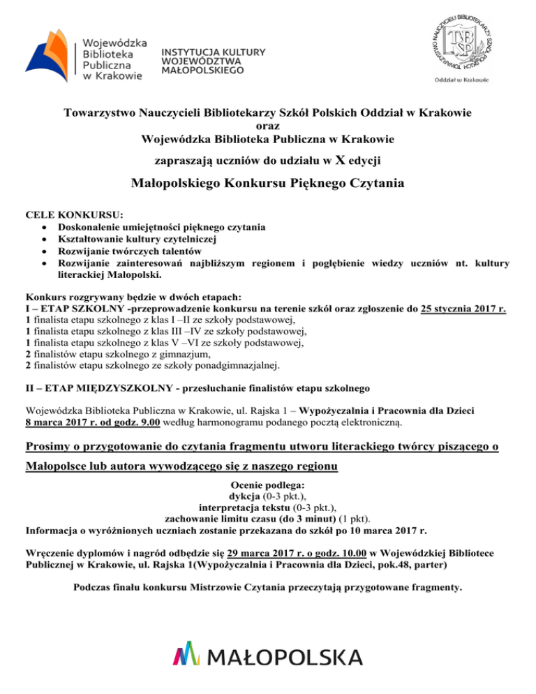 Towarzystwo Nauczycieli Bibliotekarzy Szkół Polskich Oddział w Krakowie oraz Wojewódzka Biblioteka Publiczna w Krakowie zapraszają uczniów do udziału w X edycji Małopolskiego Konkursu Pięknego Czytania CELE KONKURSU: Doskonalenie umiejętności pięknego czytania Kształtowanie kultury czytelniczej Rozwijanie twórczych talentów Rozwijanie zainteresowań najbliższym regionem i pogłębienie wiedzy uczniów nt. kultury literackiej Małopolski. Konkurs rozgrywany będzie w dwóch etapach: I – ETAP SZKOLNY -przeprowadzenie konkursu na terenie szkół oraz zgłoszenie do 25 stycznia 2017 r. 1 finalista etapu szkolnego z klas I –II ze szkoły podstawowej, 1 finalista etapu szkolnego z klas III –IV ze szkoły podstawowej, 1 finalista etapu szkolnego z klas V –VI ze szkoły podstawowej, 2 finalistów etapu szkolnego z gimnazjum, 2 finalistów etapu szkolnego ze szkoły ponadgimnazjalnej. II – ETAP MIĘDZYSZKOLNY - przesłuchanie finalistów etapu szkolnego Wojewódzka Biblioteka Publiczna w Krakowie, ul. Rajska 1 – Wypożyczalnia i Pracownia dla Dzieci 8 marca 2017 r. od godz. 9.00 według harmonogramu podanego pocztą elektroniczną. Prosimy o przygotowanie do czytania fragmentu utworu literackiego twórcy piszącego o Małopolsce lub autora wywodzącego się z naszego regionu Ocenie podlega: dykcja (0-3 pkt.), interpretacja tekstu (0-3 pkt.), zachowanie limitu czasu (do 3 minut) (1 pkt). Informacja o wyróżnionych uczniach zostanie przekazana do szkół po 10 marca 2017 r. Wręczenie dyplomów i nagród odbędzie się 29 marca 2017 r. o godz. 10.00 w Wojewódzkiej Bibliotece Publicznej w Krakowie, ul. Rajska 1(Wypożyczalnia i Pracownia dla Dzieci, pok.48, parter) Podczas finału konkursu Mistrzowie Czytania przeczytają przygotowane fragmenty. ZGŁOSZENIA MOŻNA PRZEKAZYWAĆ WYŁĄCZNIE POPRZEZ ZGŁOSZENIOWY DOSTĘPNY NA STRONIE http://www.tnbsp.malopolska.pl/ w dniach od 9 stycznia 2017 r. do 25 stycznia 2017 r. FORMULARZ Należy wypełnić wszystkie pola w formularzu zgłoszeniowym. Będą potrzebne m.in. następujące informacje: imię, nazwisko ucznia, klasa, szkoła autor i tytuł wybranej książki imię, nazwisko opiekuna, data eliminacji szkolnych i ilość uczestników, aktualny e-mail do opiekuna (szkoły), na który będą przesłane informacje o godzinie przesłuchania finalistów etapu szkolnego. Ewentualną zmianę nazwiska finalisty można zmienić wyłącznie do 25 stycznia 2017 r. Adres do kontaktu: [email protected] Zapraszamy do udziału w konkursie! Na etap międzyszkolny należy przynieść podpisane oświadczenie rodziców (opiekunów prawnych) zgodnie z załączonym poniżej wzorem. Oświadczenie jest niezbędne, aby uczeń mógł uczestniczyć w konkursie. Oświadczenie Imię dziecka:……………………………………… Nazwisko dziecka:………………………………… Numer telefonu kontaktowego do rodziców/opiekunów………………………………… Wyrażam zgodę na uczestnictwo mojego dziecka w Małopolskim Konkursie Pięknego Czytania organizowanym przez Towarzystwo Nauczycieli Bibliotekarzy Szkół Polskich - Oddział w Krakowie i Wojewódzką Bibliotekę Publiczną w Krakowie. Oświadczam, że zapoznałem się z Regulaminem konkursu i w pełni akceptuję jego warunki. Jednocześnie oświadczam, że zostałem poinformowany o tym, że: 1. Administratorem danych osobowych konkursu jest: Towarzystwo Nauczycieli Bibliotekarzy Szkół Polskich Oddział w Krakowie z siedzibą I Liceum Ogólnokształcące, Plac na Groblach 9, 31-101 Kraków. TNBSP – Oddział w Krakowie udostępnia na podstawie umowy powierzenia Wojewódzkiej Bibliotece Publicznej w Krakowie z siedzibą ul. Rajska 1, 31-124 Kraków, współorganizatorowi konkursu, dane osobowe laureatów na potrzeby związane z konkursem. 2. Podanie danych jest dobrowolne. Nie przewiduje się przekazywania danych za wyjątkiem, o którym mowa powyżej. 3. Przysługuje mi prawo do wglądu do danych mojego dziecka i żądania ich poprawienia. Jednocześnie oświadczam, że wyrażam zgodę na udzielenie Organizatorom nieodpłatnej, bezterminowej i nieograniczonej terytorialnie licencji na umieszczenie pracy konkursowej na stronach internetowych Organizatorów, powielanie pracy każdą dostępną techniką i na wykorzystanie jej na wszystkich polach eksploatacji wymienionych w art. 50 ustawy Prawo autorskie i prawa pokrewne, w szczególności w materiałach promocyjnych i edukacyjnych związanych z Konkursem oraz w innych publikacjach związanych z działalnością Organizatorów. Udzielana licencja obejmuje prawo do wykonywania zależnego prawa autorskiego. Z chwilą dostarczenia pracy konkursowej do Organizatorów Konkursu WBP w Krakowie i TNBSP – Oddział w Krakowie, mają prawo własności do przysłanych materiałów. Jednocześnie wyrażam zgodę na przetwarzanie przez Organizatorów konkursu danych osobowych ....................................................................................................................................................(imię i nazwisko autora pracy konkursowej) zgodnie z ustawą z 29 sierpnia 1997 r. o ochronie danych osobowych (t.j. Dz. U. z 2014 r. Nr 1182, poz. 1662)., na potrzeby organizacji i promocji Konkursu. Jednocześnie wyrażam zgodę na opublikowanie wizerunku mojego dziecka w publikacjach Organizatorów, na stronach internetowych www.rajska.info, www.tnbsp.malopolska.pl i mediach. ………………….……………………………........ Data i podpis rodzica lub opiekuna prawnego